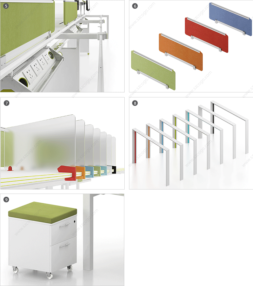 | 1、桌面屏风,多种选择:板材、玻璃、亚克力、吸音板、多功能挂槽。 | 2、超人性化设计,多功能挂件,收纳无处不在。 |