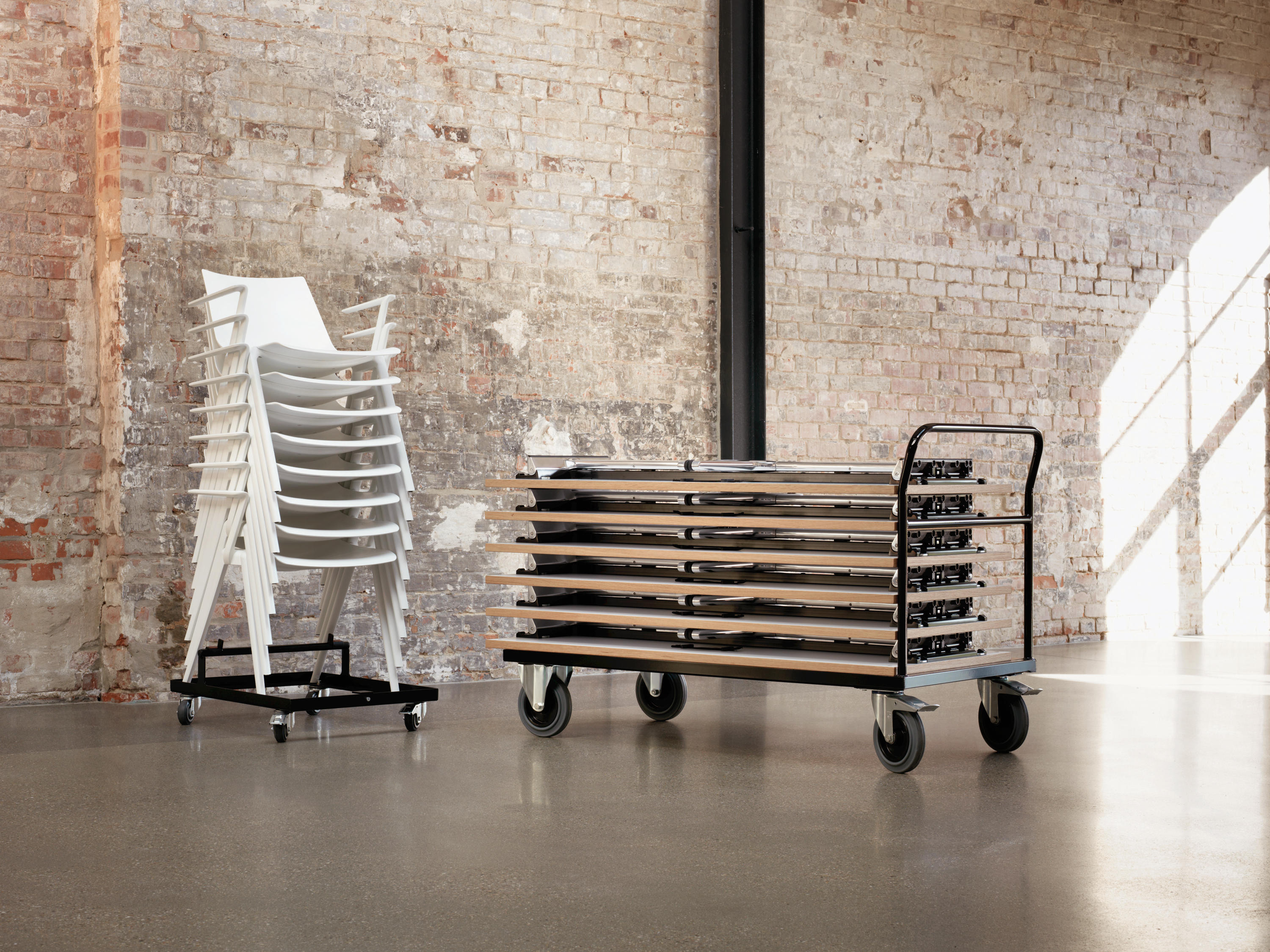 折叠桌的设计是为了给储存空间提供灵活的解决方案。在处理储存方面上,其设计的品种和质量对设备管理成本的影响受到了用户的赞赏。这就是mAx迷人的地方。设计精巧的折叠桌可以被紧凑的堆放,而且只需要一只手就能进行折叠。时尚的T型脚的材料和工艺保证了桌子的坚固耐用。