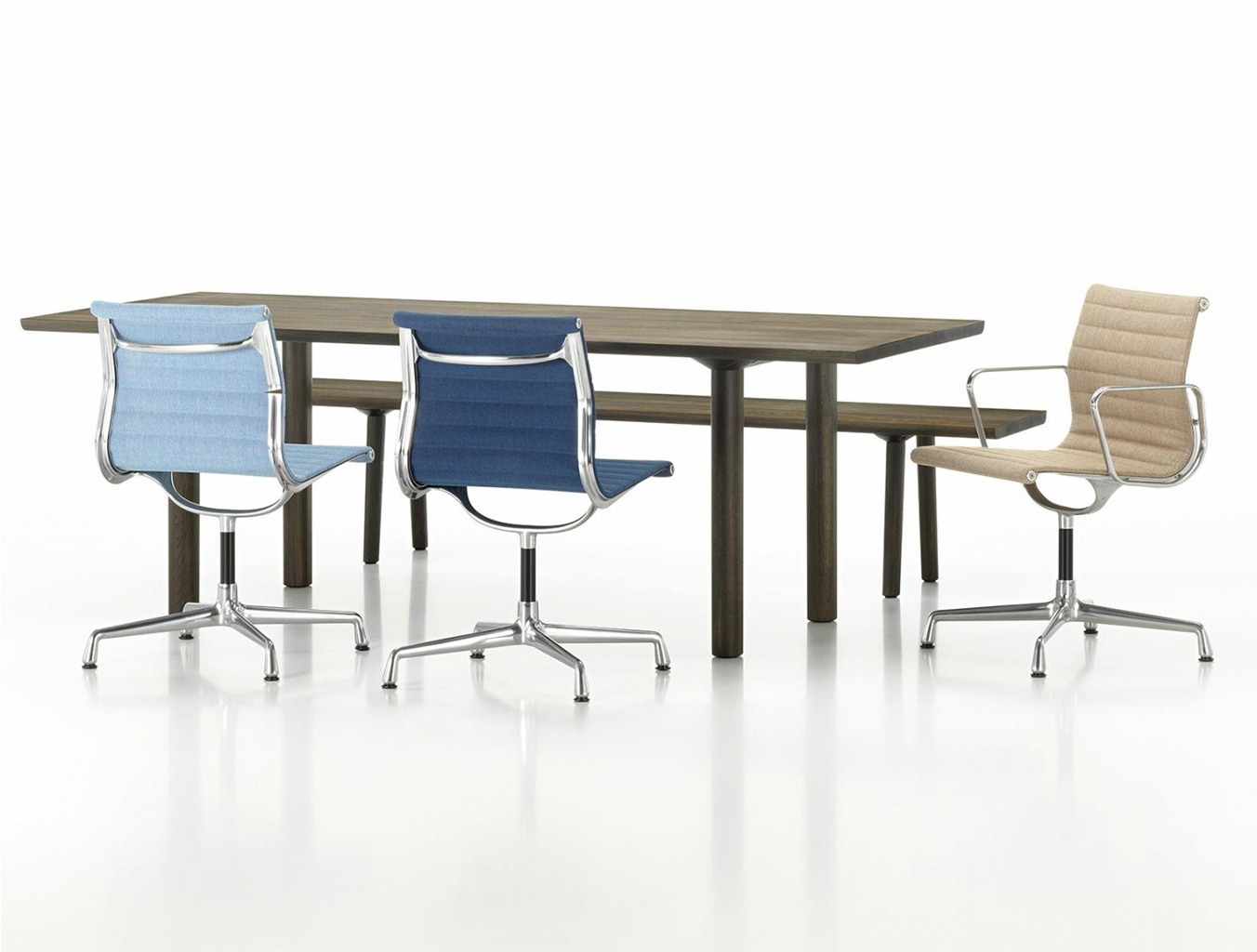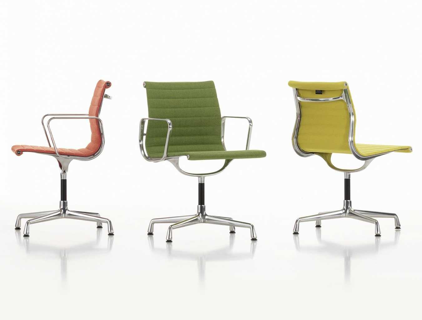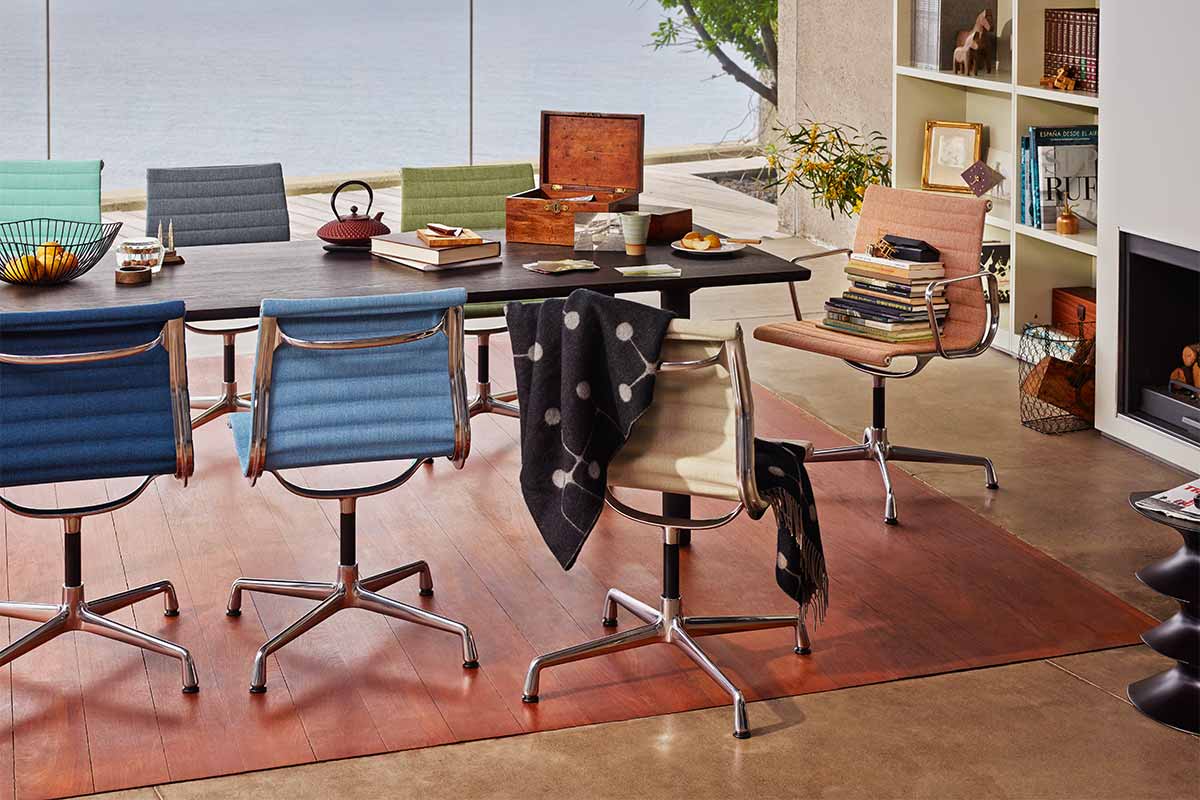 Charles和Ray Eames的铝椅EA 101,EA 103和EA 104非常适合与桌子组合使用:与铝组的其他型号相比,它们更轻,更高,更窄。 由于室内装潢具有多种柔和鲜艳的色彩,因此很容易找到适合任何餐厅的完美椅子。 这三种型号的不同之处在于基座的类型 - 固定或旋转 - 以及是否存在臂。