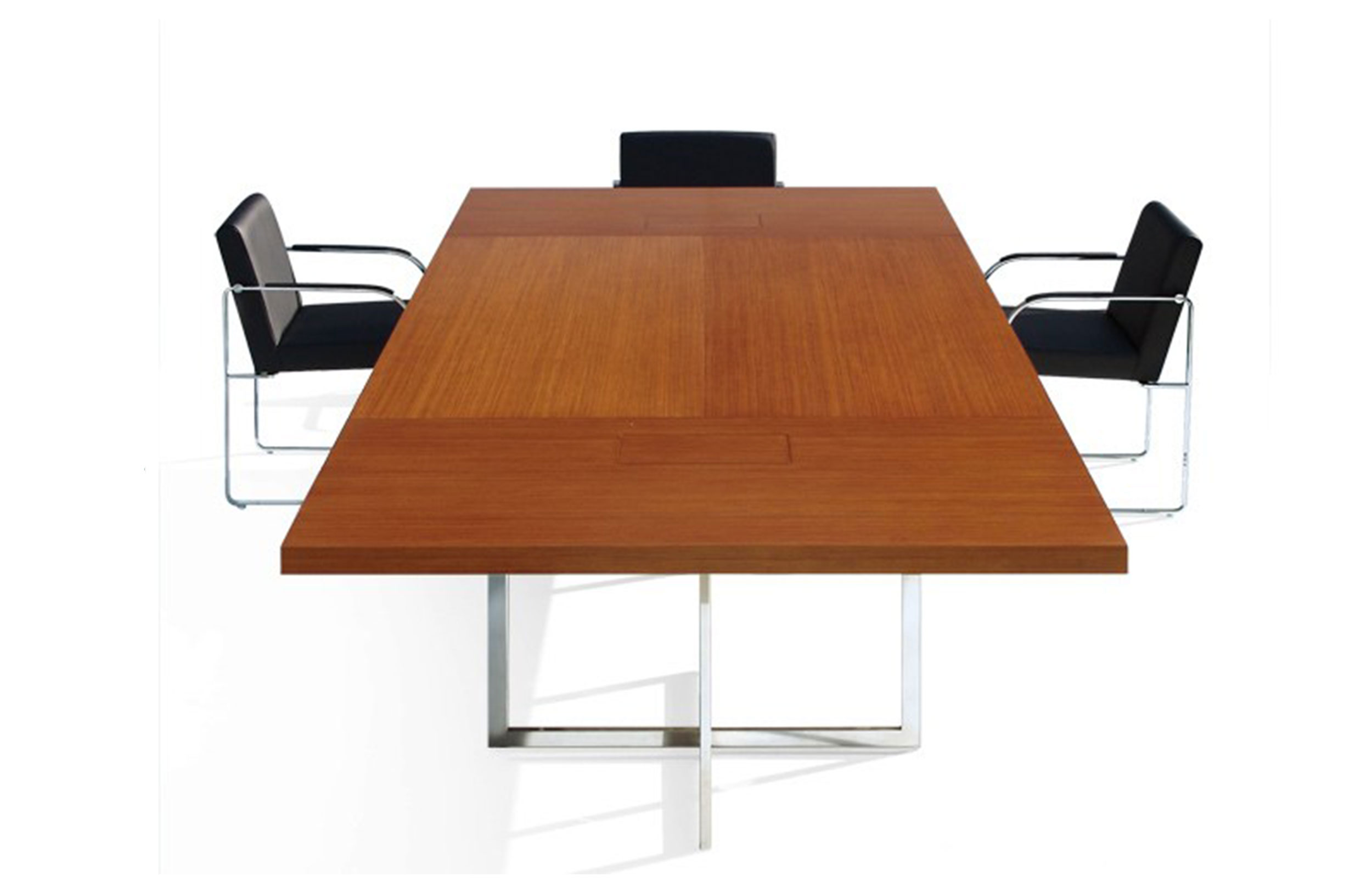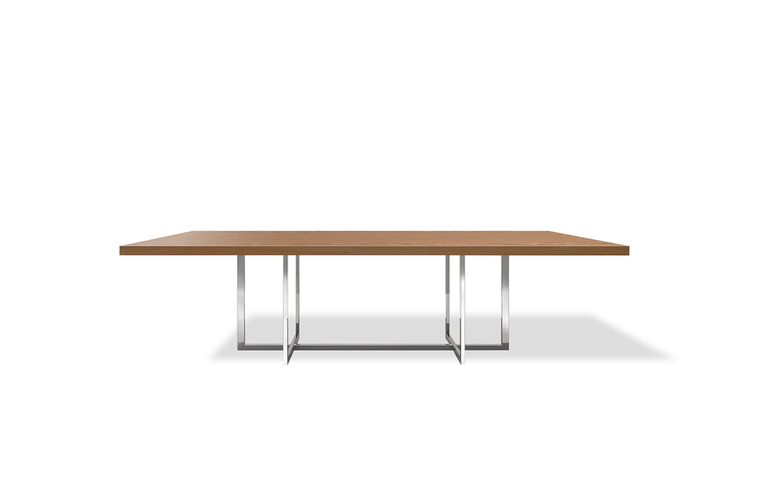会议桌。50mm厚的一体式矩形顶部。抛光不锈钢结构底座。表面处理:木质饰面或微纹理漆面。金属底座采用抛光不锈钢制成。