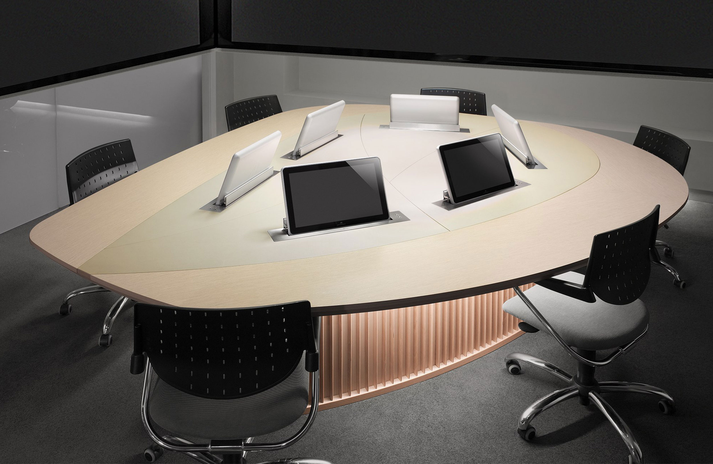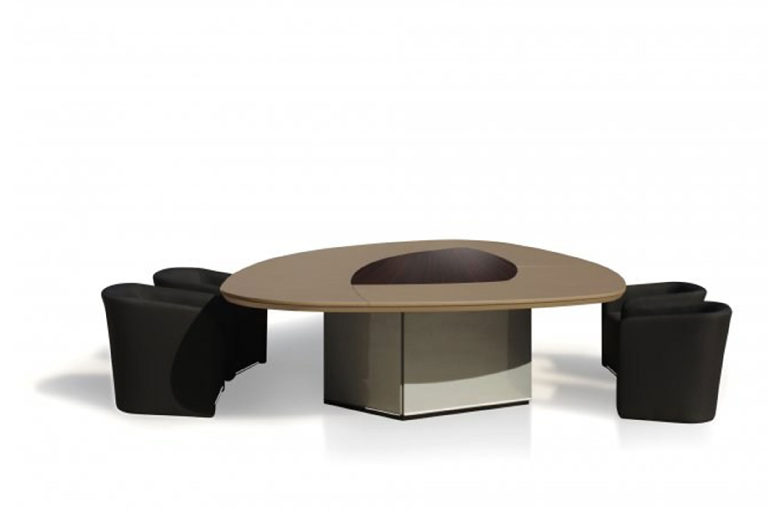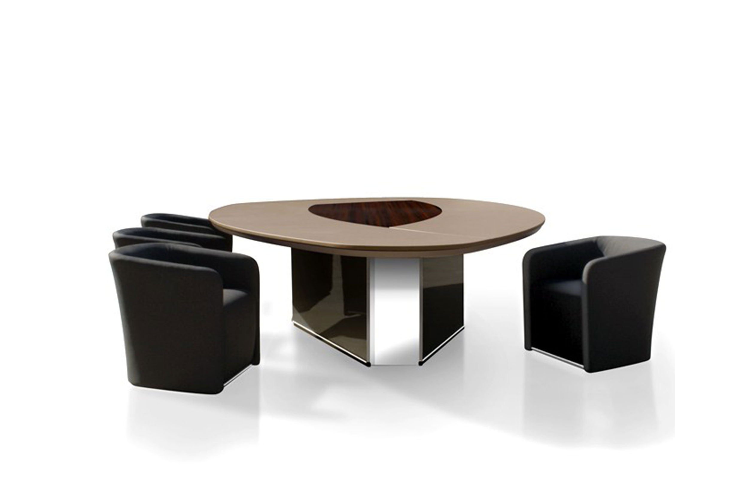 会议桌。有机杏仁形顶部。顶部分为两个区域:中心和周边,允许不同材料和饰面的组合。50mm厚的顶部由两部分组成:盖子和45o斜面底盖。办公桌专门设计用于集成可伸缩电脑显示器,电缆管理和电子系统的其他部分。底座由隐藏的金属结构组成,封闭有可拆卸的面板,可以方便地进入桌子内部,以便进行电缆管理和维护。表面处理:混合成品顶部采用木材,微纹理漆或Techno Leather软垫。以漆面为基础。