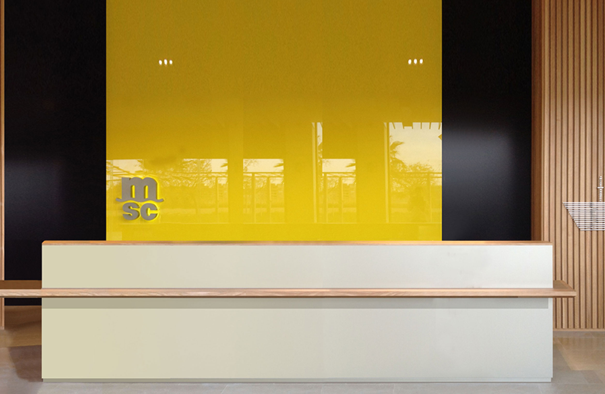前台。上部区域作为一个利基关闭,创造了私人工作空间。外侧搁板,一侧有突出的悬垂。完成:前板,ALUCOBOND。桌面和架子,天然木材饰面。咨询其他尺寸或形状。