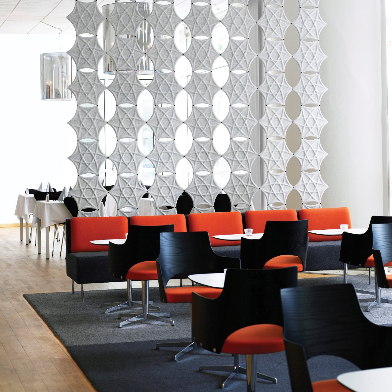 Aiflake / Airflake XL是一种基于六边形的模块化系统,可以自由组合以形成悬挂式隔断。Airflake散发出令人不快的声音反射,非常适合拥有大型开放区域的房间。Airflake由模制纤维毡制成。模块可以与塑料夹连接以产生不同类型的图案形成。使用直的或弯曲的白色或银色阳极氧化铝导轨,电线或假天花板固定在天花板或墙壁上