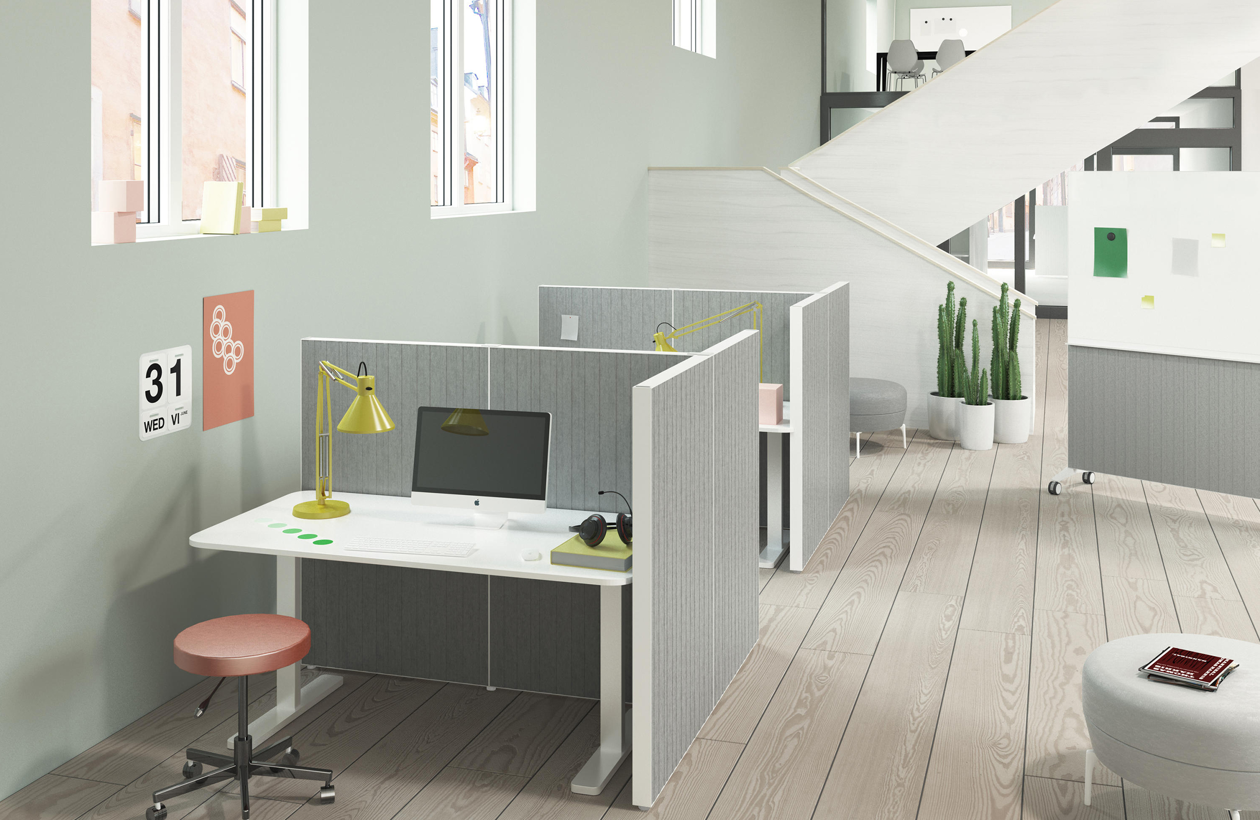 Nina Jobs设计了Alumi Combi和Alumi Combi Light,旨在鼓励同事随心所欲地召开会议。屏幕既可作为吸音器,也可作为书写板,安装在轮子上,便于携带。多功能书写板与Alumi系列中的其他吸音屏幕具有相同的低调外观,使它们能够和谐统一。