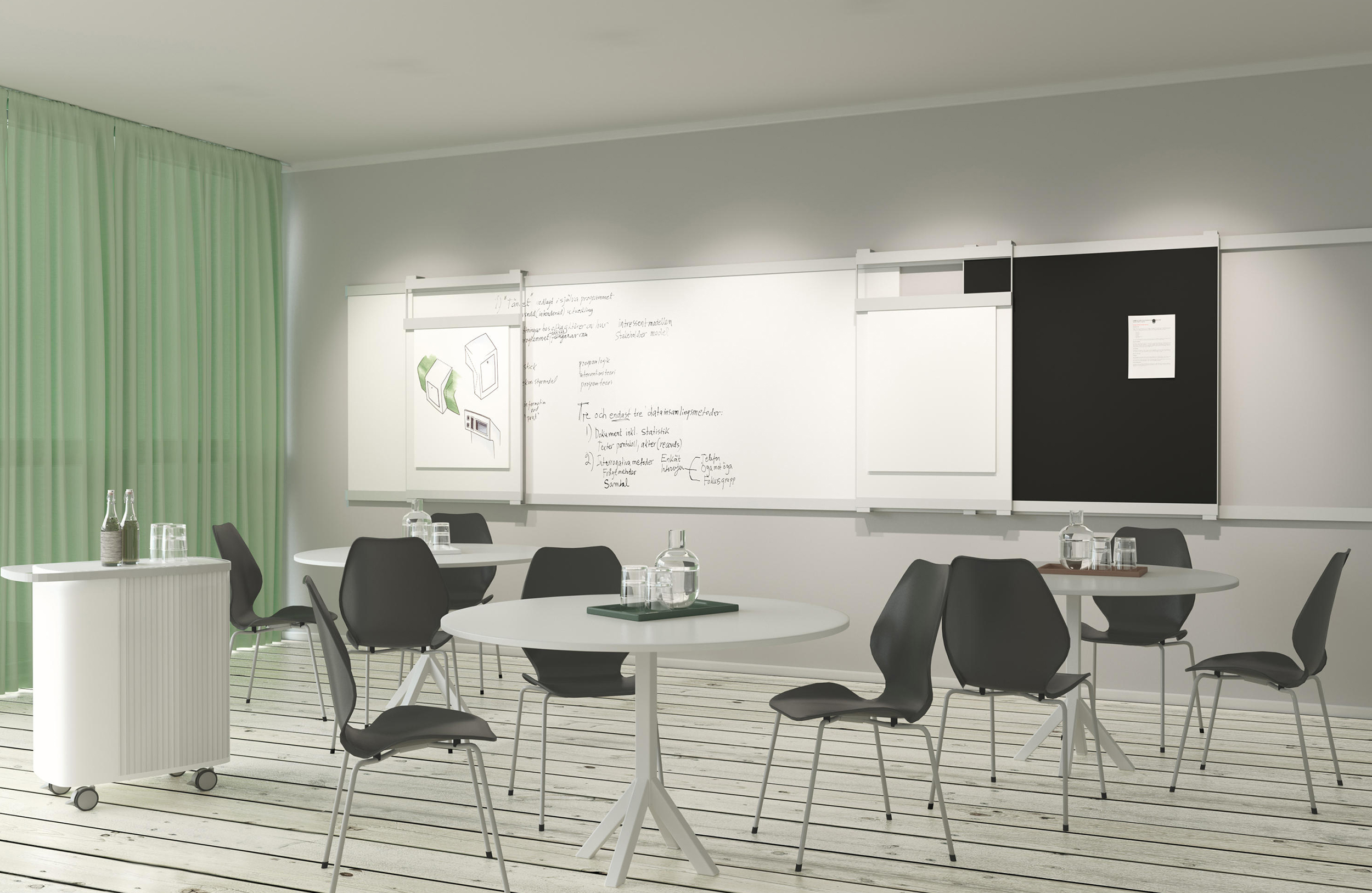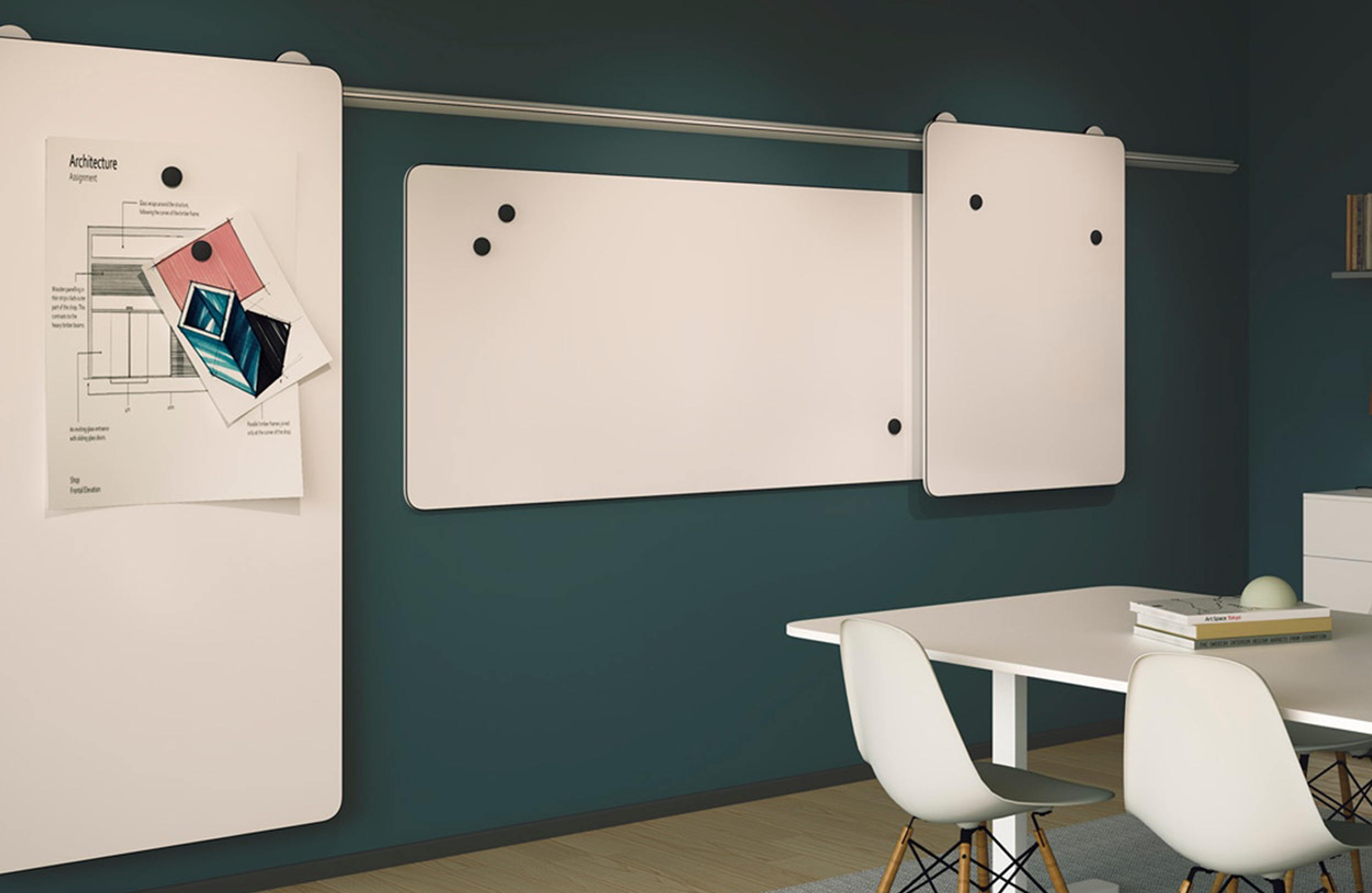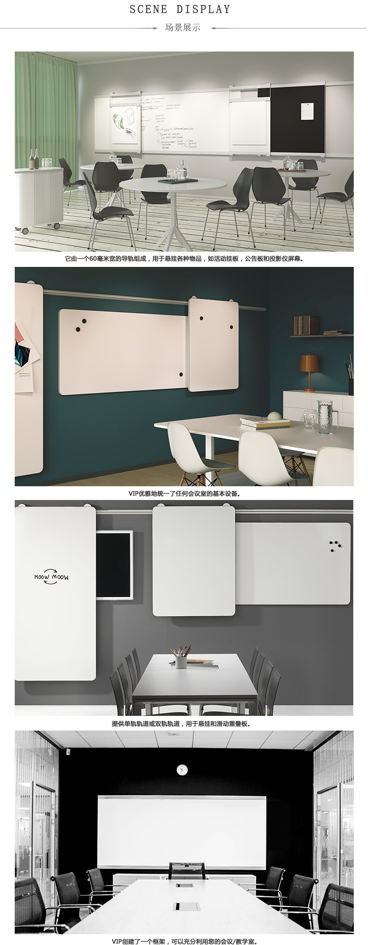 VIP创建了一个框架,可以充分利用您的会议/教学室。60毫米宽的铝型材创造了一个独特的,不间断的水平线,使板保持在适当的位置。可以根据需要沿着轨道移动板。VIP是一个灵活,优雅的系统。VIP书写板系统包括可在轨道上横向移动的柔性书写板和活动挂板。墙轨由银阳极氧化铝制成,顶部有单轨或双轨。订购长括号以使某些电路板重叠。还有一个壁挂式书写板。白板具有E3书写表面和特有的银色阳极氧化框架。