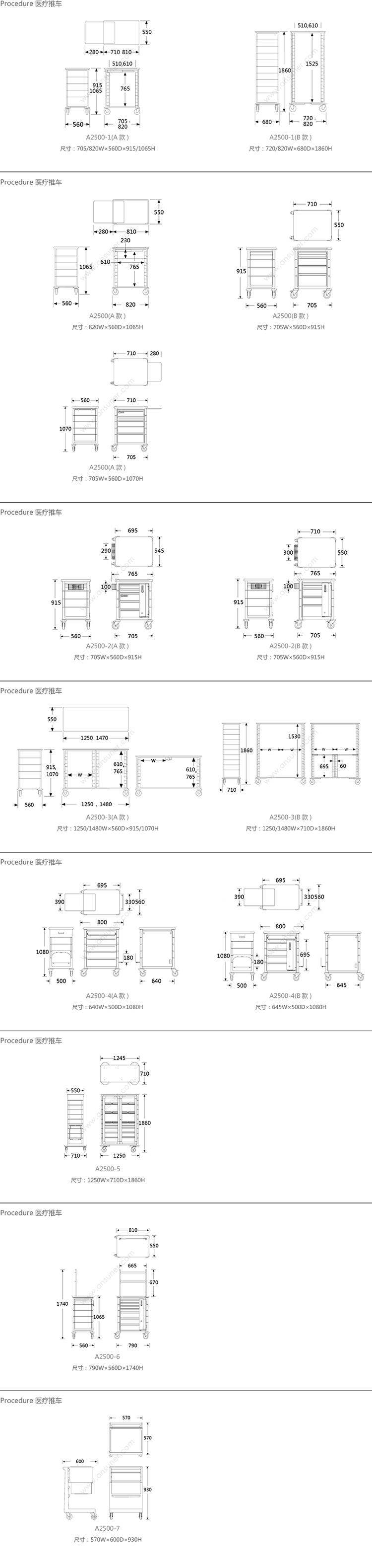 Procedure 医疗推车 系列尺寸/示意图