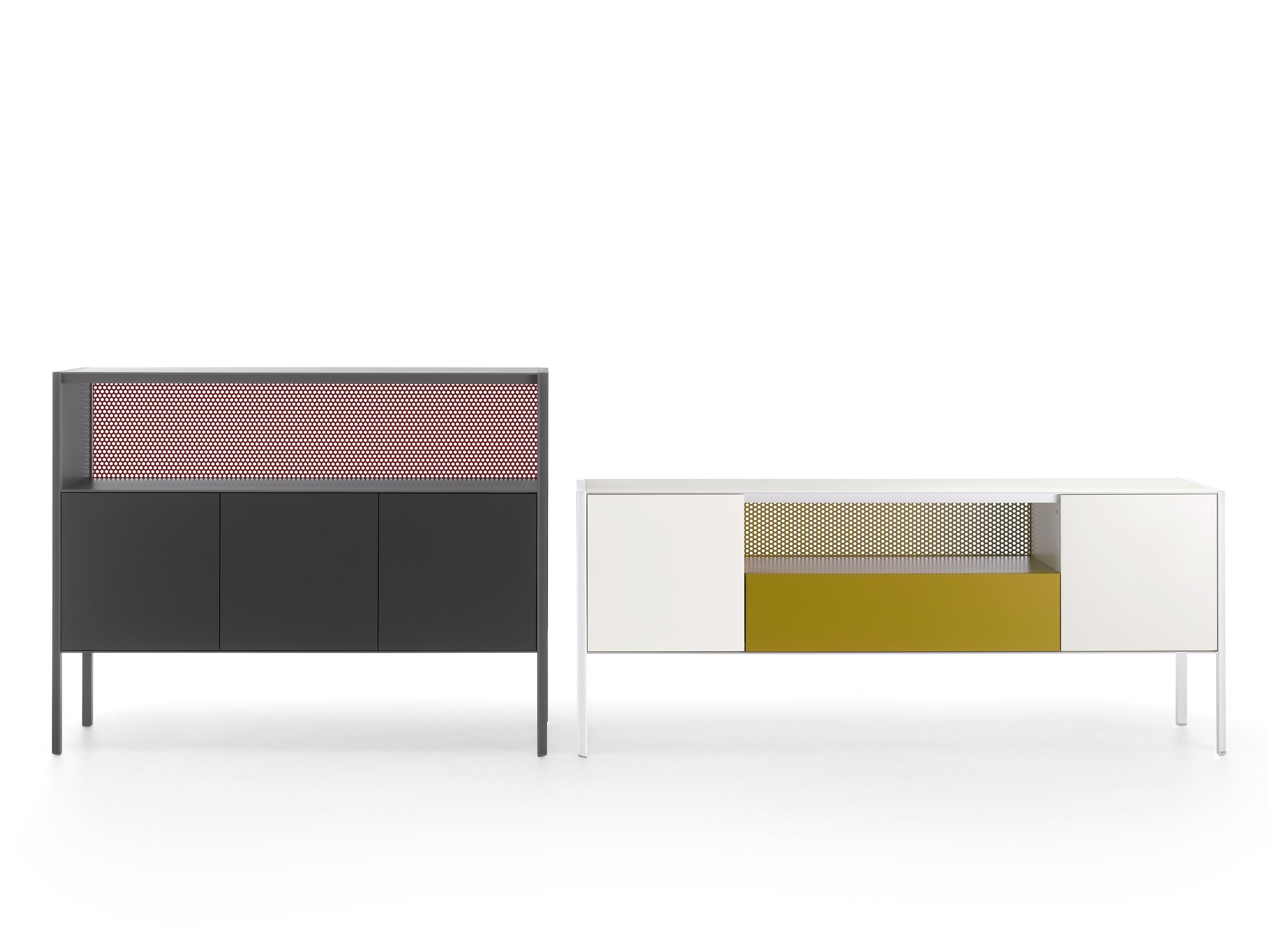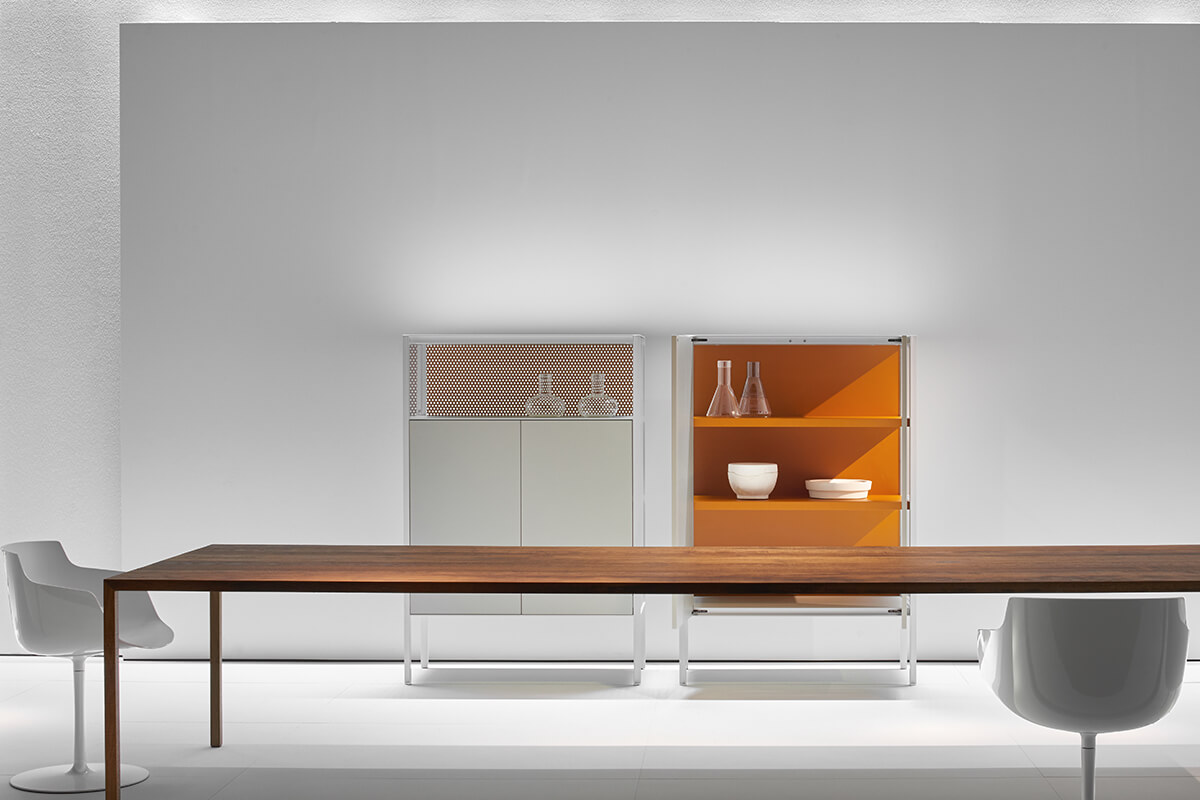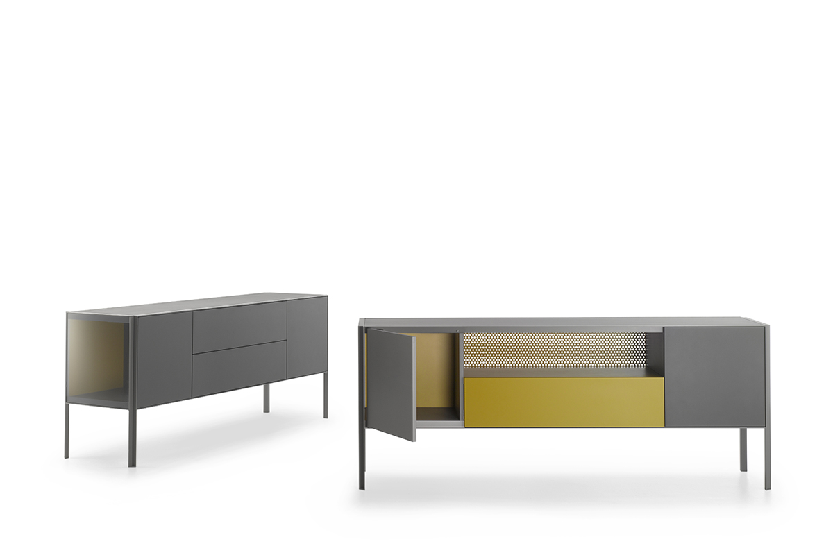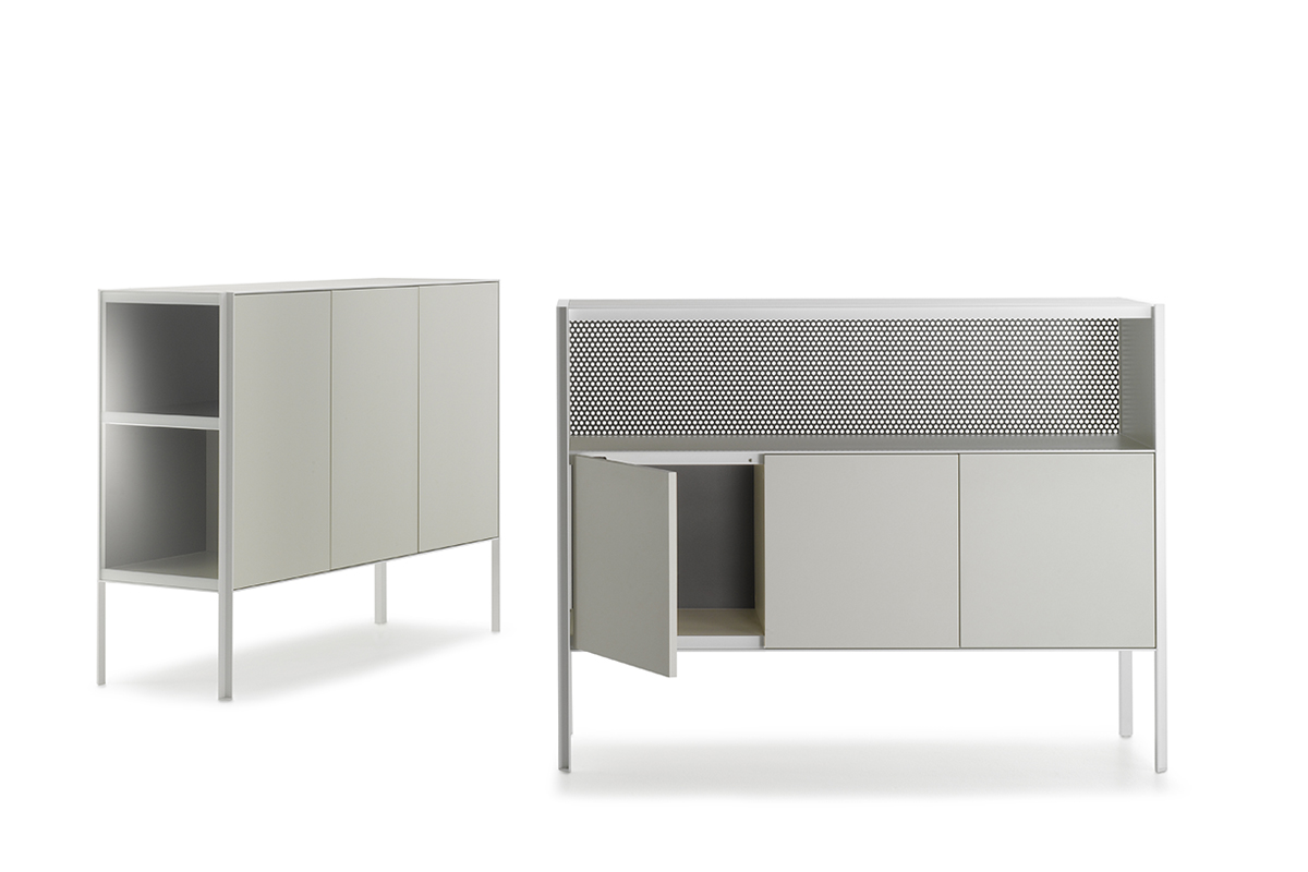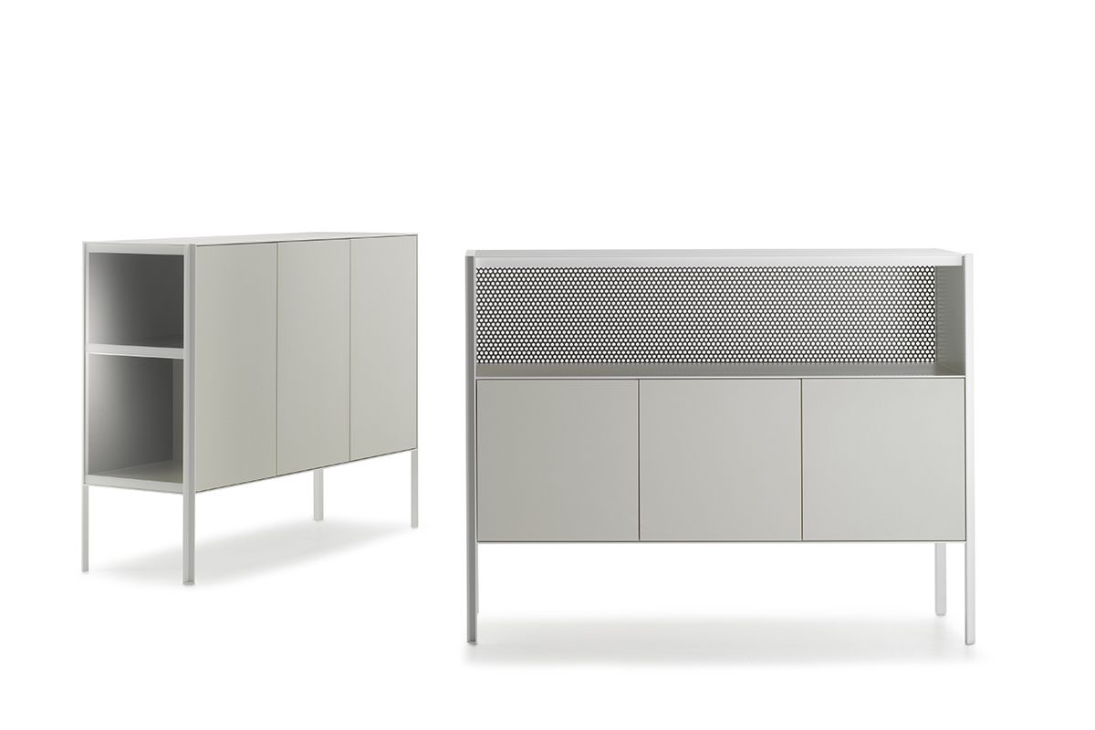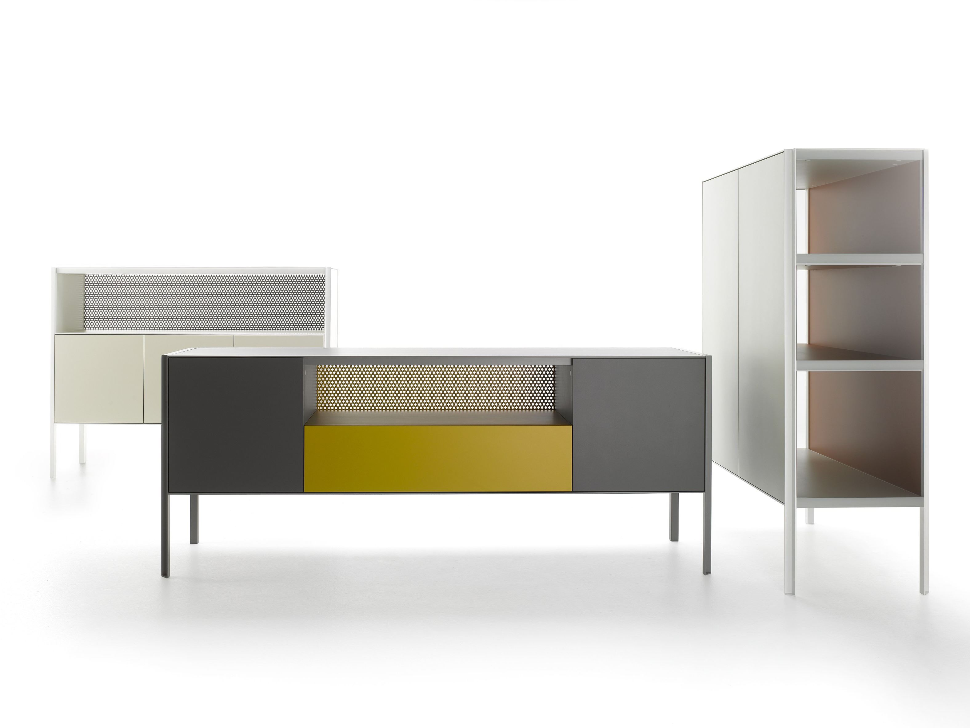 带有门,抽屉和开放式隔间的储物单元系统,适用于不同的家庭,办公室和公共环境。根据尺寸组合和正面设备,由不同储物单元组成的集合: -低L200 D50 H80厘米。可提供4门或2门,一个抽屉和一个开放式隔间,或两个门和一个双抽屉; -中号L151 D50 H116厘米。提供3门或3门和一个开放式隔层。 -高L103 D50 H152厘米。提供2门或2门和一个开放式隔层。 开放式隔间始终配备有带孔的靠背。 每个存储单元均可通过在两个侧面板的选项之间进行选择来定制: -透明的超透明玻璃,厚度为5mm -封闭,面板与结构的漆面相同。