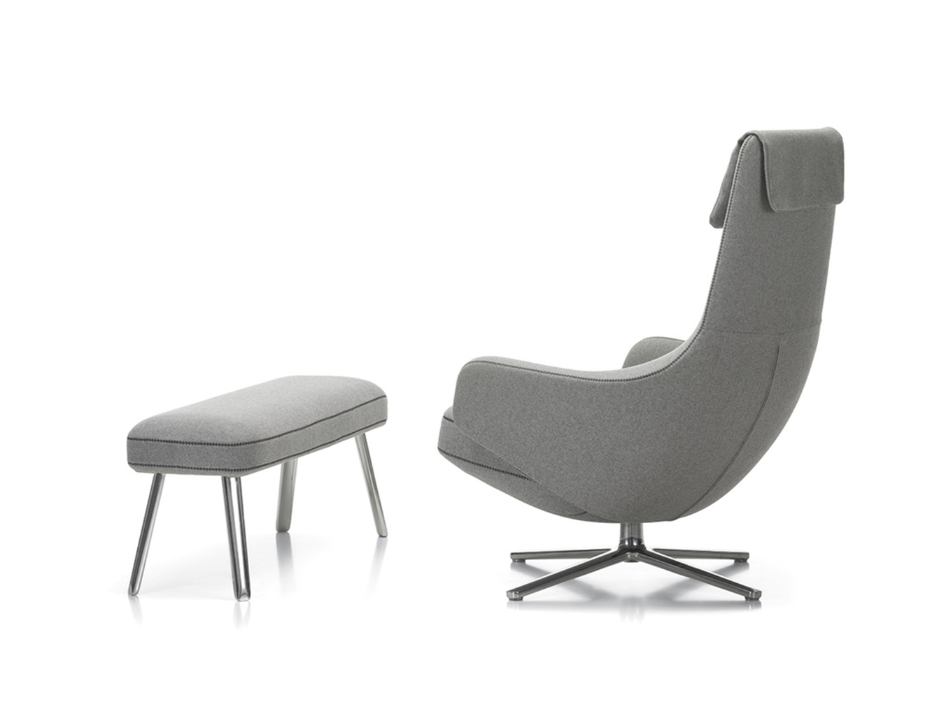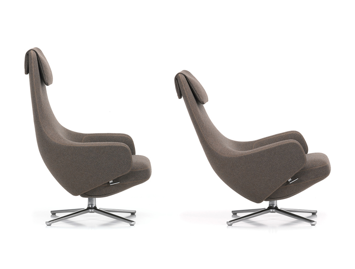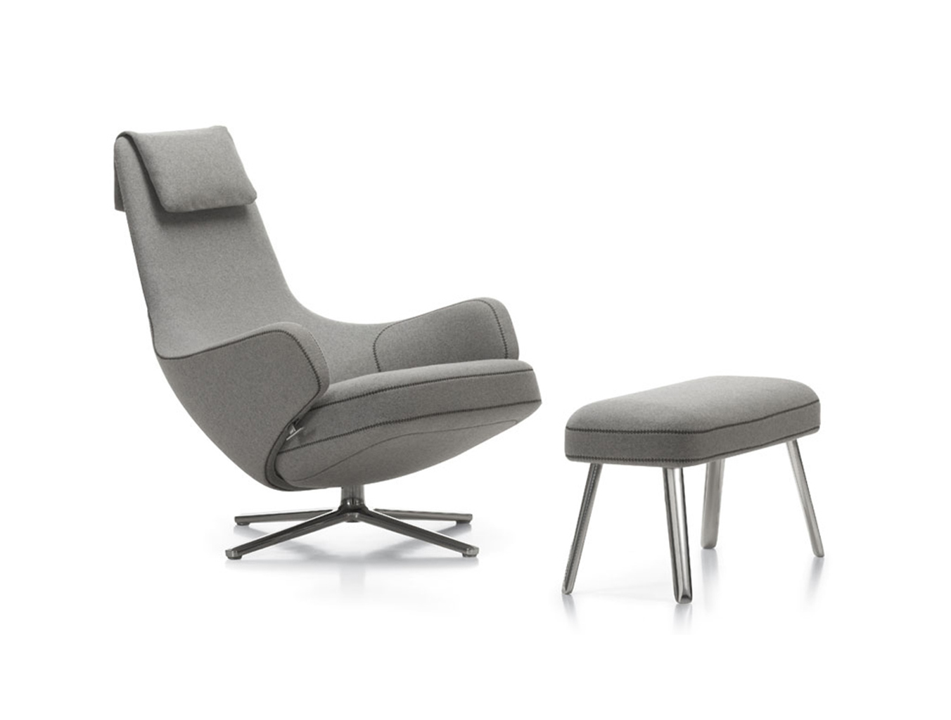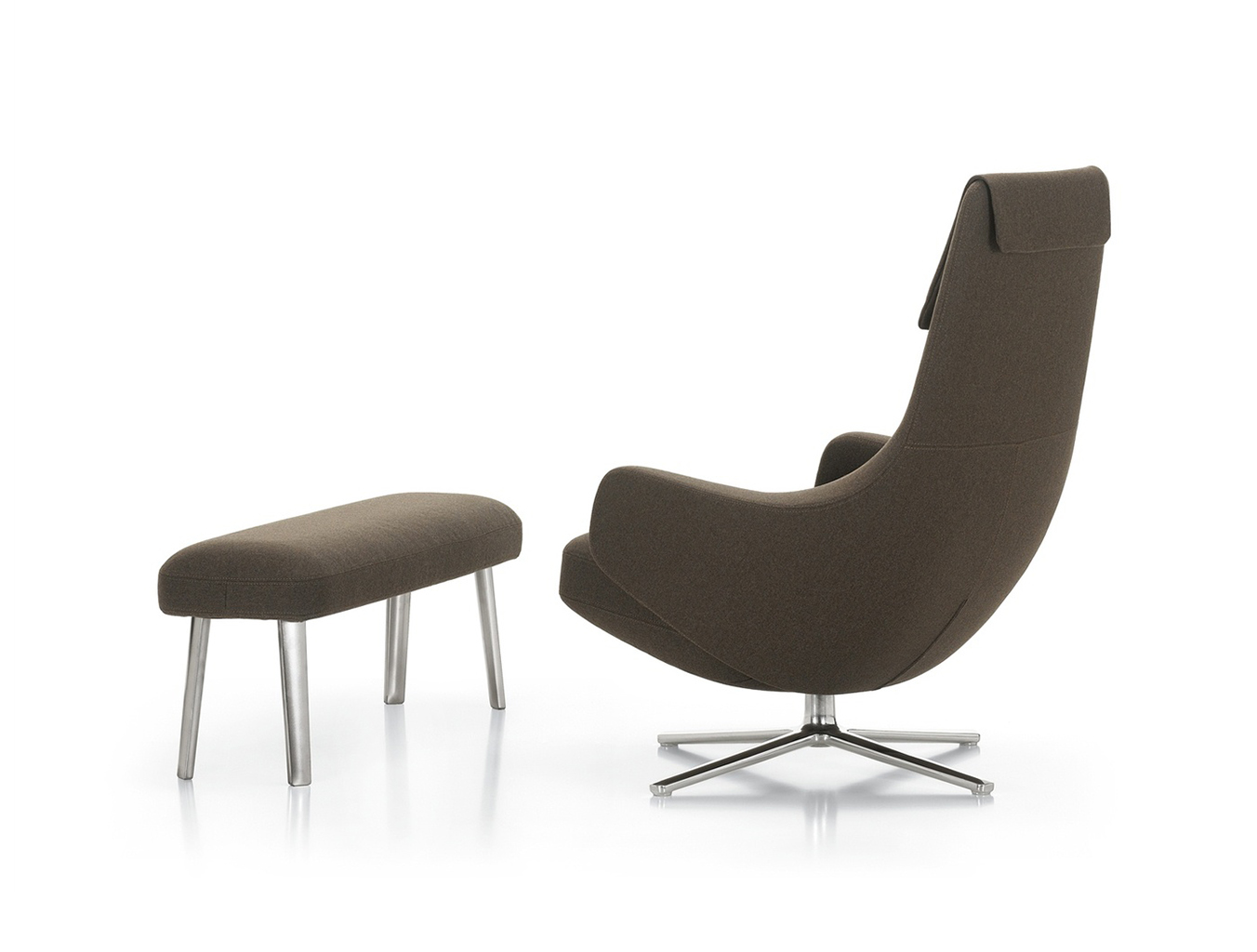"repos lounge chair and ottoman(repos休闲椅&脚踏)由设计大师Antonio Citterio所设计。repos系列休闲椅采用钢制铝合金脚架、聚氨酯海绵填充、高级布艺扪面,可随意调整坐姿和高度,也可以放平躺,配上舒适的羽毛衬垫,无论阅读或者休憩,都非常舒服,符合人体工学,高档舒适,是办公,会议的理想选择。意大利设计师和建筑师 Antonio Citterio赋予了这边椅子永恒的优雅气质与无与伦比的舒适,是当代设计的经典,无论用在办公、商业、家庭都是非常高贵大气的。