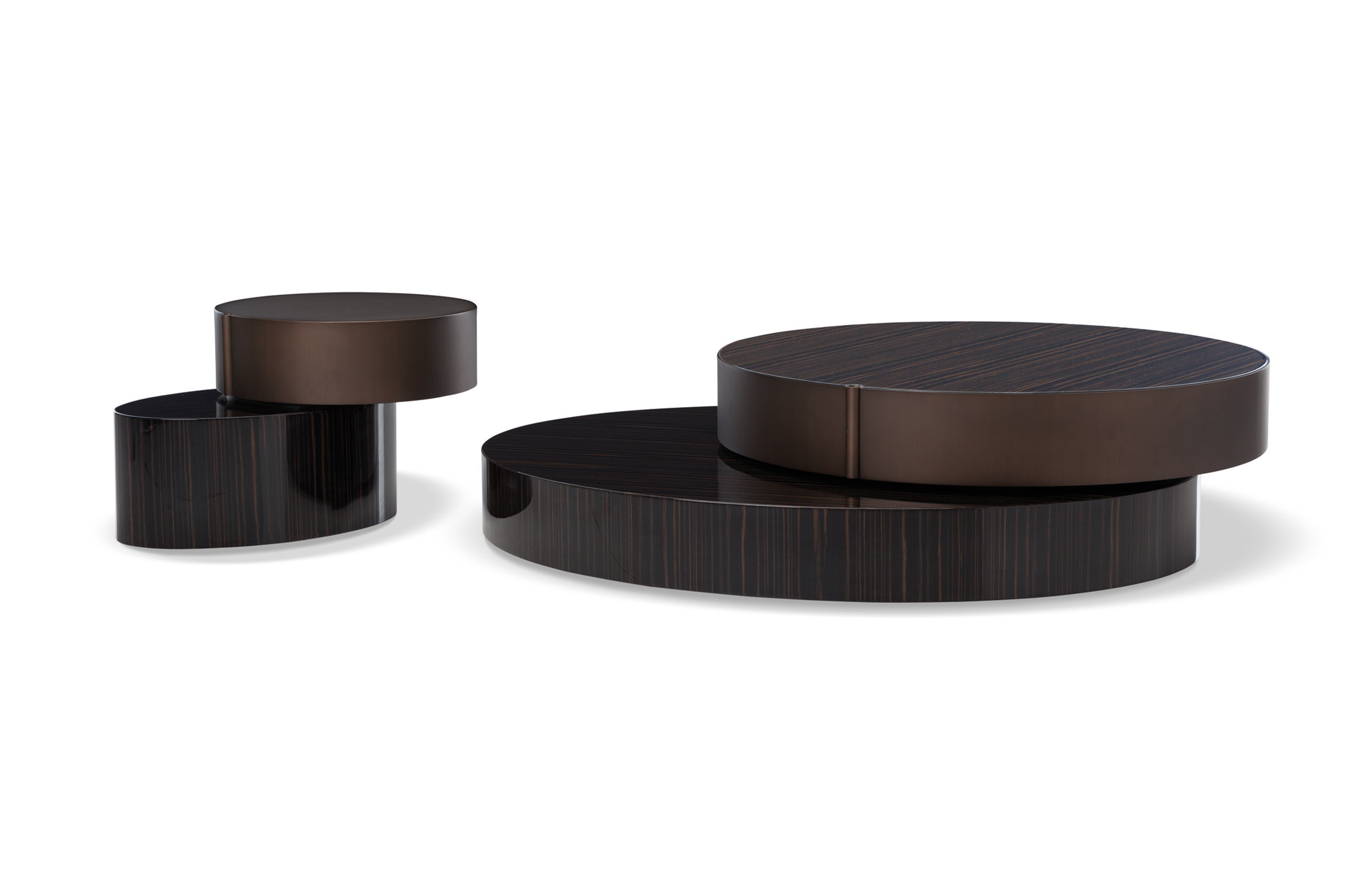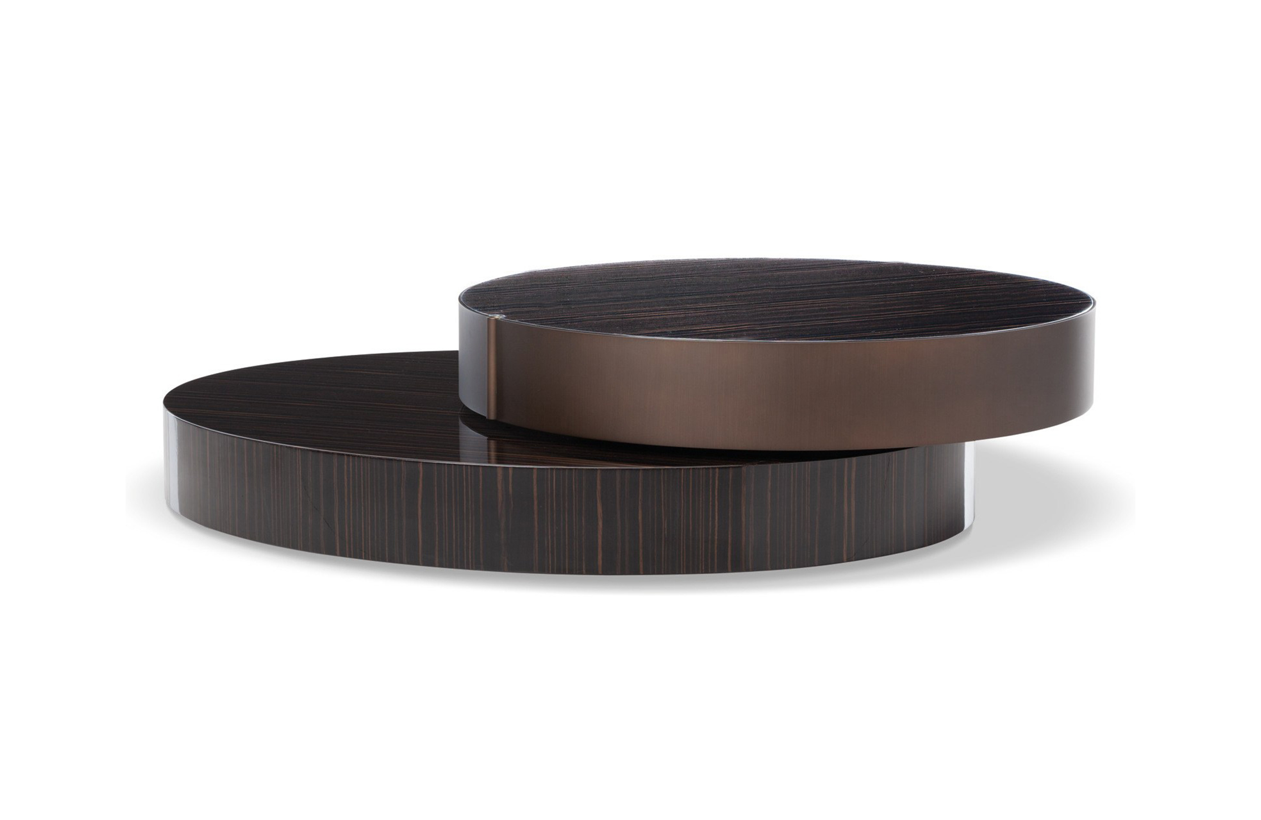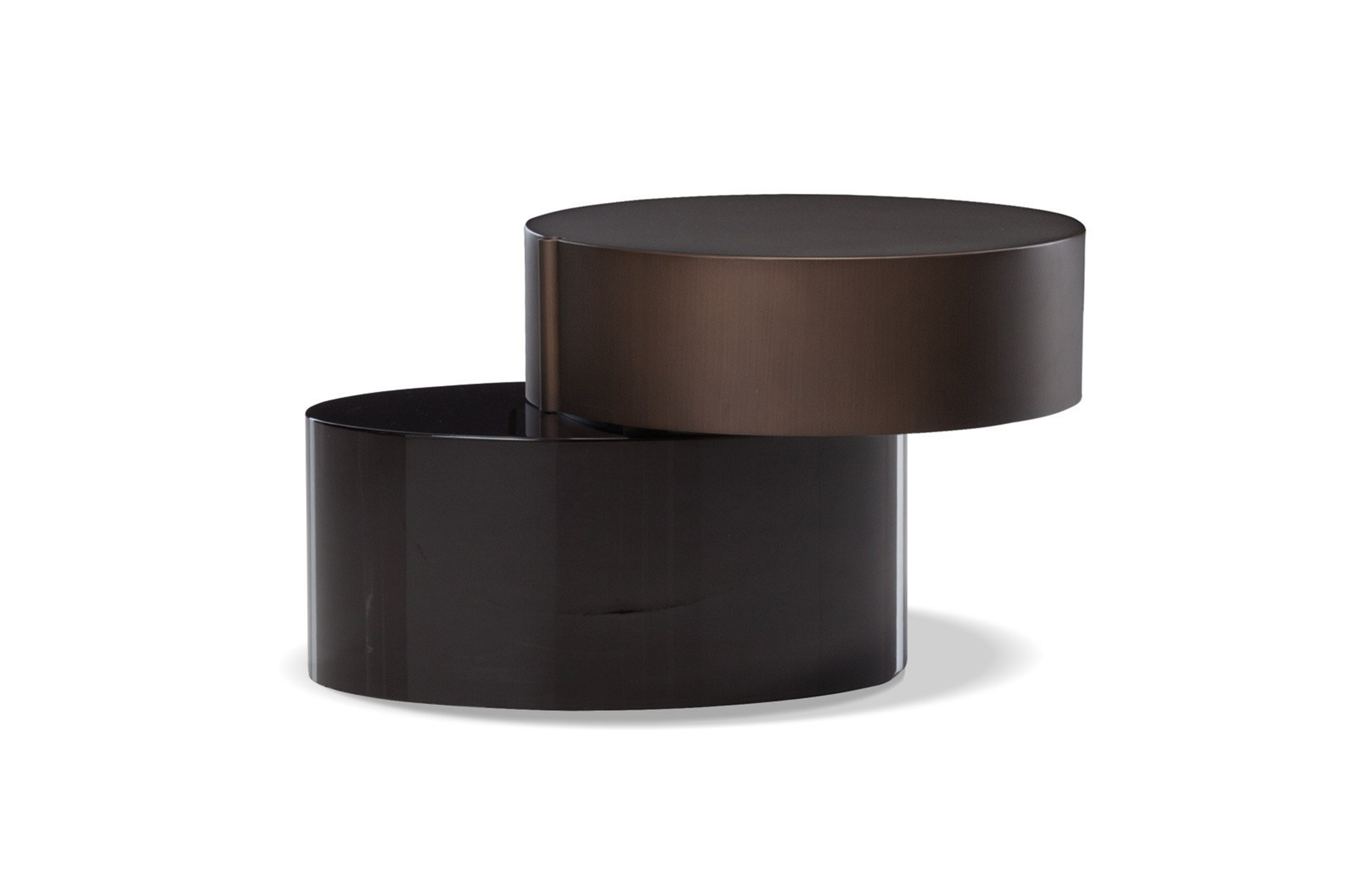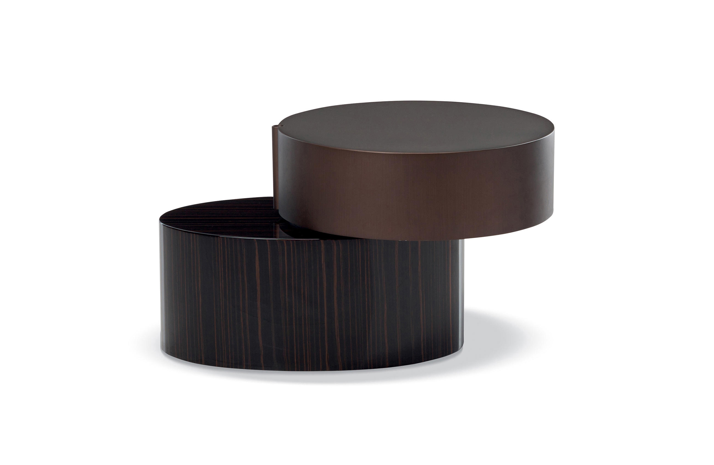 重叠的造型搭配珍贵的材质,这就是Benson的独特之处。木材的质感和金属的光亮感完美展现出雕塑般的造型。Benson边几可以直接放置在地面上,有两种不同的尺寸可供选择,以满足不同的功能需求。尺寸为120x95厘米的版本,基座为椭圆形,上方面板为圆形,配备的机械装置可以使其旋转360度,增强边几的延展性,使其更加靠近沙发座椅。直径为46厘米,高度为38厘米的版本,专门用于放置在沙发和扶手椅的侧方,有以下组合可供选择:一种是下方台面为亮面乌木,上方台面为亚光铜色板材;另一种是下方台面为Moka色亮光漆,上方台面为金色亮光漆。