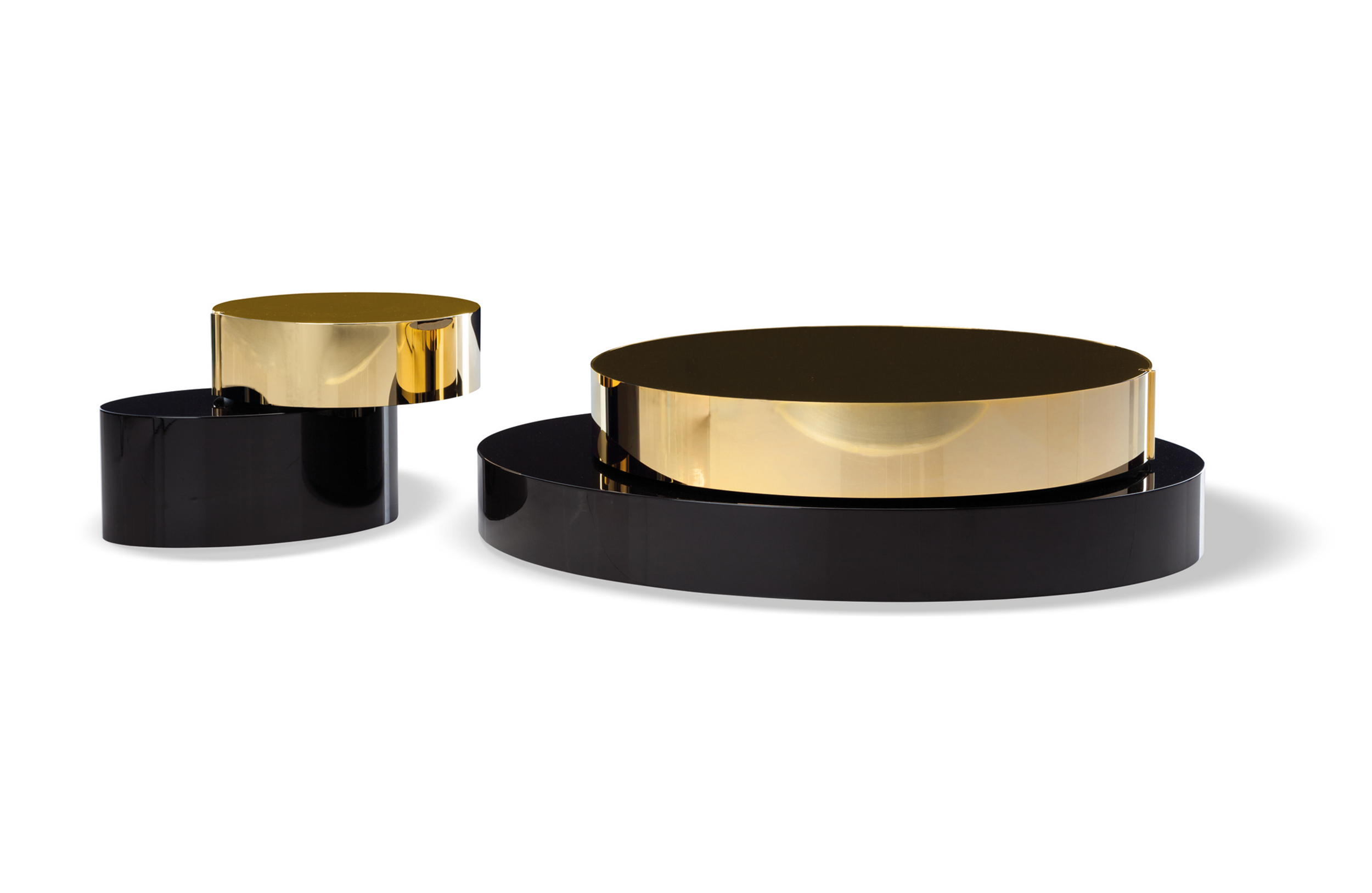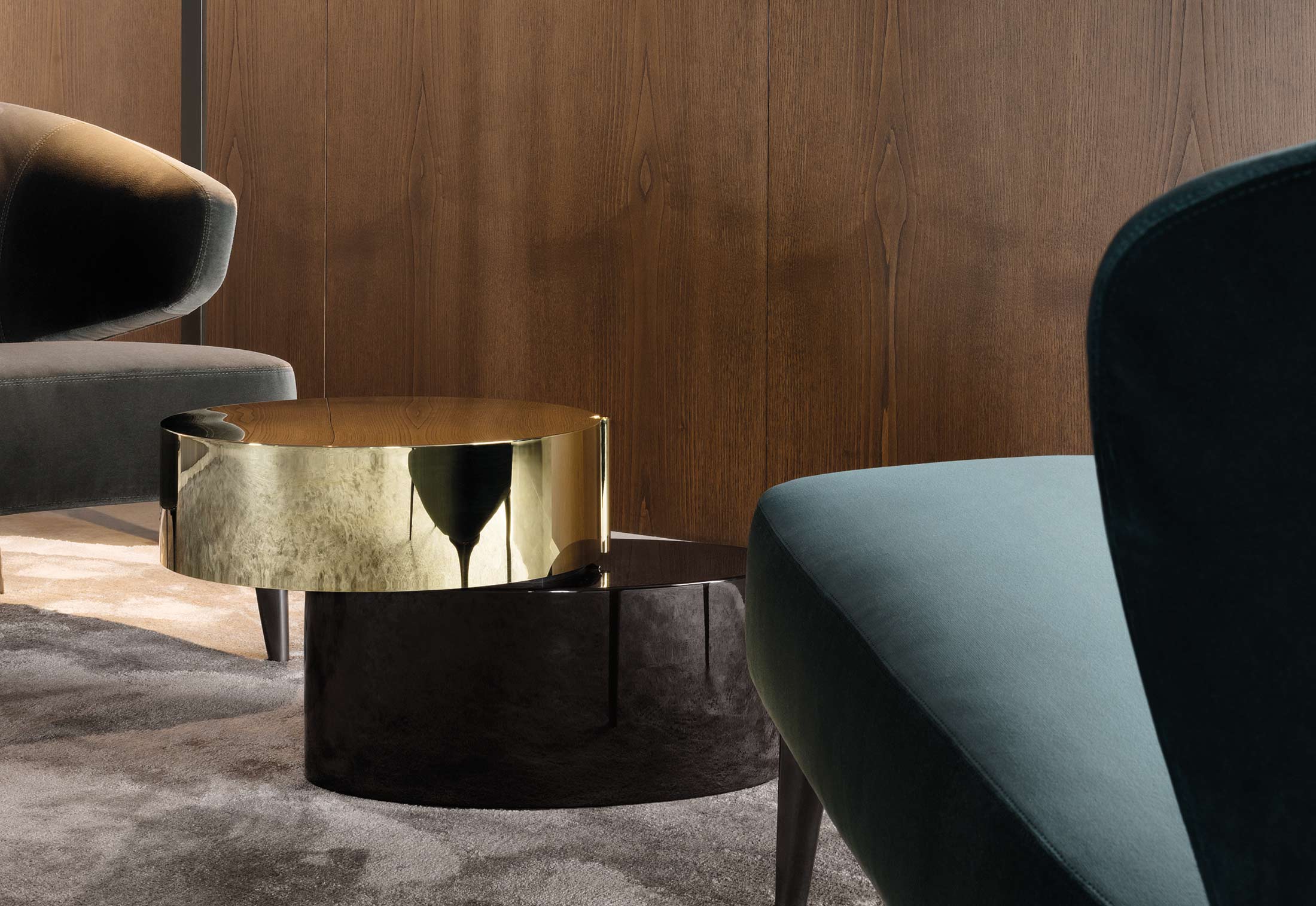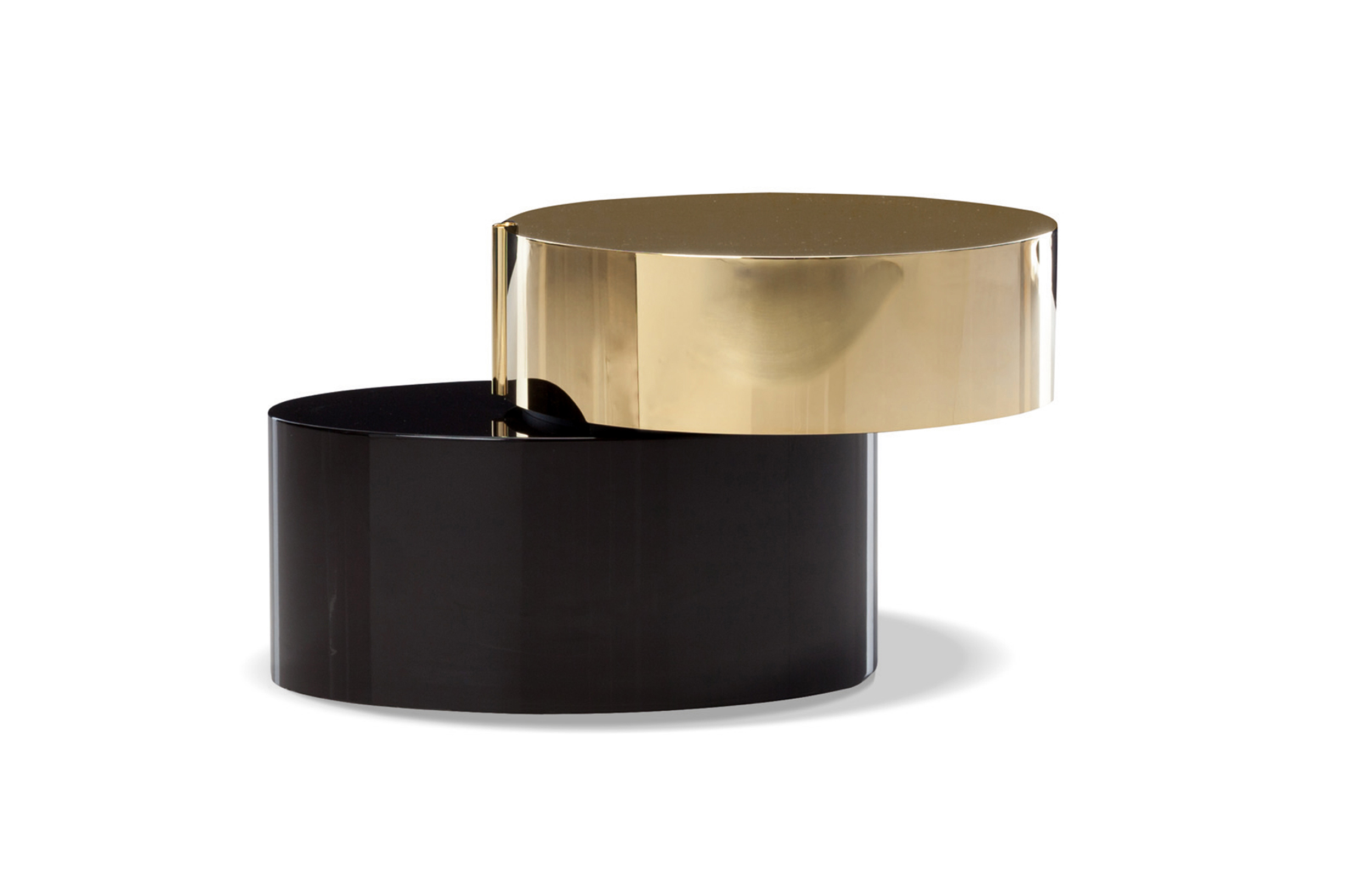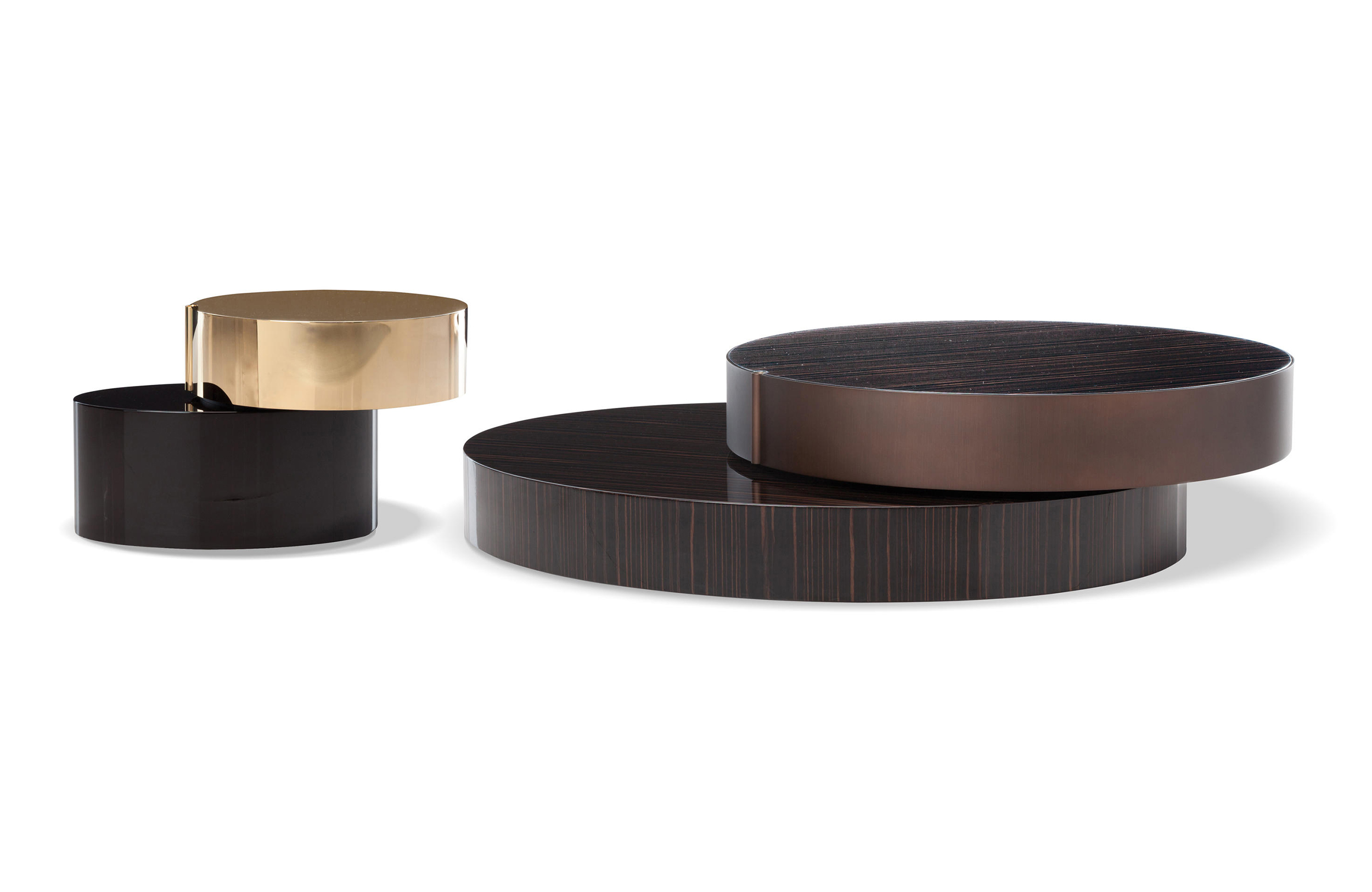 重叠的造型搭配珍贵的材质,这就是Benson的独特之处。木材的质感和金属的光亮感完美展现出雕塑般的造型。Benson边几可以直接放置在地面上,有两种不同的尺寸可供选择,以满足不同的功能需求。尺寸为120x95厘米的版本,基座为椭圆形,上方面板为圆形,配备的机械装置可以使其旋转360度,增强边几的延展性,使其更加靠近沙发座椅。直径为46厘米,高度为38厘米的版本,专门用于放置在沙发和扶手椅的侧方,有以下组合可供选择:一种是下方台面为亮面乌木,上方台面为亚光铜色板材;另一种是下方台面为Moka色亮光漆,上方台面为金色亮光漆。