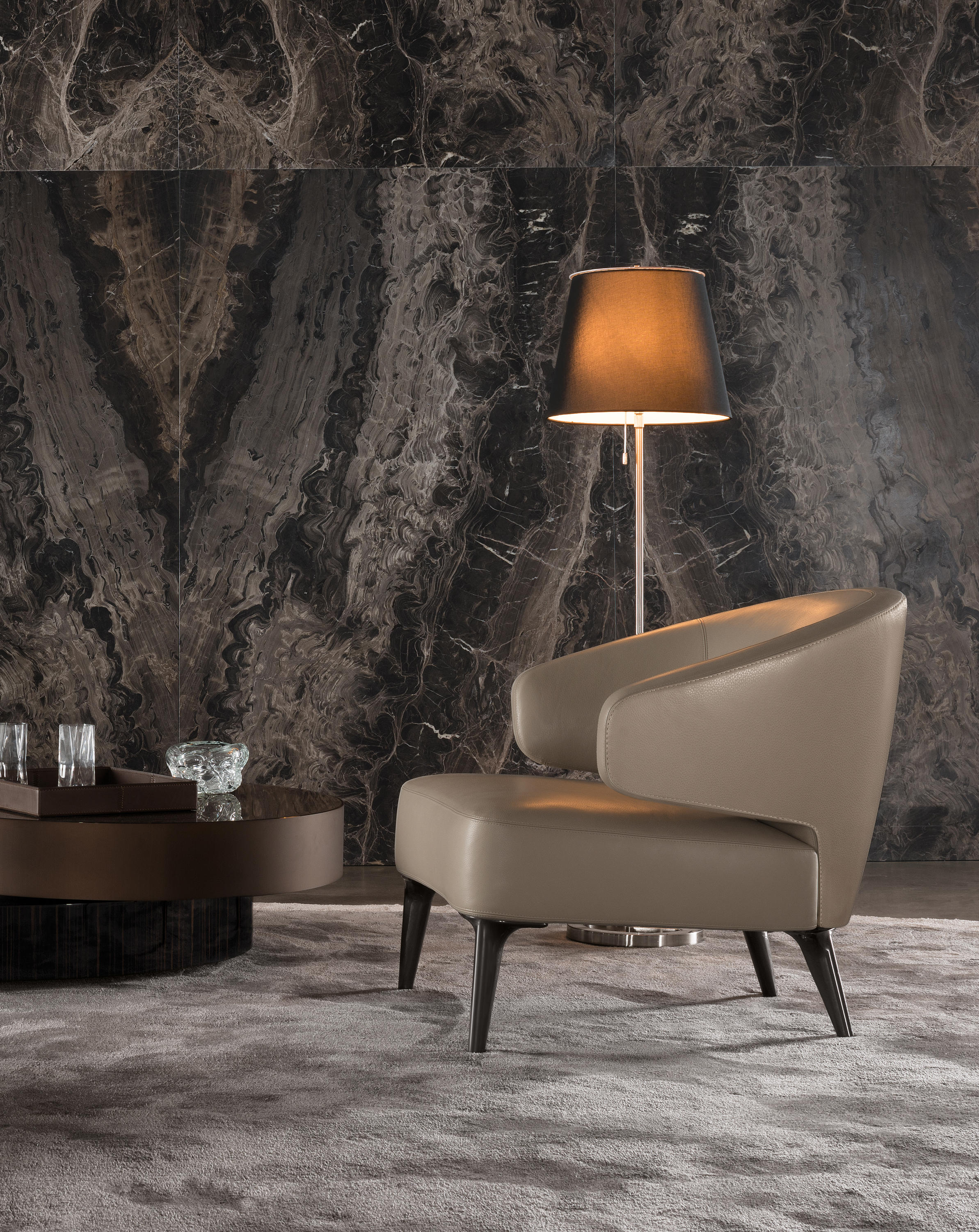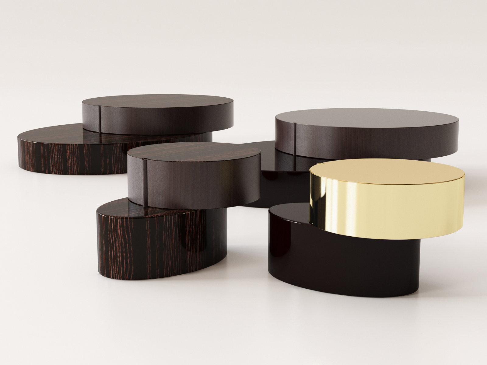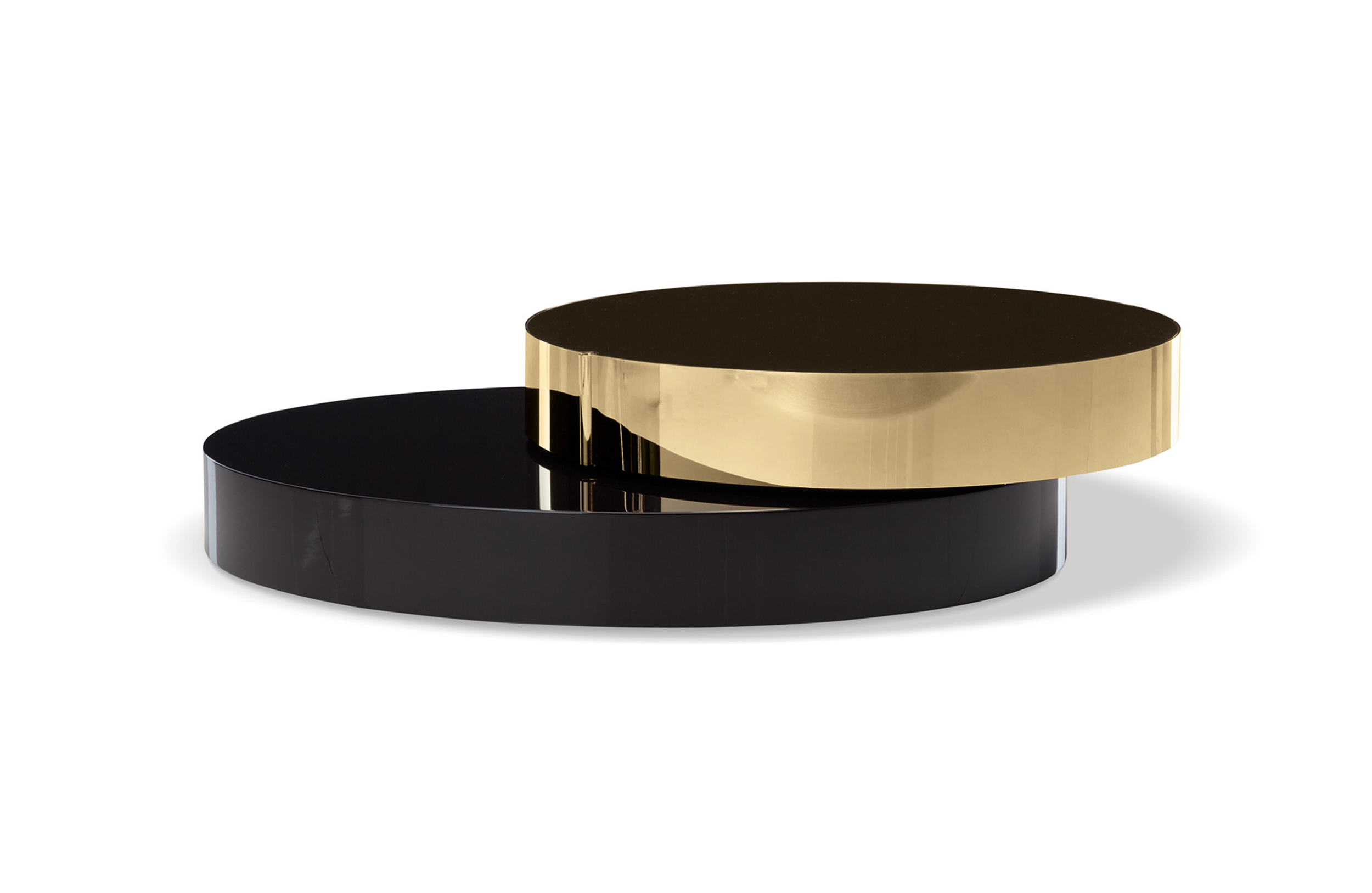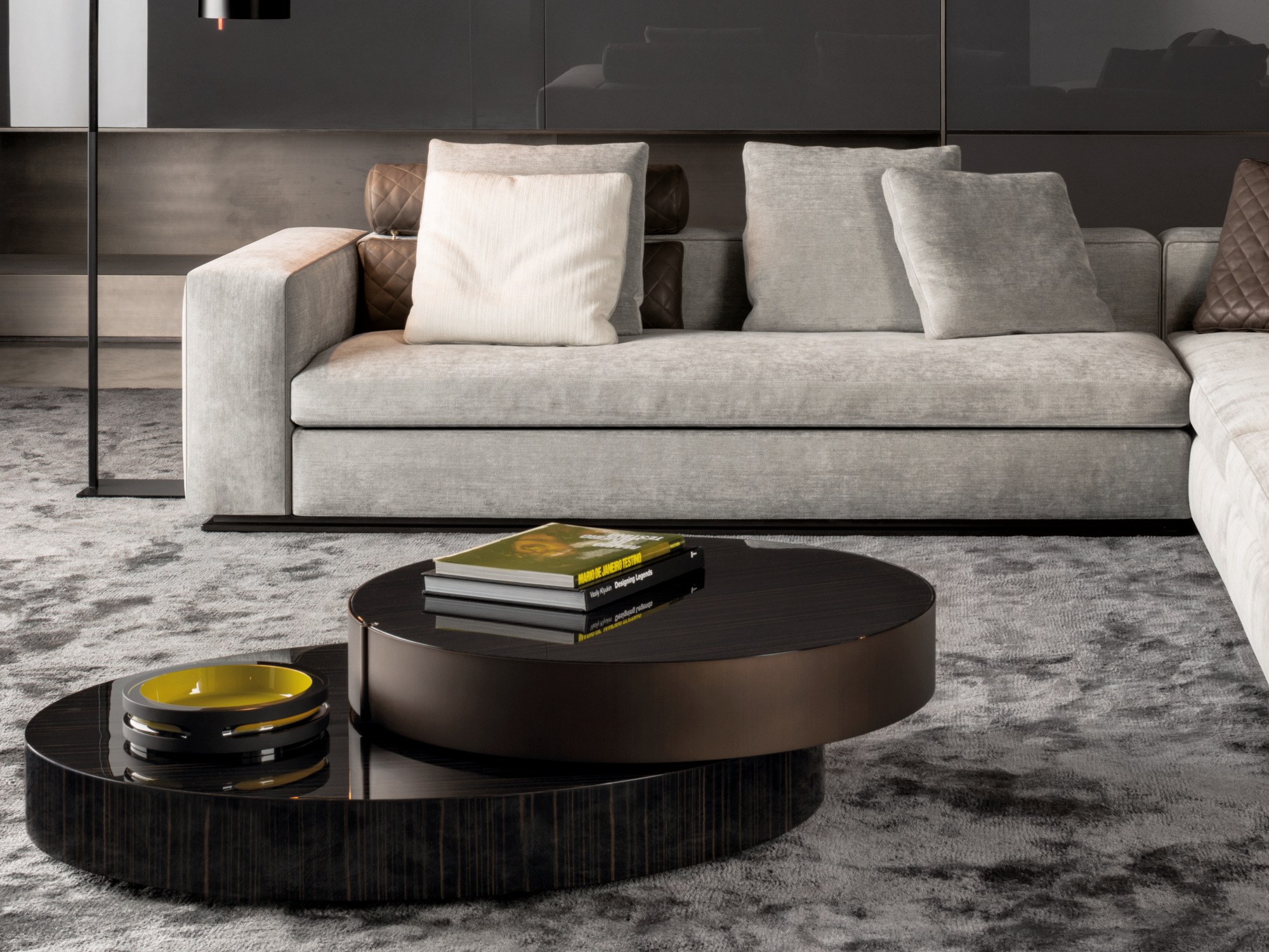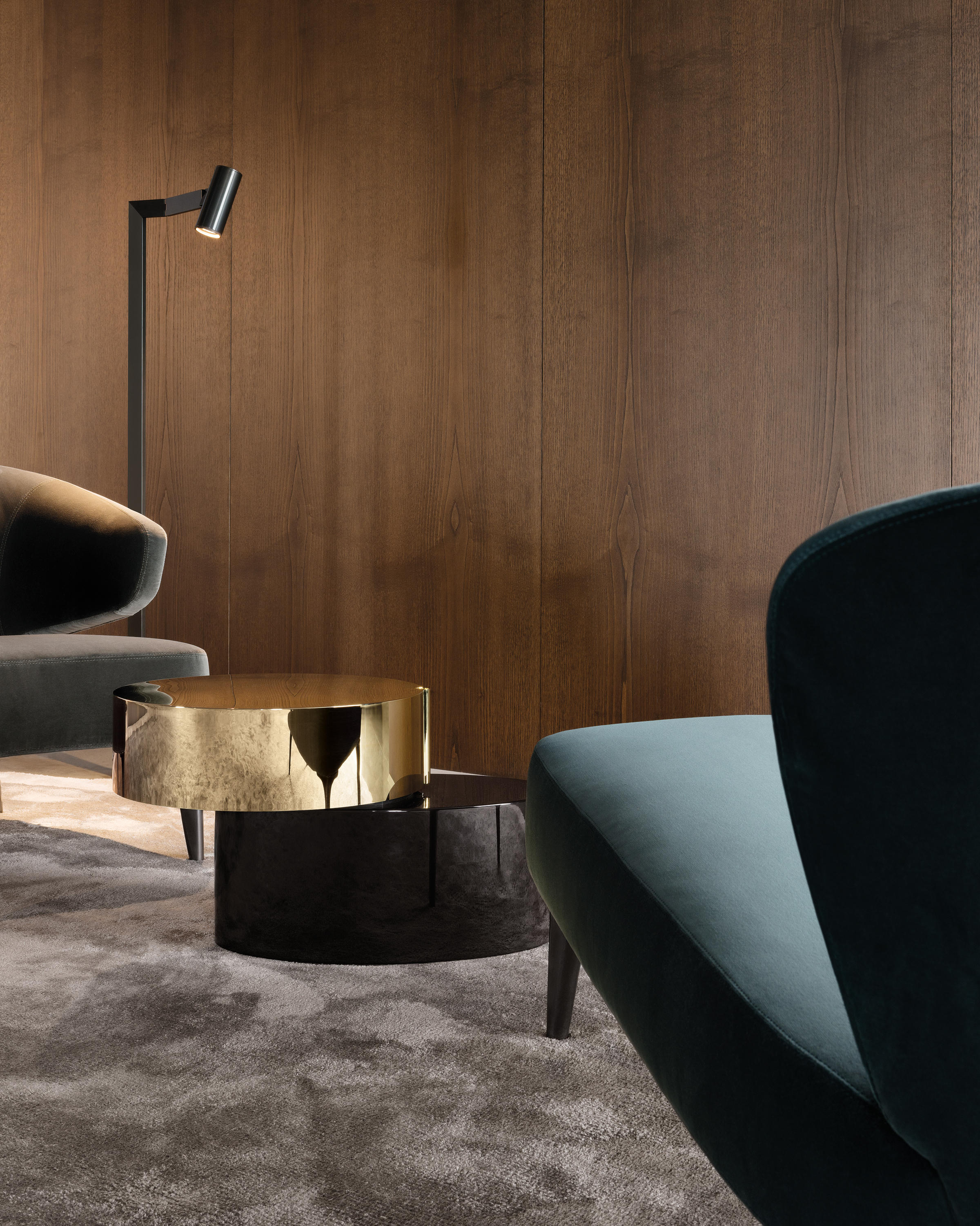 重叠的造型搭配珍贵的材质,这就是Benson的独特之处。木材的质感和金属的光亮感完美展现出雕塑般的造型。Benson边几可以直接放置在地面上,有两种不同的尺寸可供选择,以满足不同的功能需求。尺寸为120x95厘米的版本,基座为椭圆形,上方面板为圆形,配备的机械装置可以使其旋转360度,增强边几的延展性,使其更加靠近沙发座椅。直径为46厘米,高度为38厘米的版本,专门用于放置在沙发和扶手椅的侧方,有以下组合可供选择:一种是下方台面为亮面乌木,上方台面为亚光铜色板材;另一种是下方台面为Moka色亮光漆,上方台面为金色亮光漆。