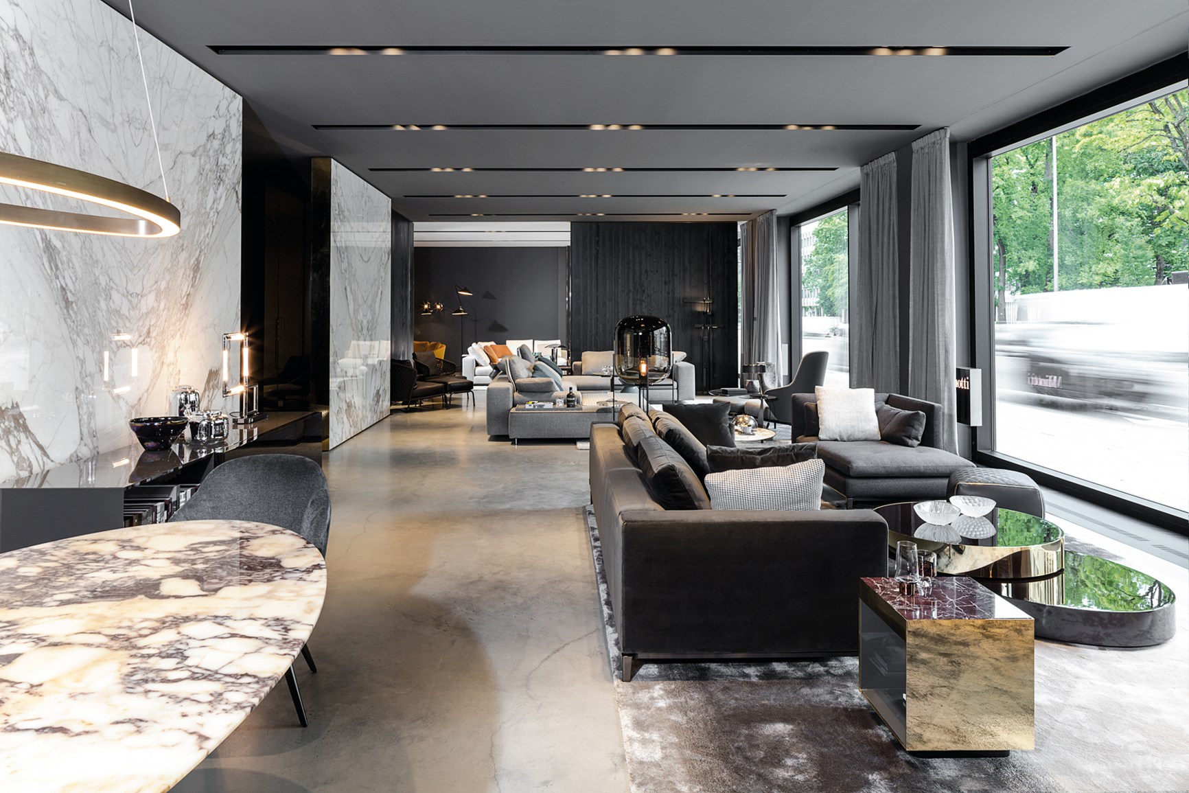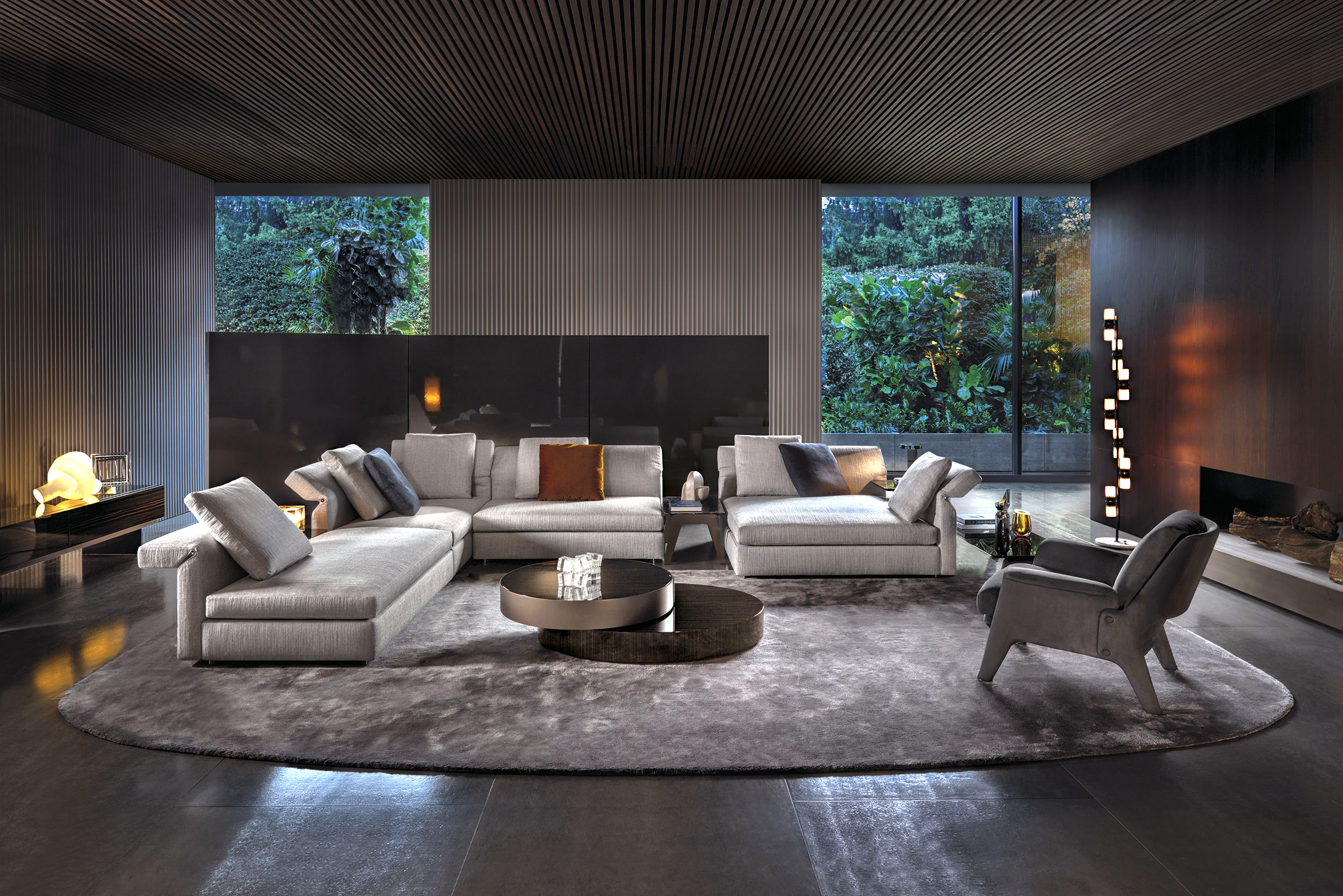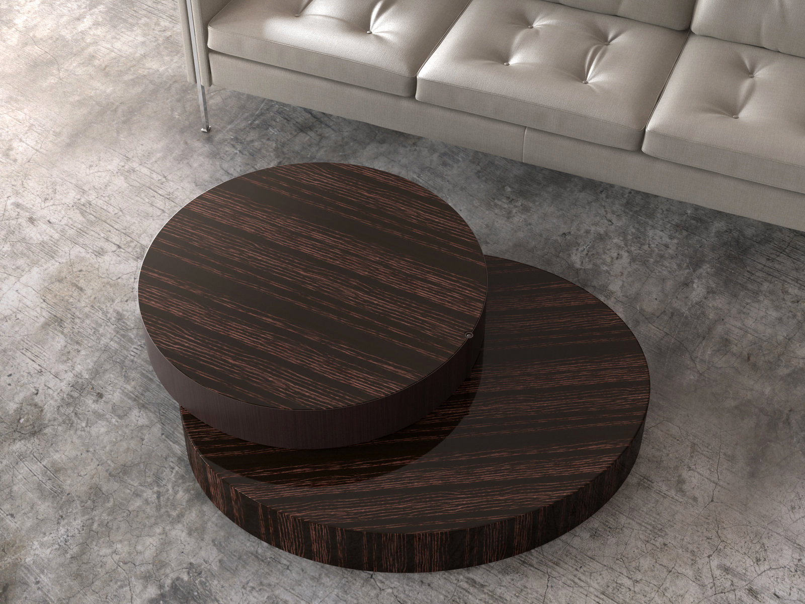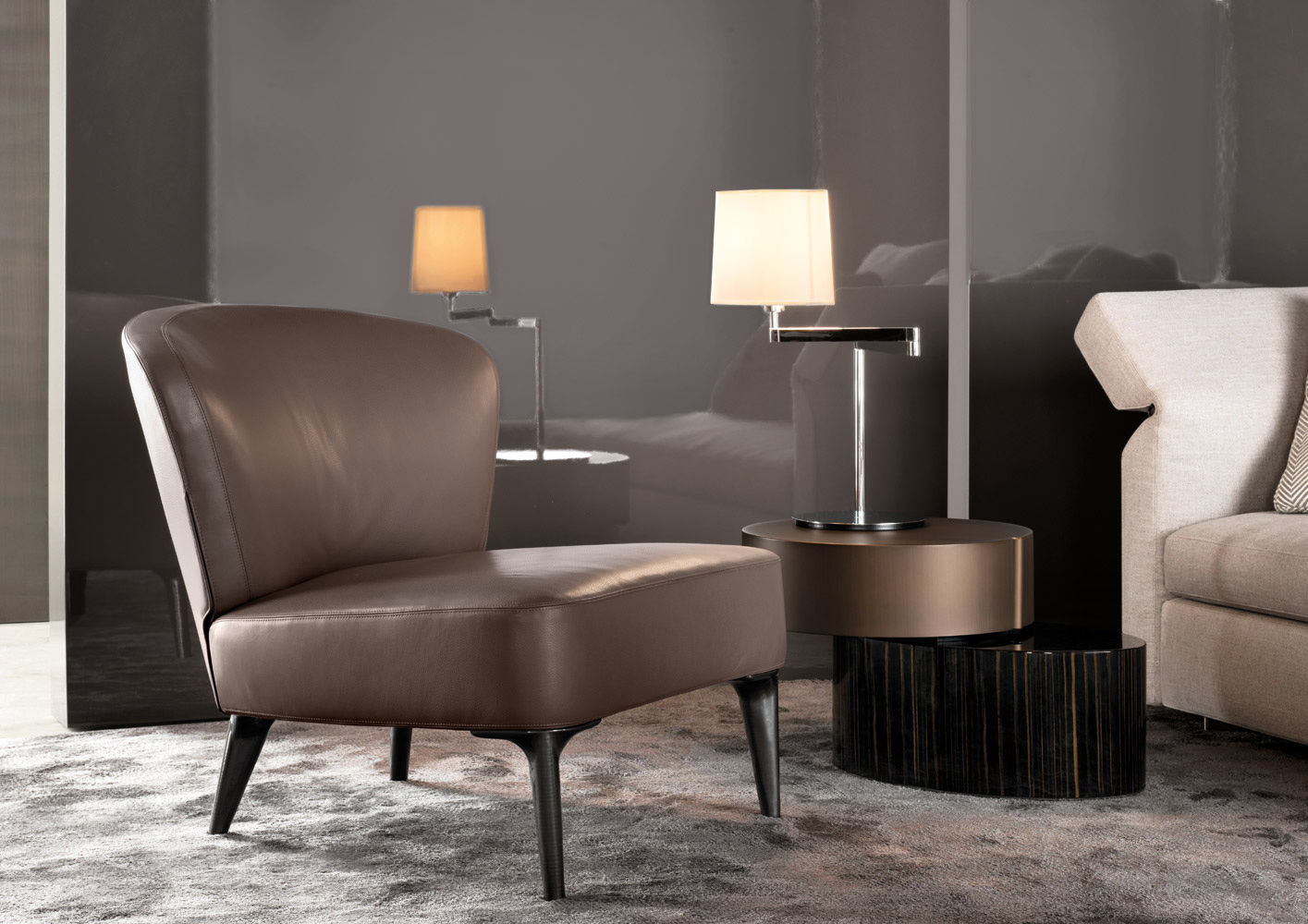 重叠的造型搭配珍贵的材质,这就是Benson的独特之处。木材的质感和金属的光亮感完美展现出雕塑般的造型。Benson边几可以直接放置在地面上,有两种不同的尺寸可供选择,以满足不同的功能需求。尺寸为120x95厘米的版本,基座为椭圆形,上方面板为圆形,配备的机械装置可以使其旋转360度,增强边几的延展性,使其更加靠近沙发座椅。直径为46厘米,高度为38厘米的版本,专门用于放置在沙发和扶手椅的侧方,有以下组合可供选择:一种是下方台面为亮面乌木,上方台面为亚光铜色板材;另一种是下方台面为Moka色亮光漆,上方台面为金色亮光漆。