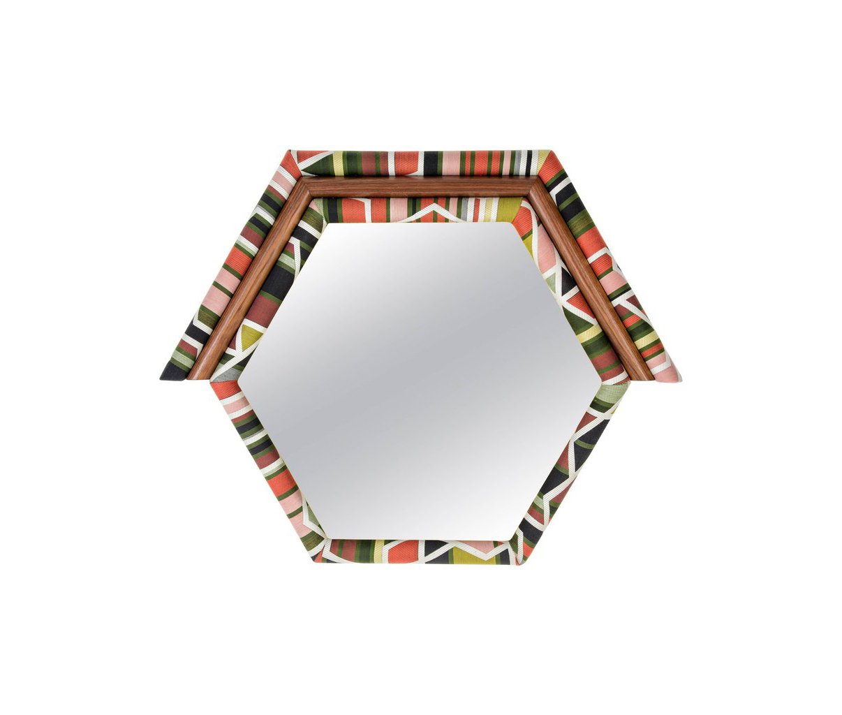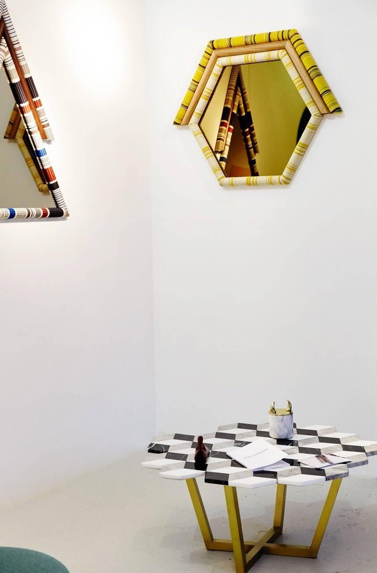 Pontiac Hexagon(庞蒂亚克六边形镜)具有美国核桃和金色镜面的鲜艳色彩。几何图案KvADRAT织物已经对称地切割和手工制作的木材和泡沫。这种复古风格的印花和色彩搭配与黑核桃相配,给人一种朴实的感觉。这些意外的独特镜子也可以定制。