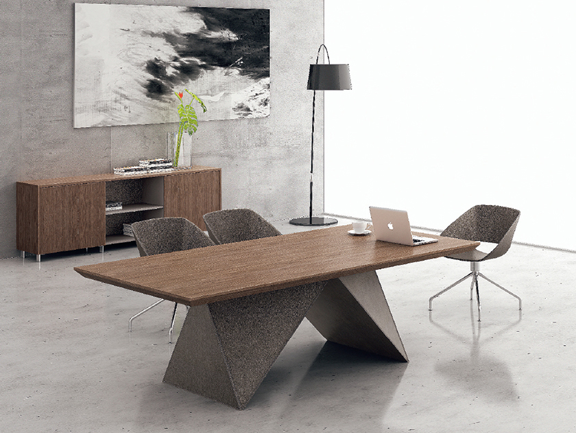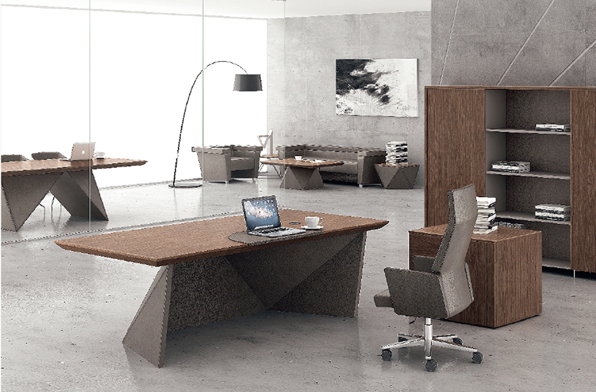 威睿系列,最大的亮点是独特的切割面。打破整体划一的家具造型模式,采用几何体构造设计手法,大尺度楔形宽体切面造型,如钻石的刻面与腰面错落有致,造出流畅的线条感。将现代建筑设计元素融入现代办公空间,结合整体布局配套延展,打造办公家具时尚前沿。主桌采用皮木覆膜工艺,机车缝合明线效果处理,浅胡桃皮木与皮椅搭配,整个空间充斥着个性化对比,金属材质简洁明快,流露出一种低调的奢华与睿智,配合银灰色的空间墙面,使得办公家具与整体的风格一脉相承。"