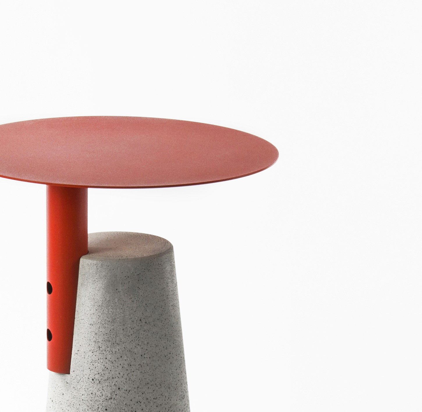 一竖加两竖,加三竖;红色搭黑色,搭白色,所见即所得,简单就是法则。用“0”形金属面板与水泥墩做一道减法,生产工序至简,功能至简,造型至简。简单才是需求,给设计做笔减法,去除复杂的修饰、多余的功能,凝炼欲望,简化造型,一切只为直白的使用与纯粹的美。在加工和组装工序上的简化,能有效节省生产成本。作为边桌,具有很强的功能性目的,贴合现代居室的简约理念,没有过多的干扰性,适用于现代家居用具的各种组合搭配。
