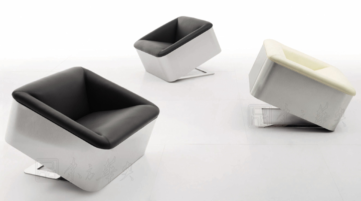 ※ 上图我为单人位沙发,款式的独特设计,简单大方,不同于以往沙发的座位表现,它利用不锈钢的特性,支撑沙发向上倾仰,使沙发有一定的弧度,沙发靠背和扶手连接,同样的不规则弧度体现,现代化表现的淋漓尽致!