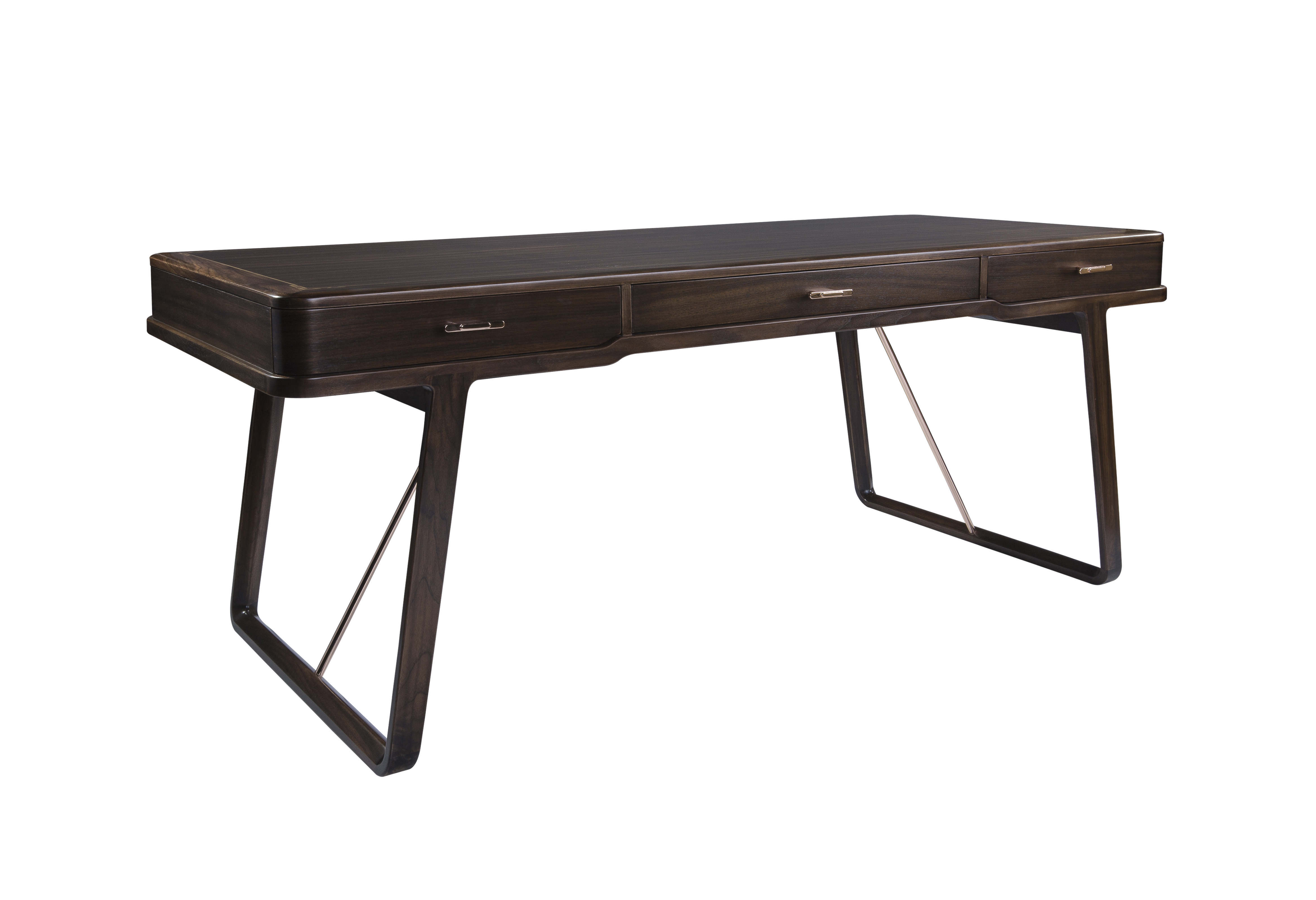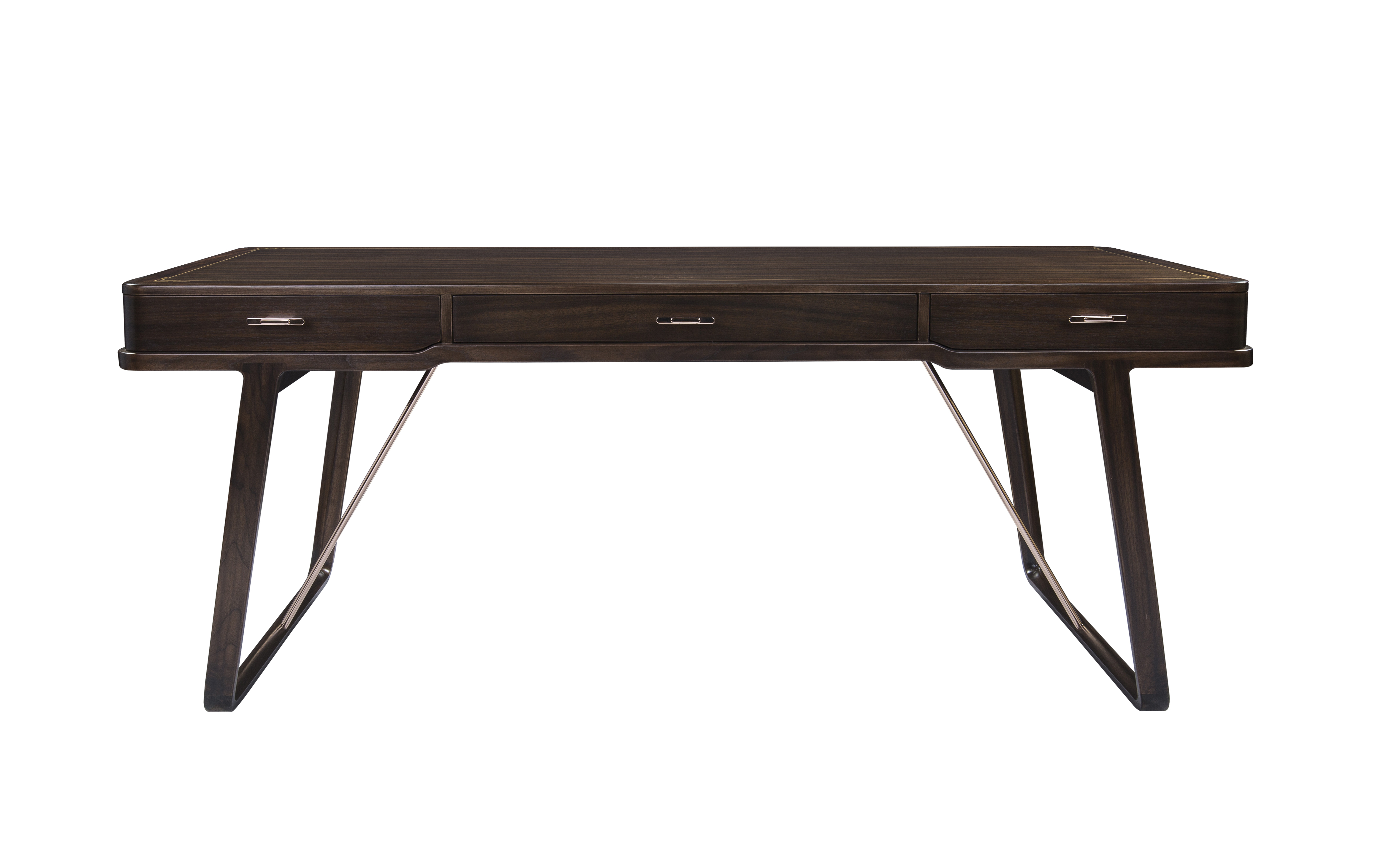 1.书桌整体简洁干练,以线为主,秀美颀长。 2.腿部内收,上收下分,具有很好的视觉稳定感稳重大方。 3.铜条拉杆与铜把手的装饰,在保证实用性的同时赋予独特中式韵味,彰显价值。