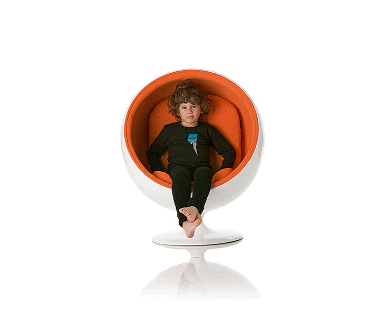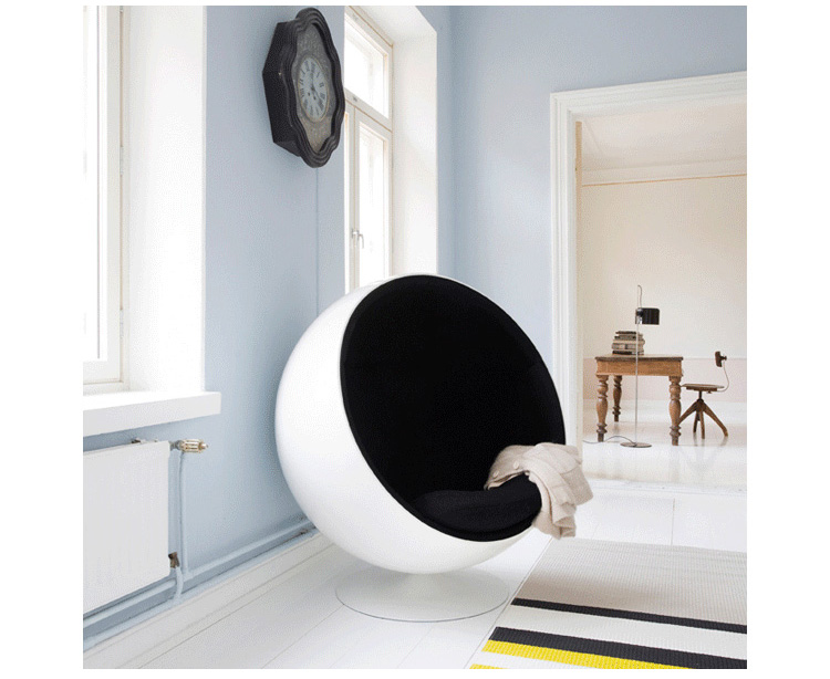 设计师艾洛·阿尼奥在 1963 年设计的,球椅结构简单,上边是用半球,下面是旋转的支撑脚,球椅(Ball Chair)球椅可以360度旋转。可以附加带喇叭MP3,香水味,彩光灯等功能,这种设计让消费者有眼前一亮的感觉,这设计也为家具厂商带来了一次巨大的商机,所以球椅(Ball Chair)也开始被大量的生产,它的诞生来家具设计提升了一个高度,让设计者重新审视了自己的设计观念。
