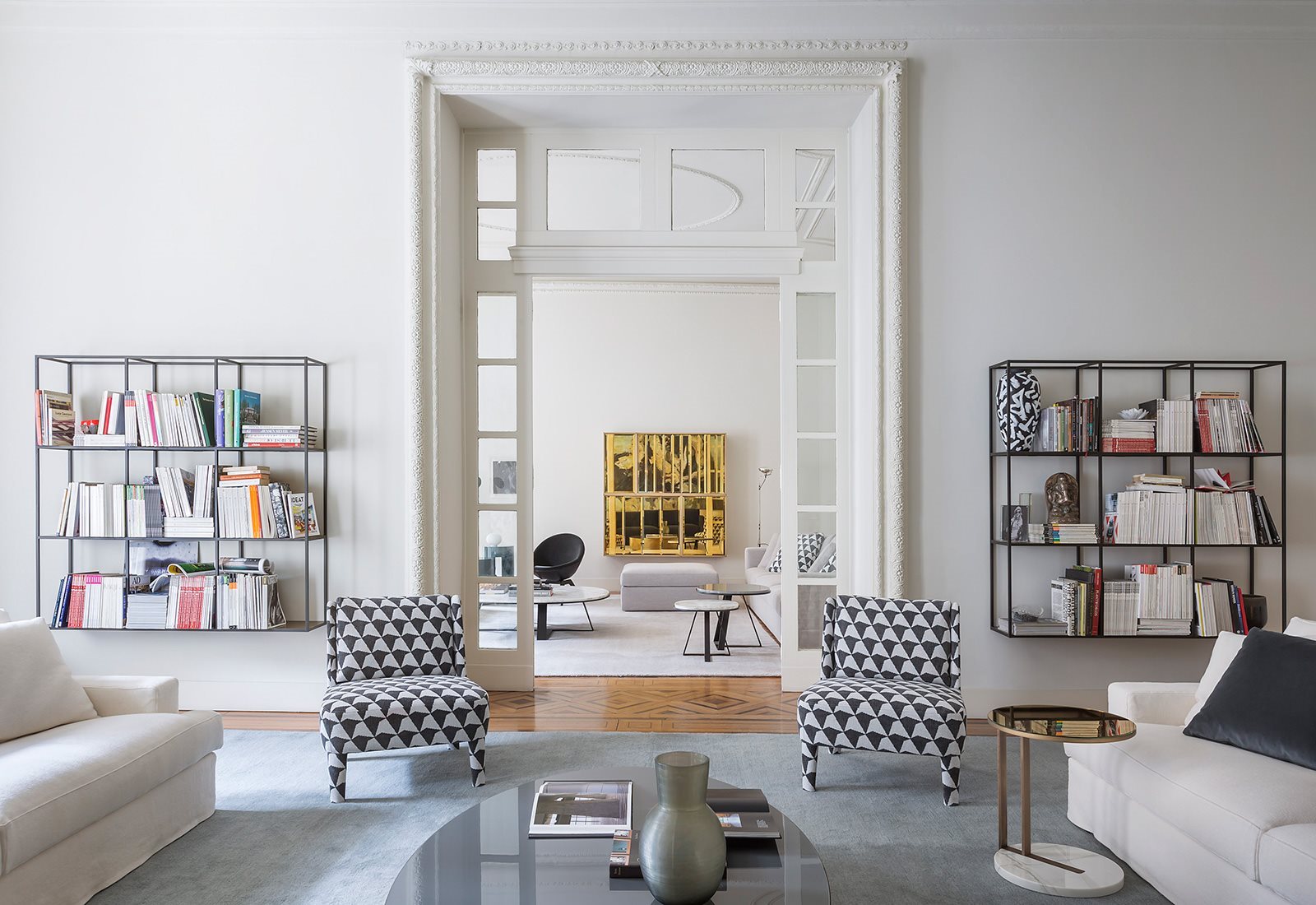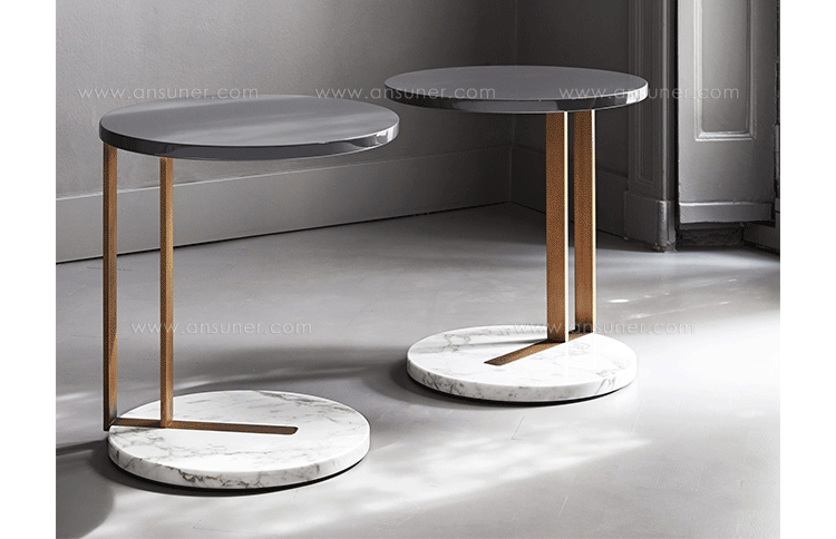 各种大理石茶几与基岩层或饰面漆木、青铜镜。
