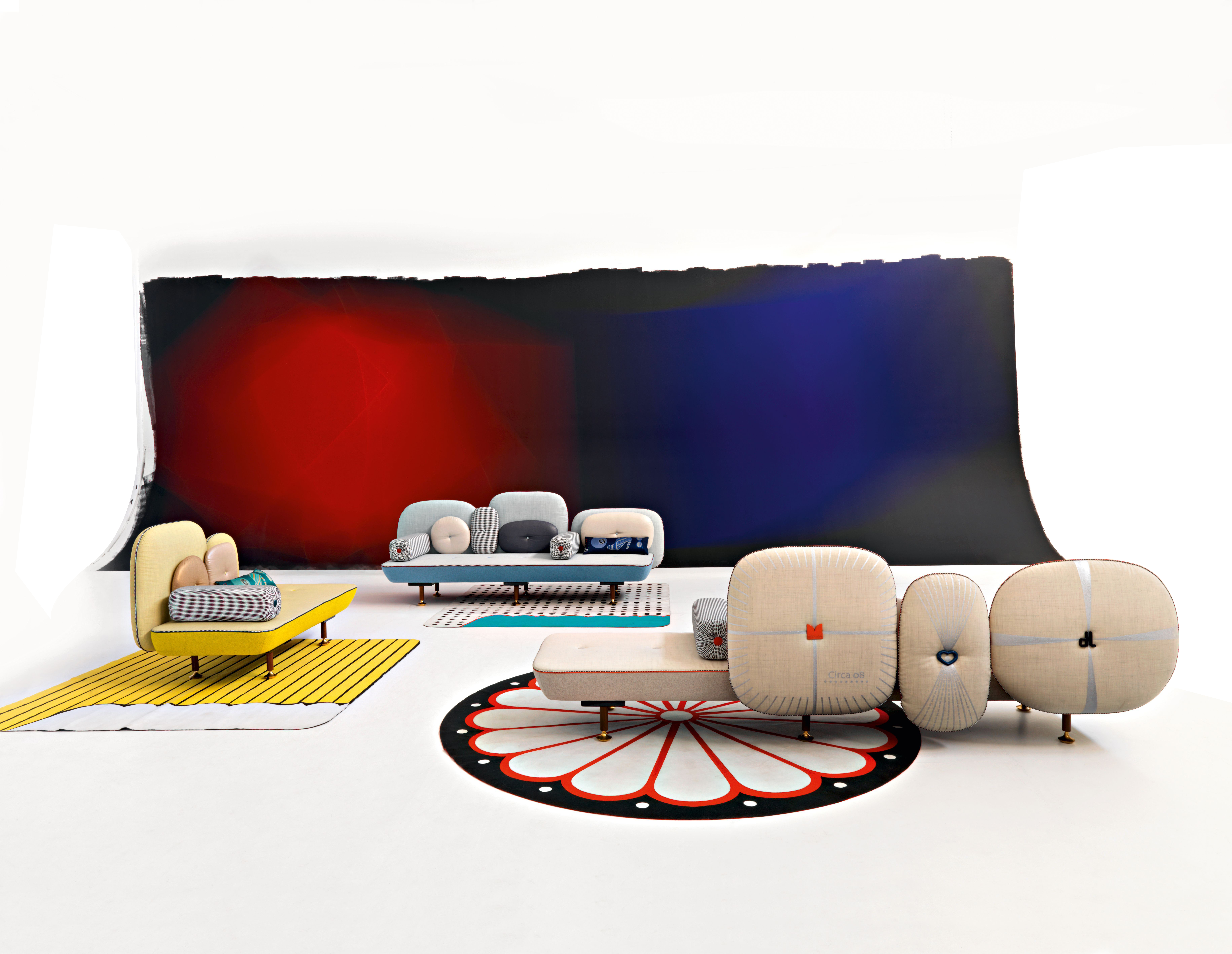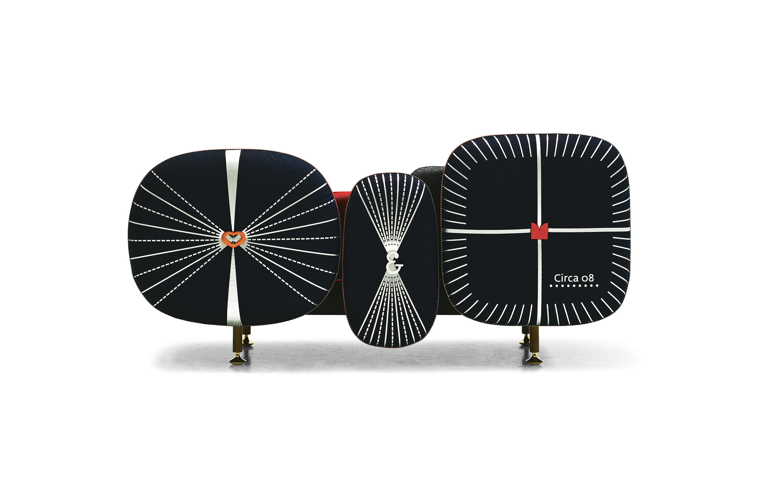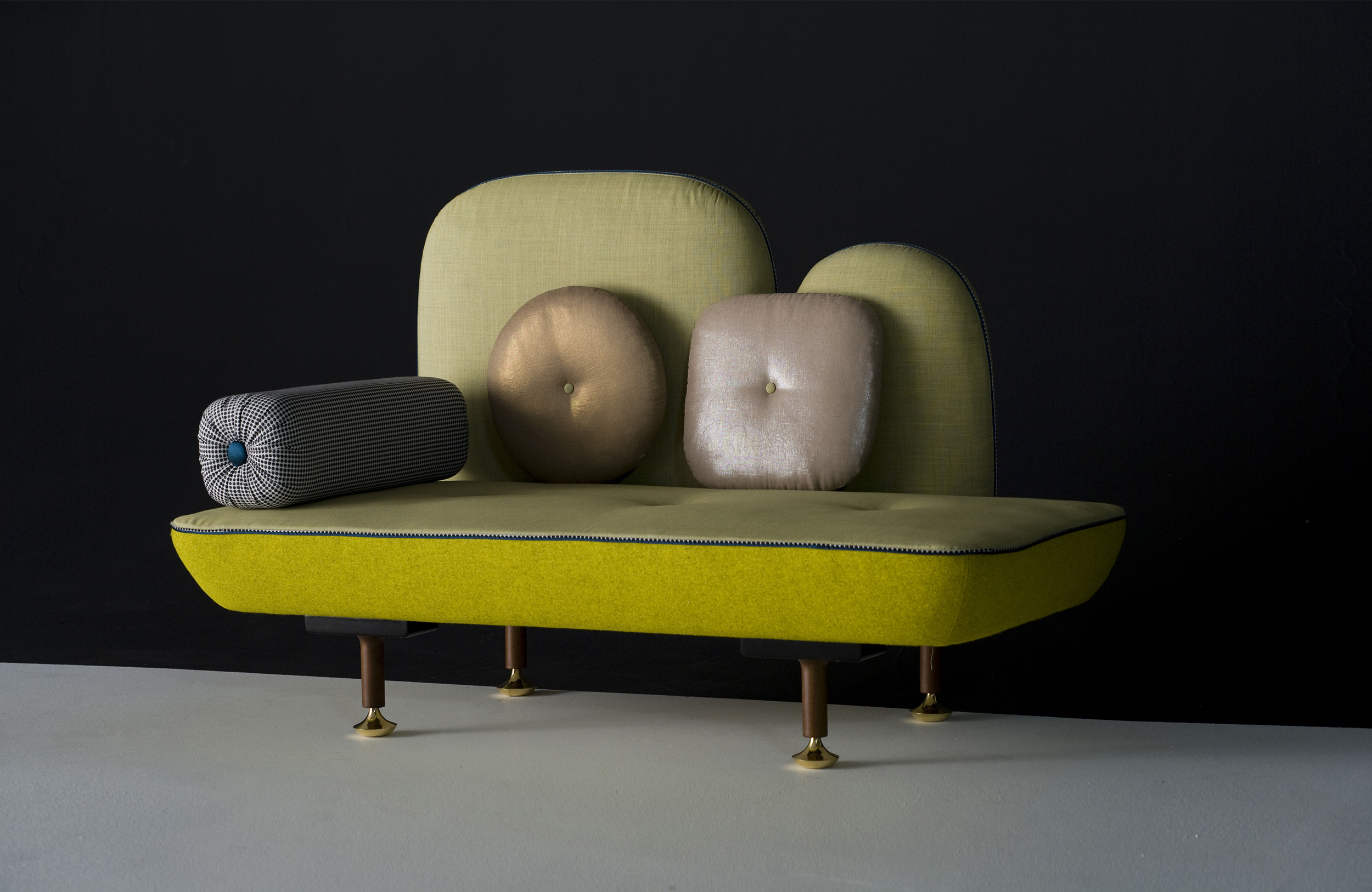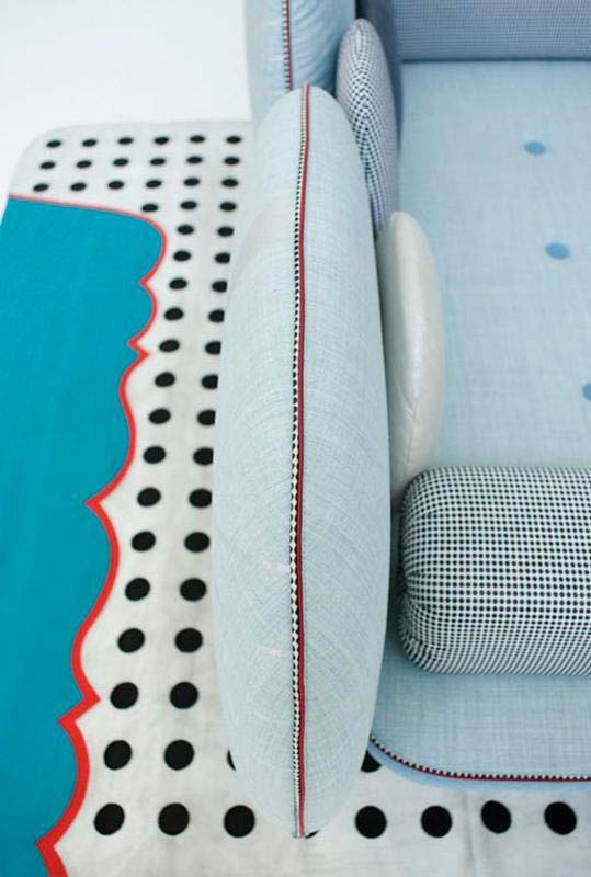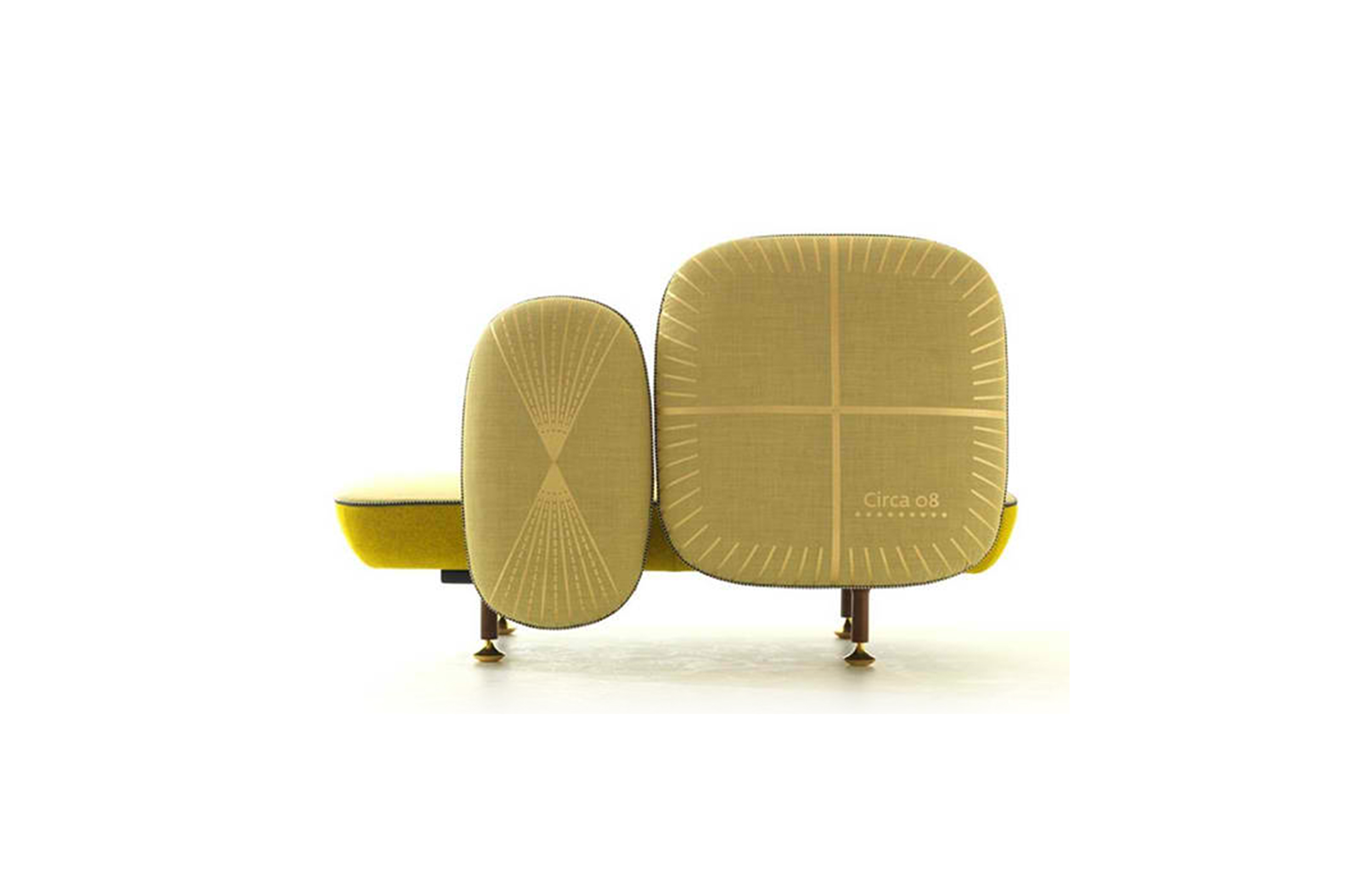 我美丽的背面是一个座椅的集合,它的靠背是由各种形状的高颜色的浮动靠垫组成。座椅越宽,可以使用的垫子就越多。我们使用超大的符号,比如靠垫上的按钮,是一种传递各种信息的方式。这些符号也提供了一种定制椅子的方法,让它变得独一无二,就像你对一件衣服的区别一样。上面的床垫上覆盖着不同的物品,因为他们从一个现代的公主身上得到灵感,他们用金和银镶边。
