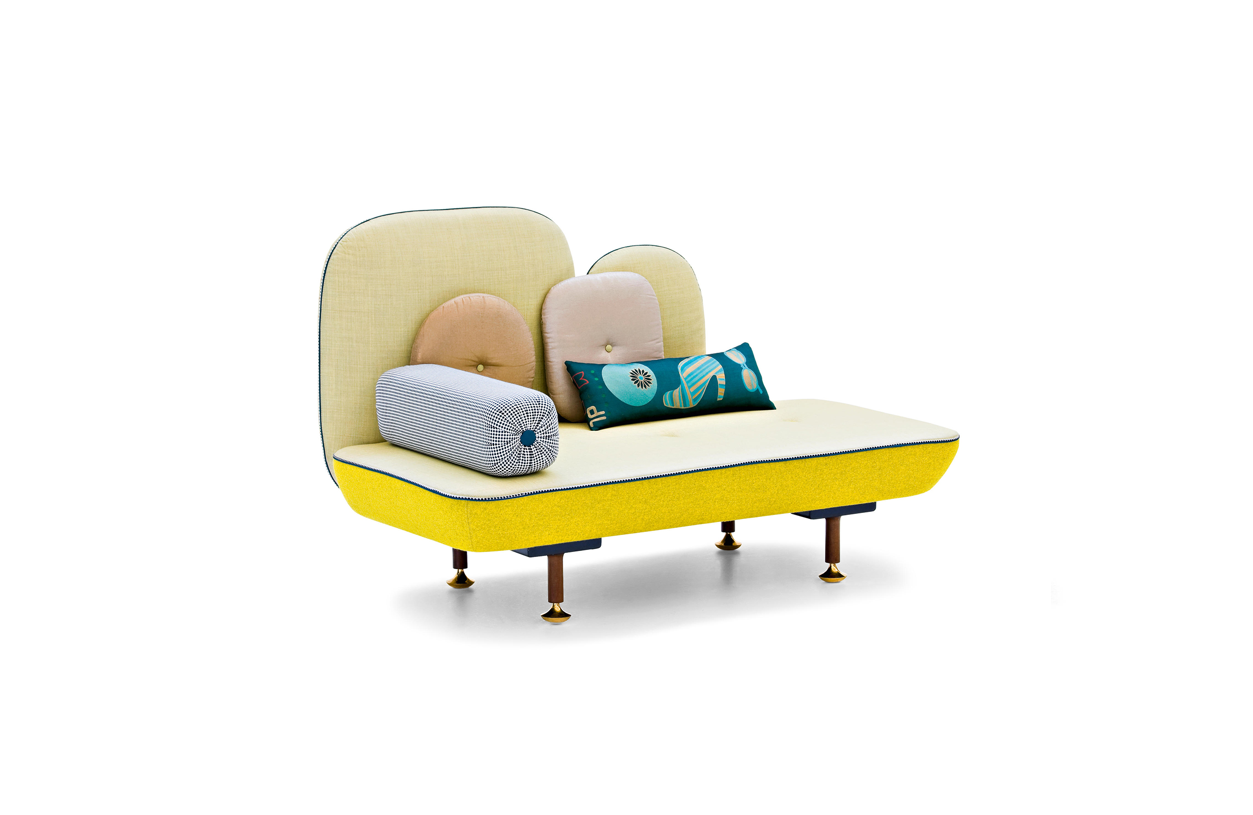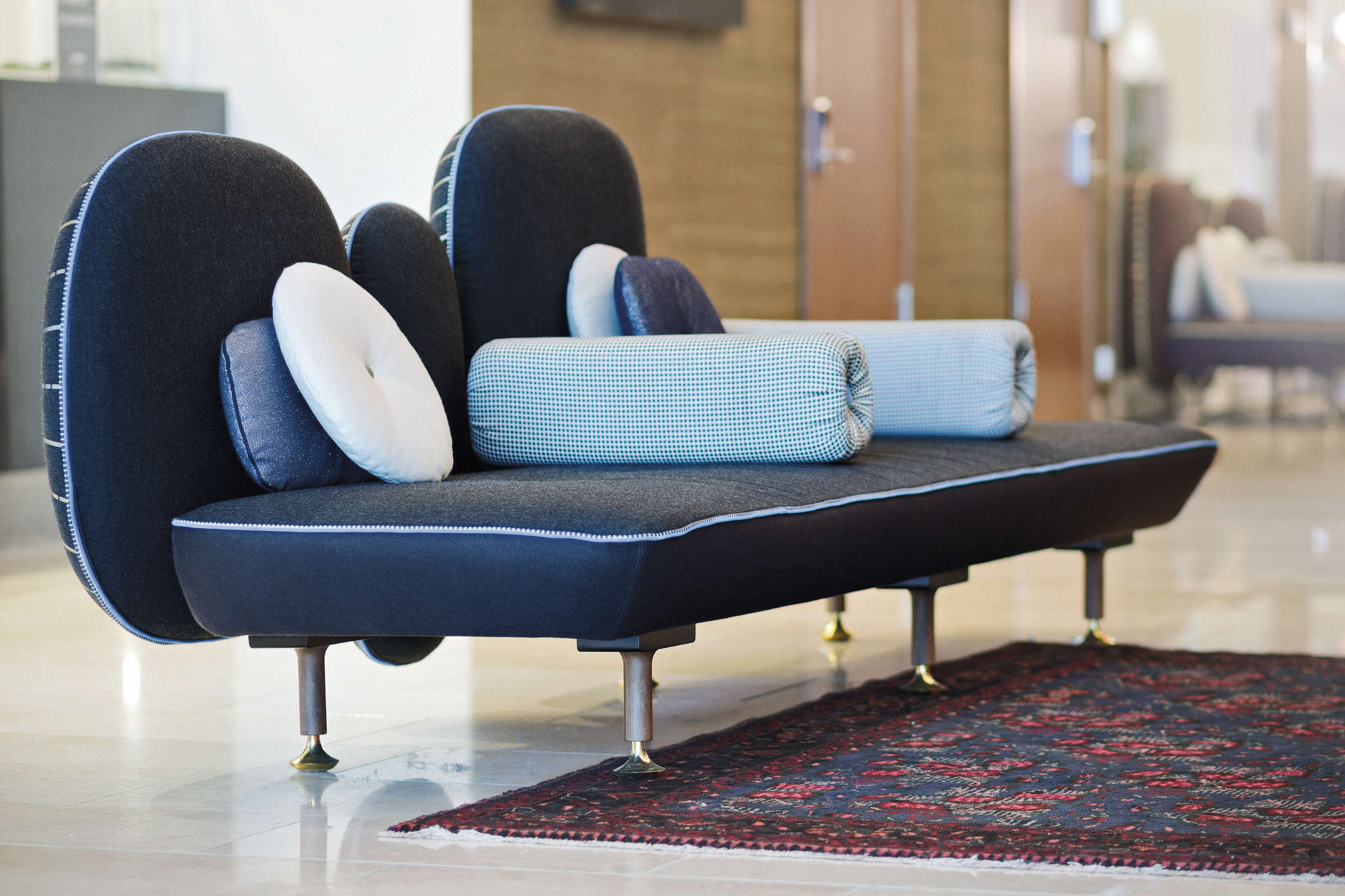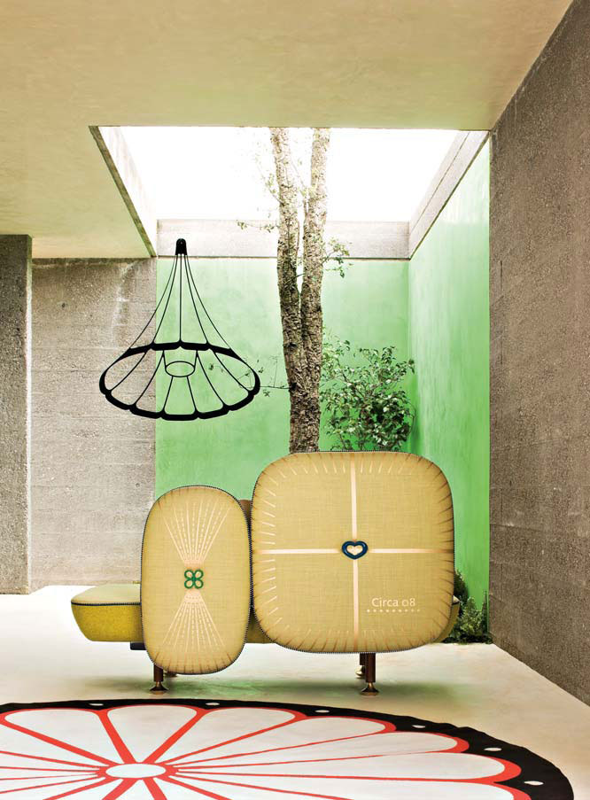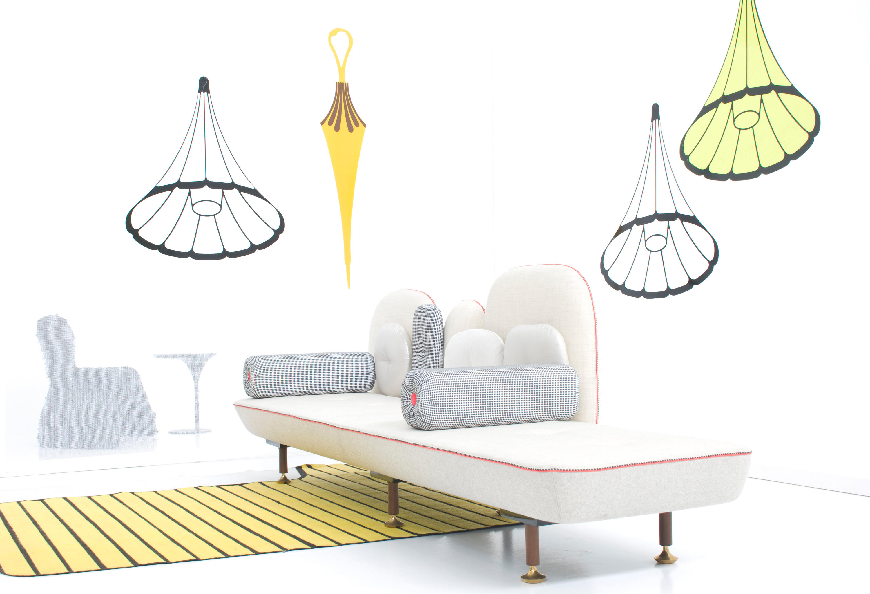 我美丽的背面是一个座椅的集合,它的靠背是由各种形状的高颜色的浮动靠垫组成。座椅越宽,可以使用的垫子就越多。我们使用超大的符号,比如靠垫上的按钮,是一种传递各种信息的方式。这些符号也提供了一种定制椅子的方法,让它变得独一无二,就像你对一件衣服的区别一样。上面的床垫上覆盖着不同的物品,因为他们从一个现代的公主身上得到灵感,他们用金和银镶边。