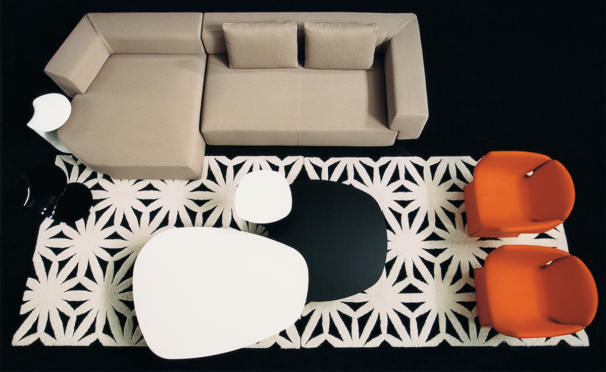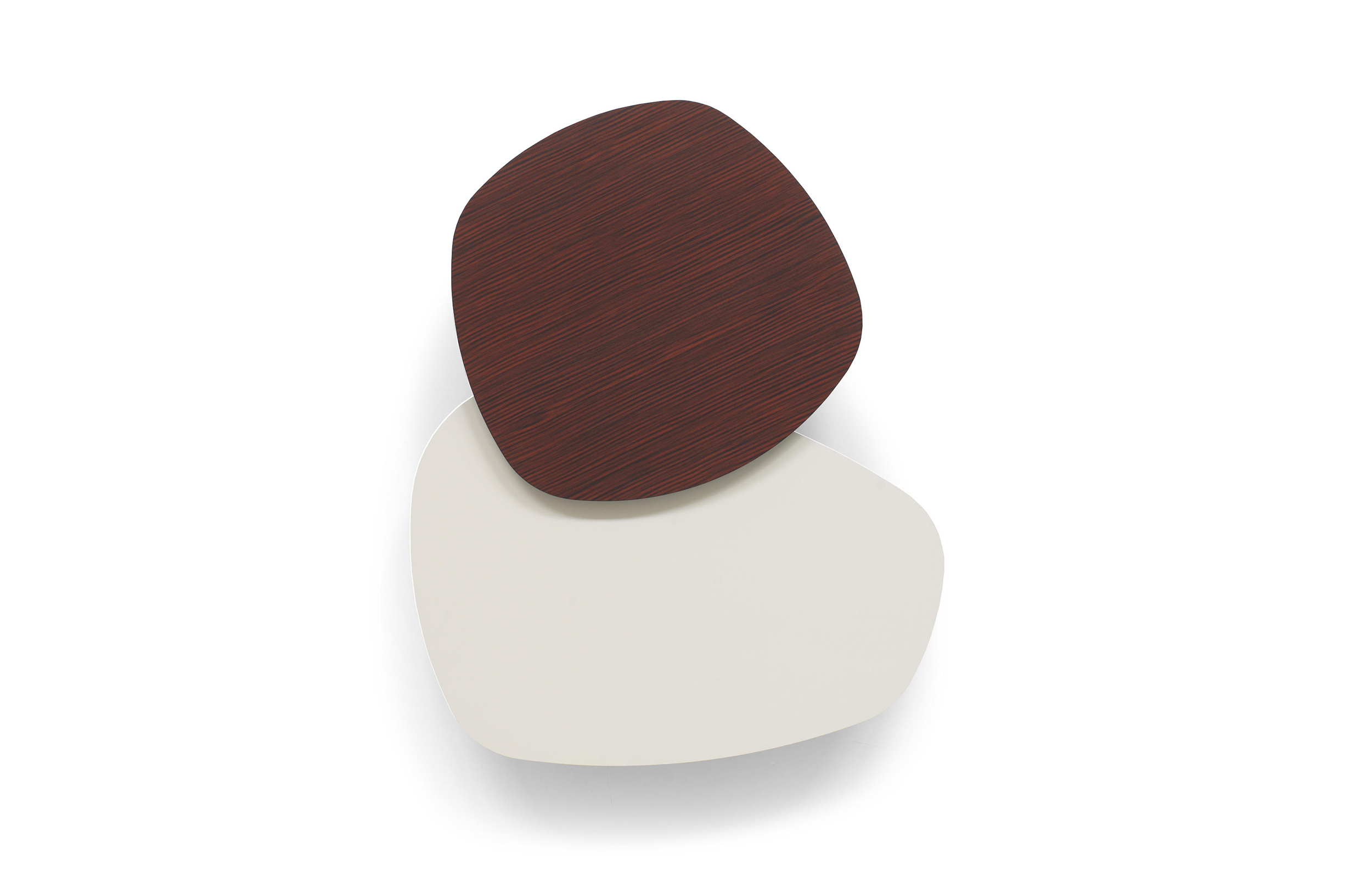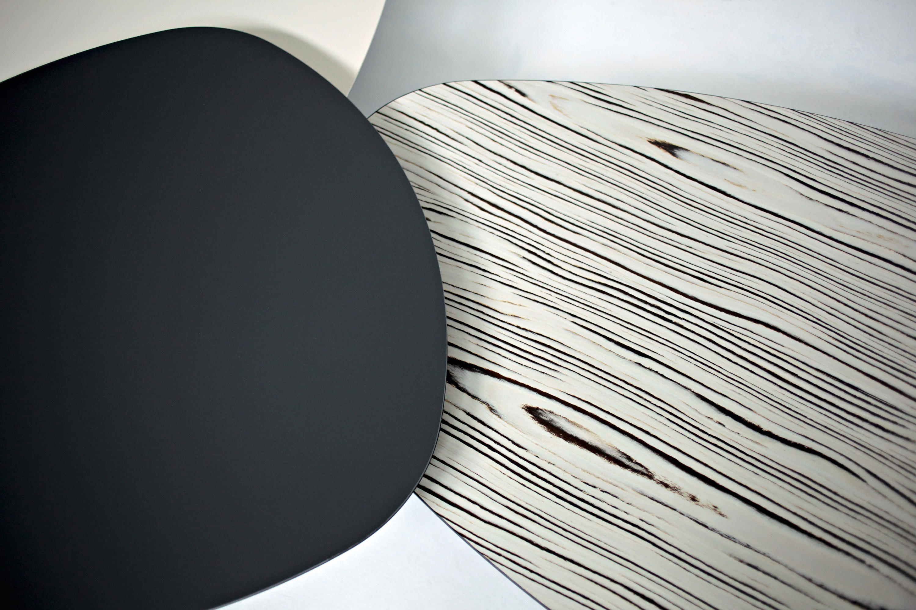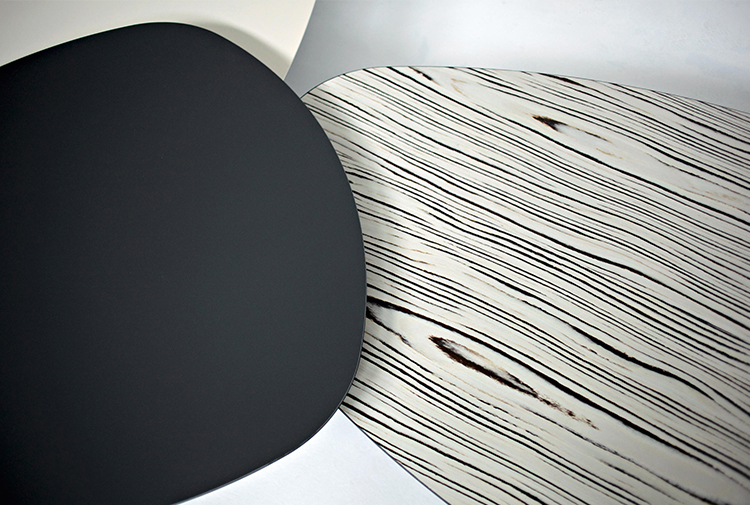 两张桌子,水平的表面,如有机形体的二维投影,相互滑动,重叠。结果是一种不均匀且和谐的结构,由地板的材料和颜色的选择而增强。菲尼克斯,名字来源于阿拉伯神话中的不死鸟,在火焰中死去,从灰烬中涅槃,没有任何痕迹;更确切地说,是科幻小说——《星际迷航》中的“菲尼克斯号”。