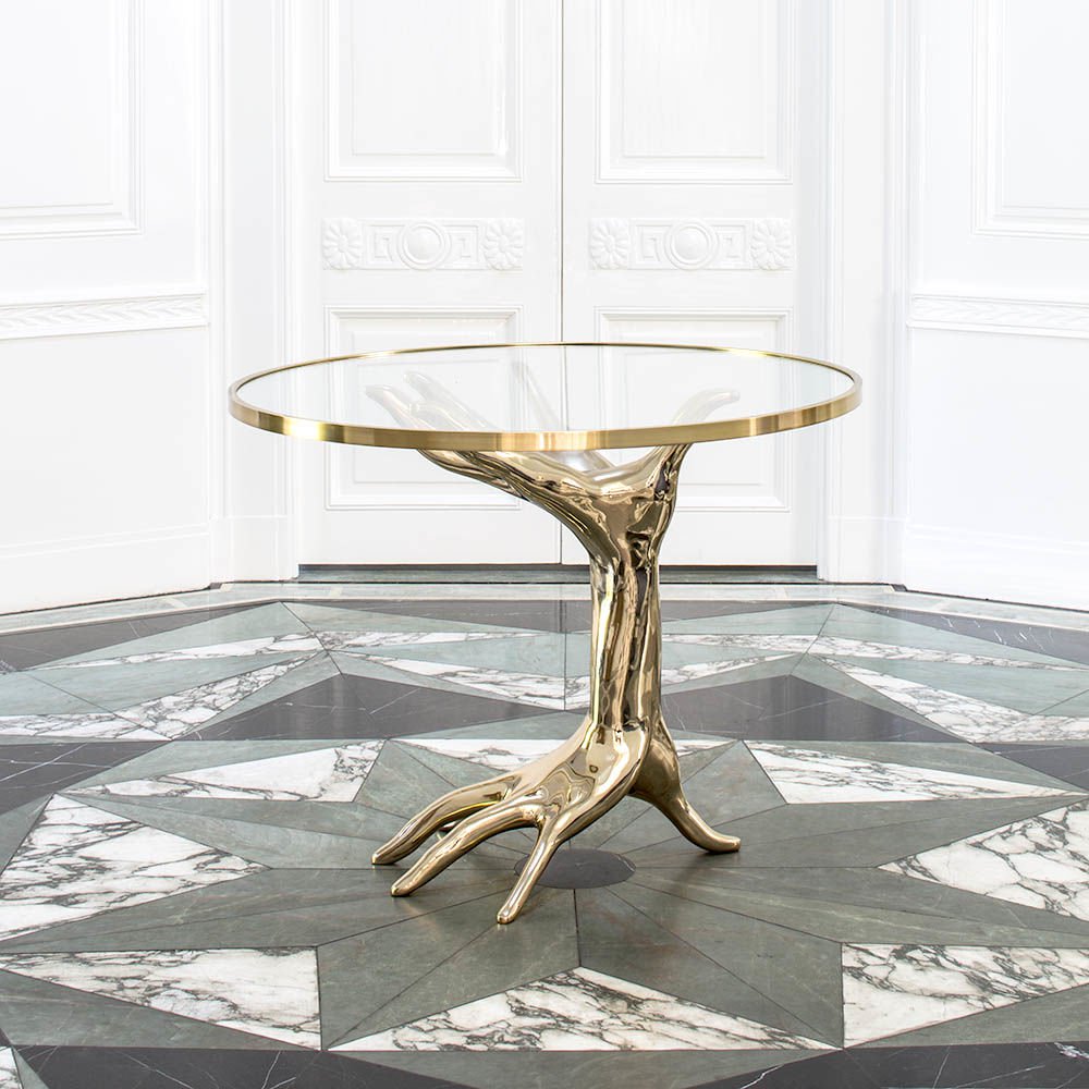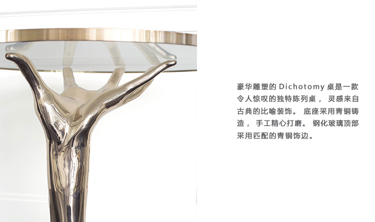 豪华雕塑的Dichotomy桌是一款令人惊叹的独特陈列桌,灵感来自古典的比喻装饰。 底座采用青铜铸造,手工精心打磨。 钢化玻璃顶部采用匹配的青铜饰边。 直径36英寸,这张桌子是一个完美的入口,或强调一个正式的座位群。 Dichotomy桌有青铜或油擦青铜饰面。