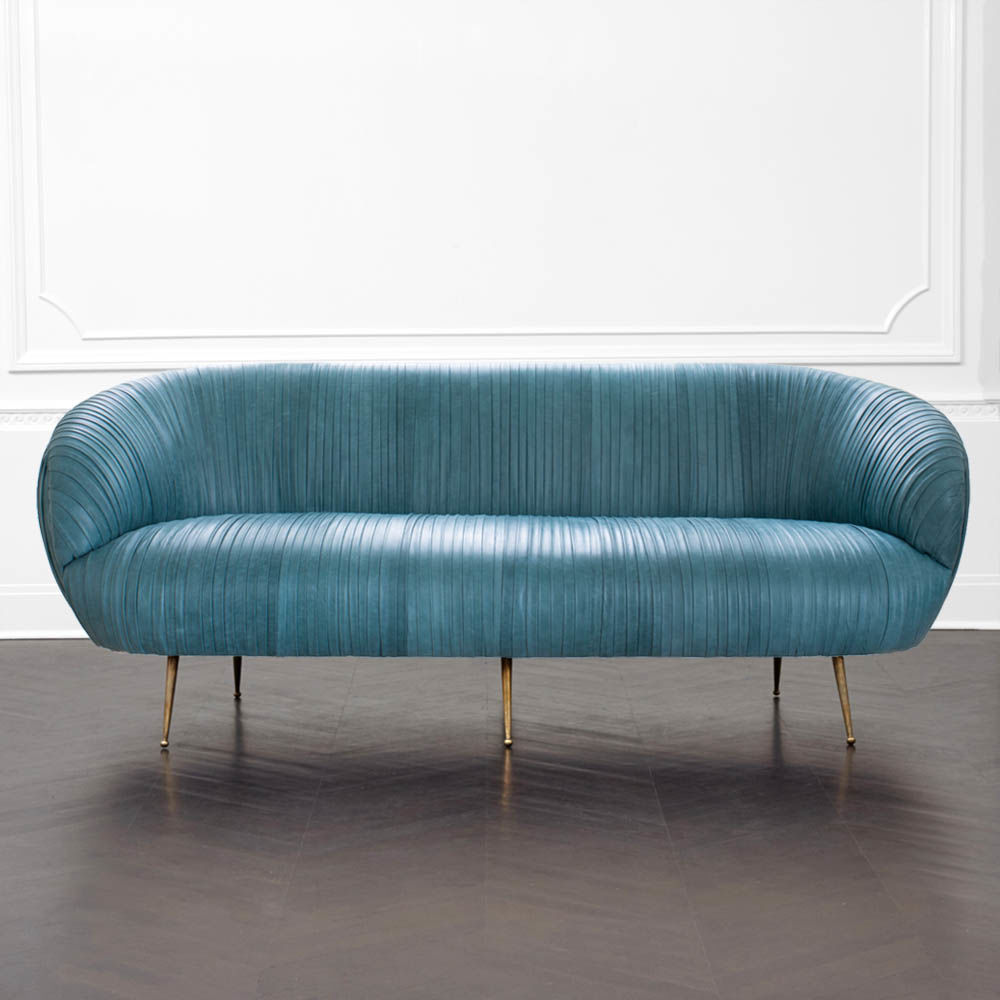 这款沙发的精致线条采用标志性褶皱皮革细节设计。 窑干硬木框架采用双榫和胶合,配有8向手工弹簧。 全面的蔬菜染色小羊皮手工缝制在框架上。 这款精致细腻的豪华沙发坐落在坚固的青铜铸造的锥形腿上。 完美适合厨房长椅,客厅或床边。