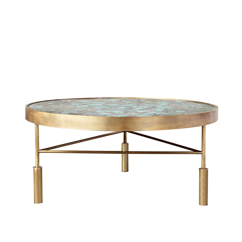 Sedona咖啡桌采用抛光和抛光的半宝石亚马逊石制成,采用抛光黄铜框架。每件作品都是独一无二。