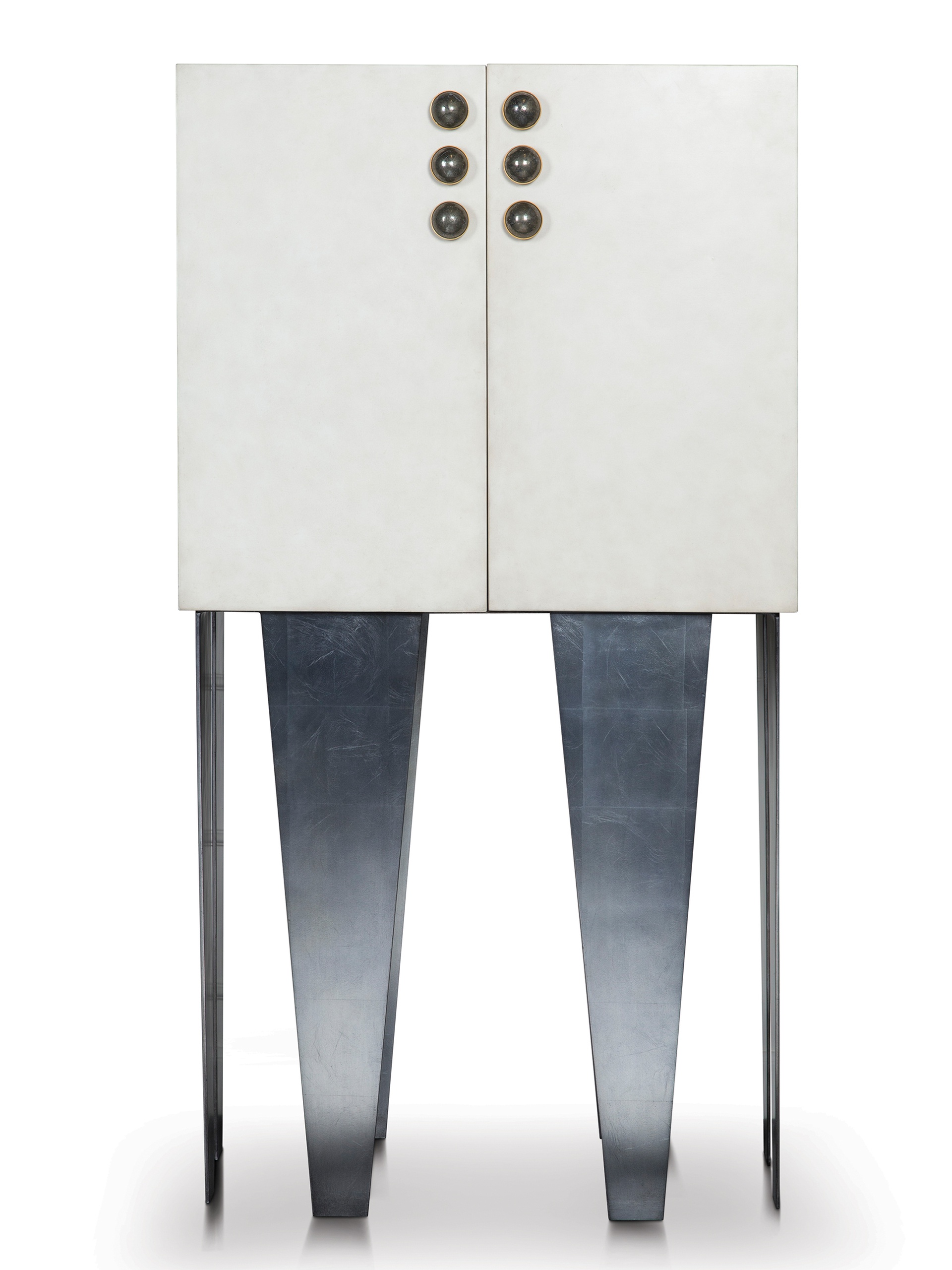 格里菲斯柜子装饰有手工挑选的半月形黄铁矿石,镶嵌在优雅的青铜框架中。 黑色或抛光的青铜色饰面交替出现,凸显了凯莉对混合金属色彩和原始自然细节的亲和力。 钢底座,羊皮纸外包装和天然胡桃木内部抽屉。