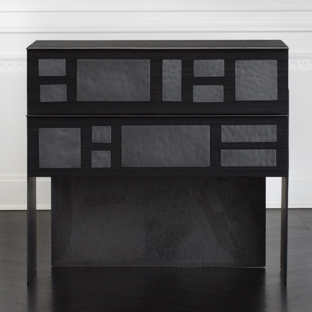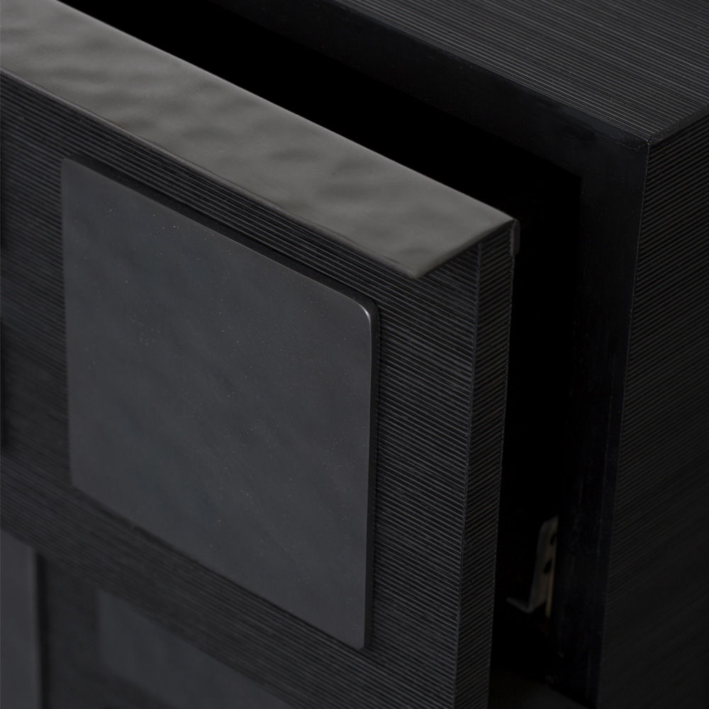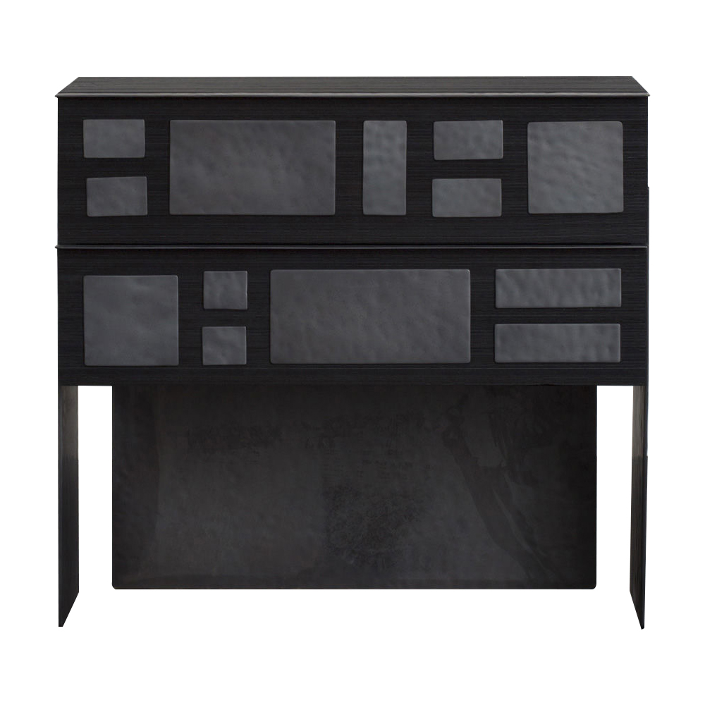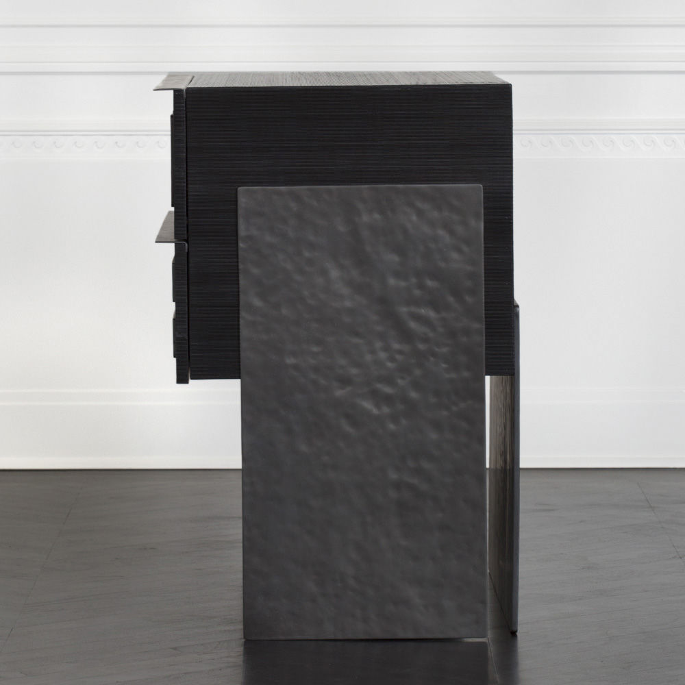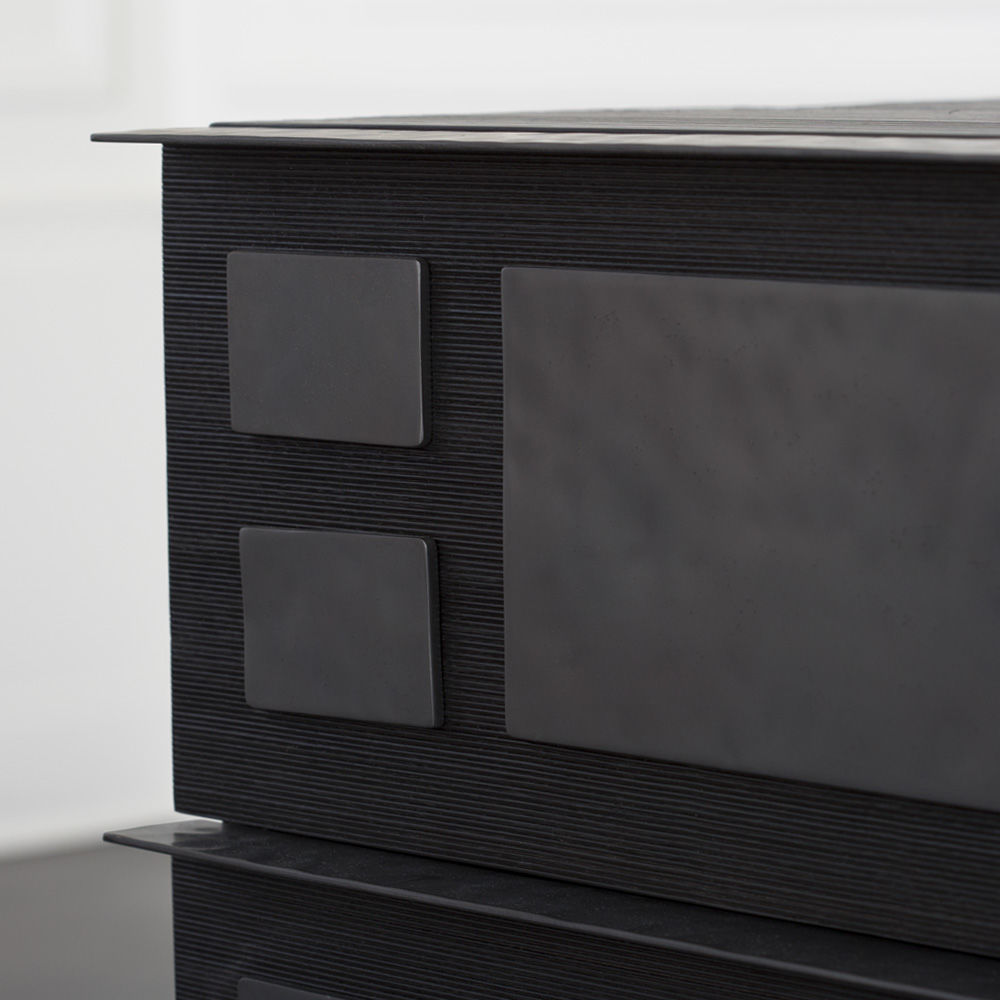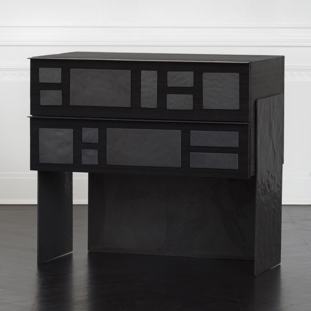 细腻的罗纹与Hyperion玄关柜的深层乌木饰面相结合,赋予这款柜子醒目的轮廓。 每块铸造黄铜都有手工锤打纹理和光泽的黑色饰面。 两个深抽屉在软关闭硬件上滑出。 这款柜子可以很容易地作为床头柜或配置在一个戏剧性的入口通道。
