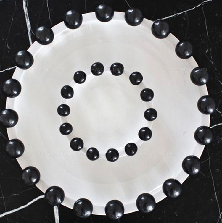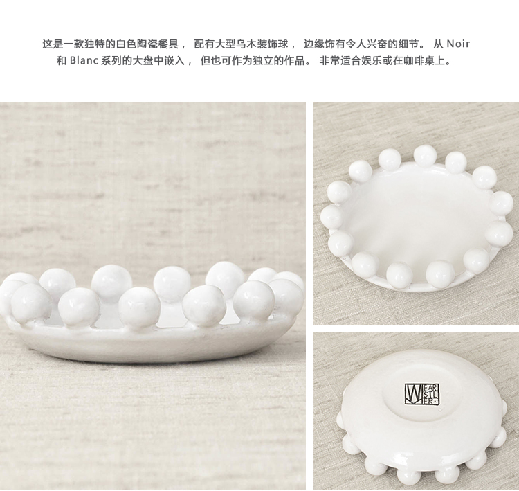 这是一款独特的白色陶瓷餐具,配有大型乌木装饰球,边缘饰有令人兴奋的细节。 从Noir和Blanc系列的大盘中嵌入,但也可作为独立的作品。 非常适合娱乐或在咖啡桌上。
