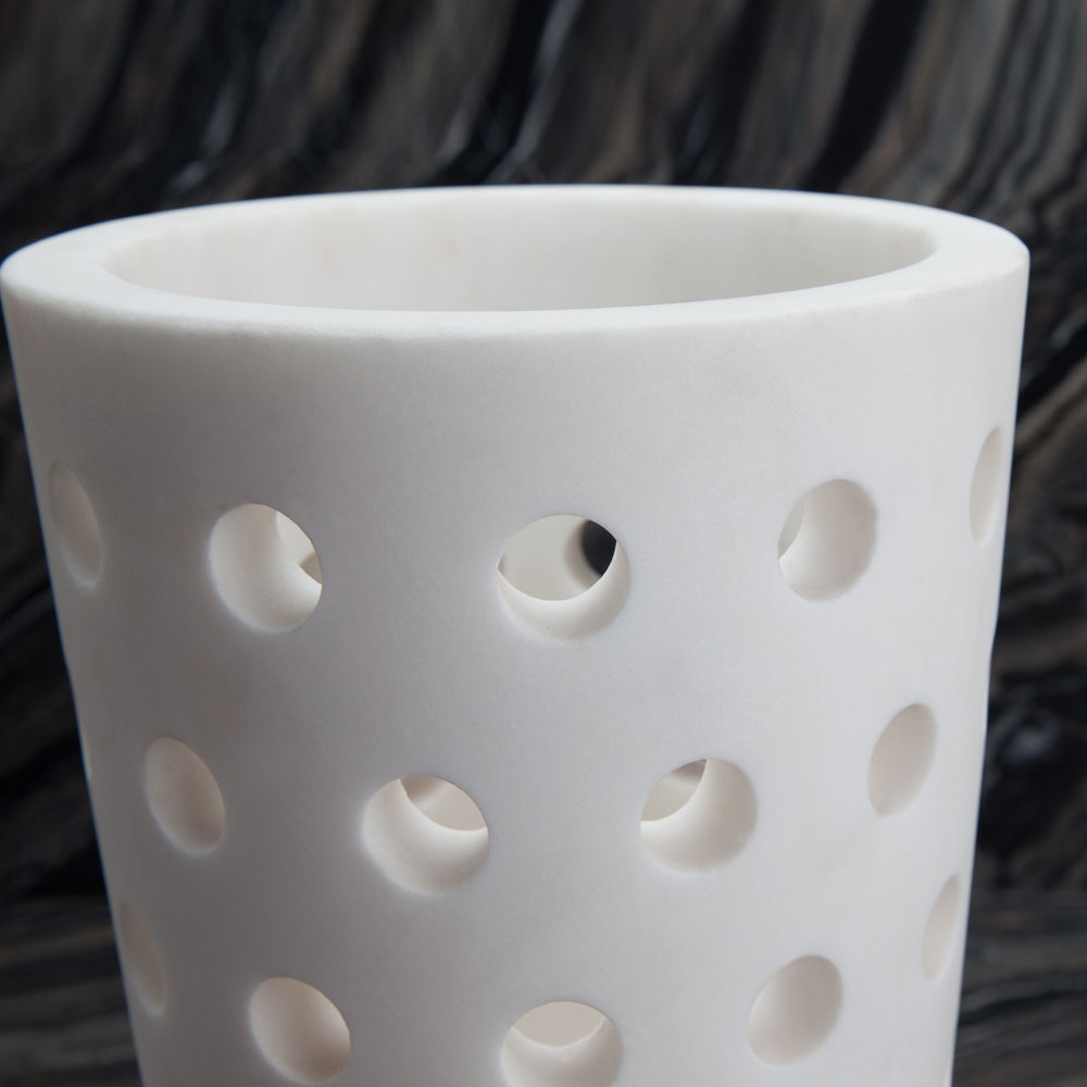 这款优雅且装饰精美的单品采用Kelly标志性穿孔细节设计,重新打造奢华的白色卡拉卡塔大理石,大胆装饰花卉布置或独立时尚。