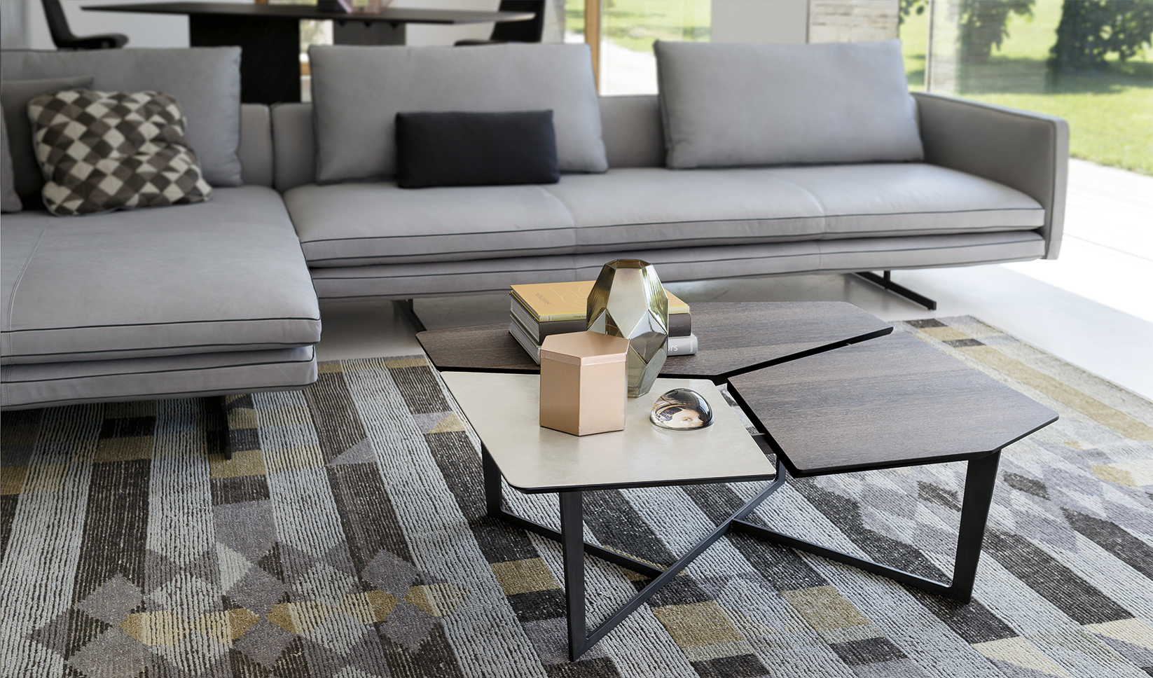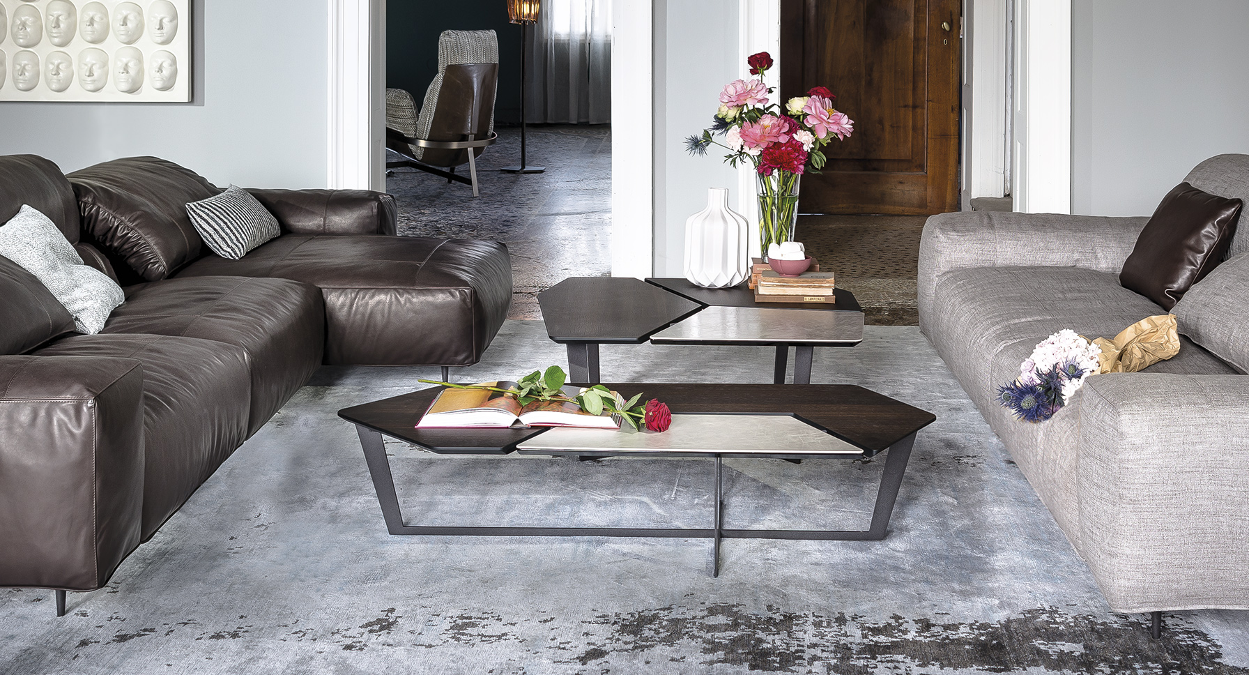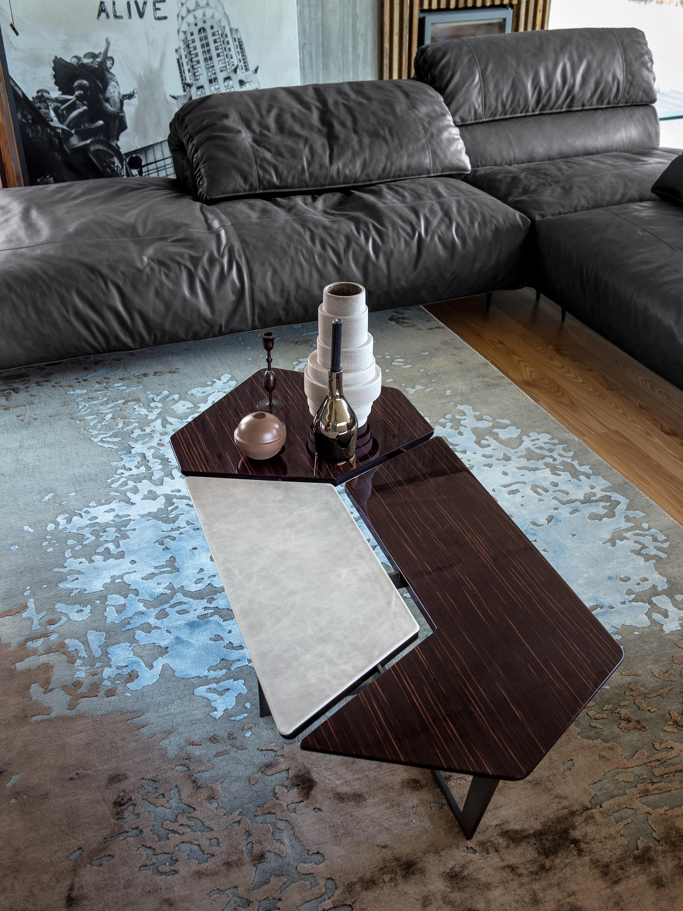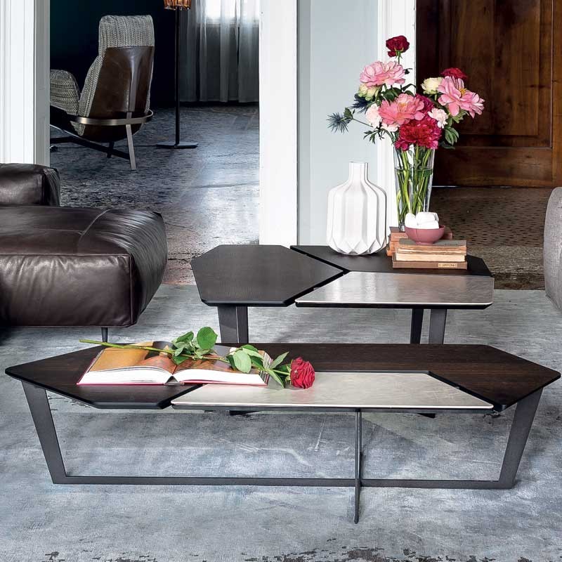 纳尔逊咖啡桌的主要特点是它的桌面。桌面被一个很深的缝隙分开但它们是由结构组成的。将木头和皮革等温暖的材料结合在一起组合成了不规则的几何形状的桌面。托斯卡纳传统的蔬菜鞣革是一种以多种颜色、独特香气和小瑕疵为特点的天然产物。