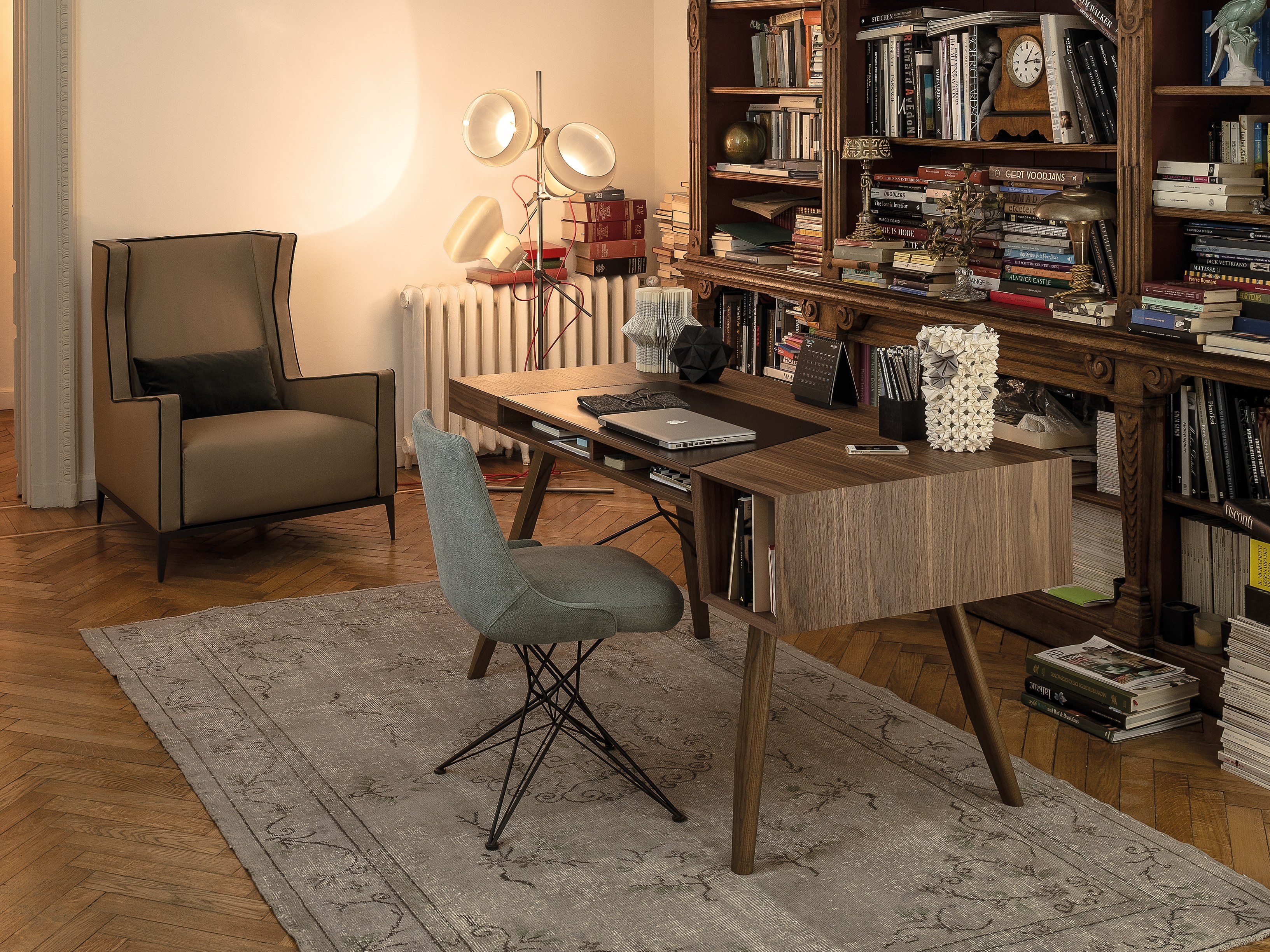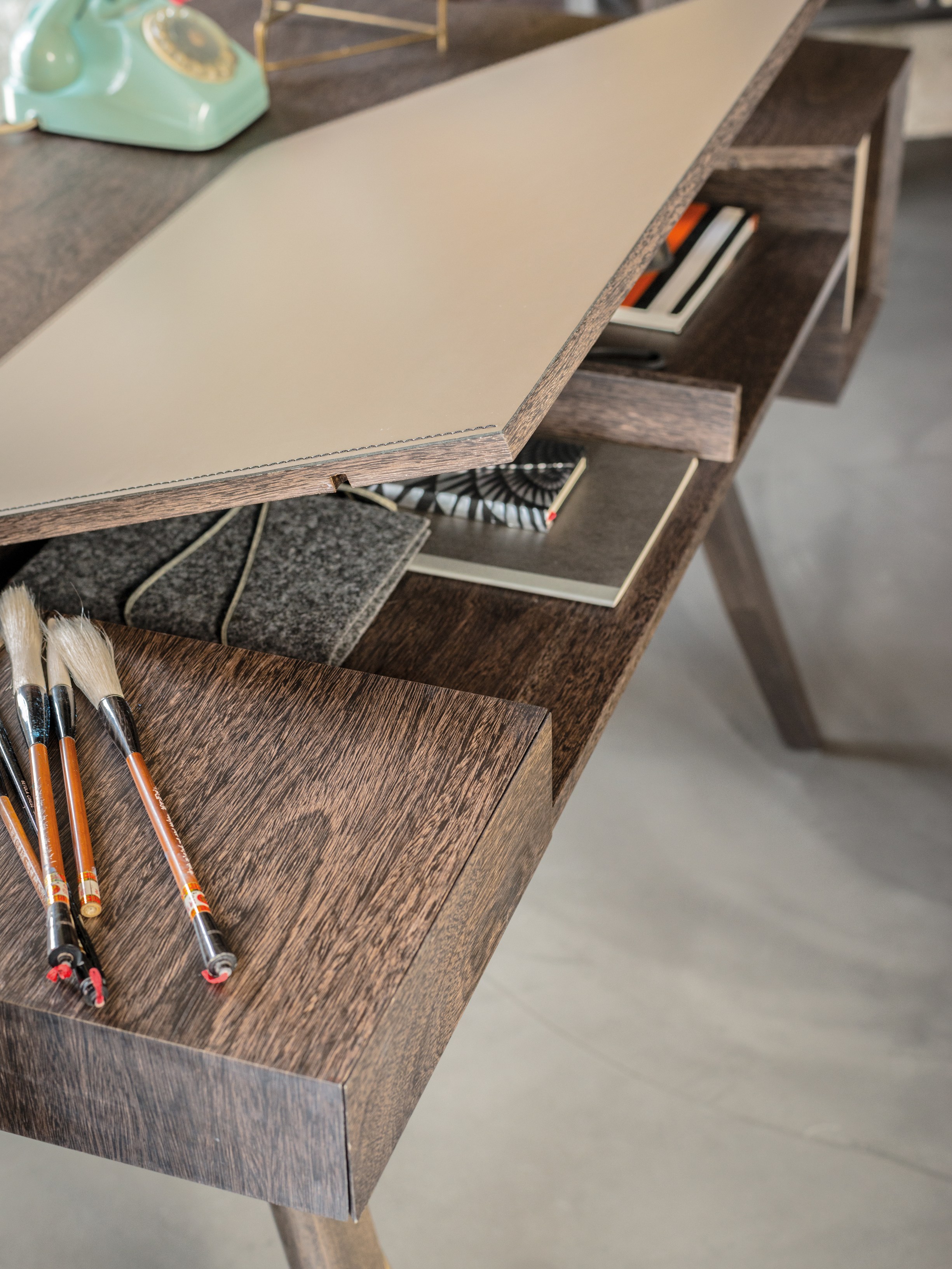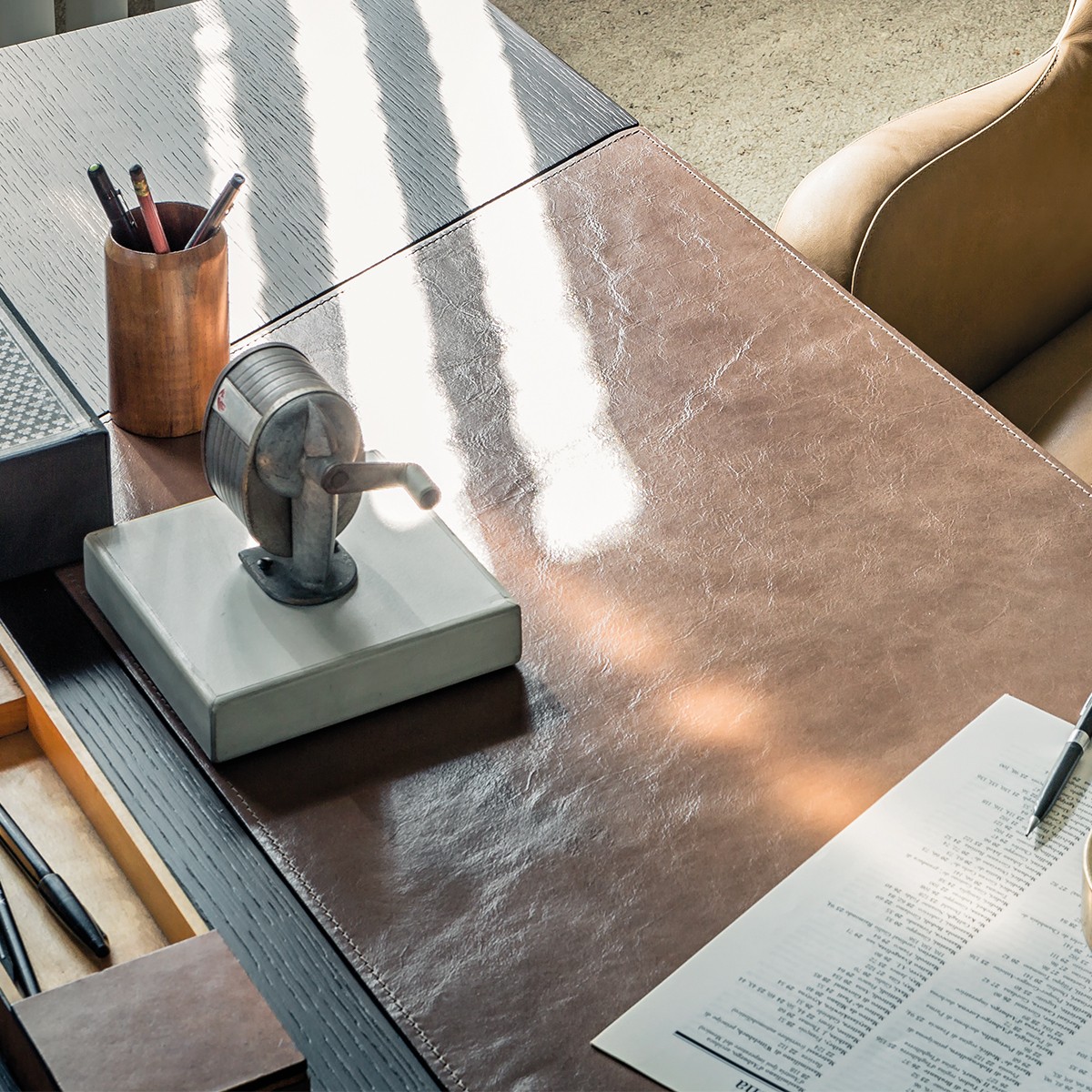 一个线性的、可适应的桌子,桌面配有皮革。这种金属镶嵌的纵横交错的底座让整个作品在纯粹的复古风格中增添了一种现代气息。抽屉的设计赋予了深度和功能,让它不仅是一个工作桌,还可以存放一些私密的文件。