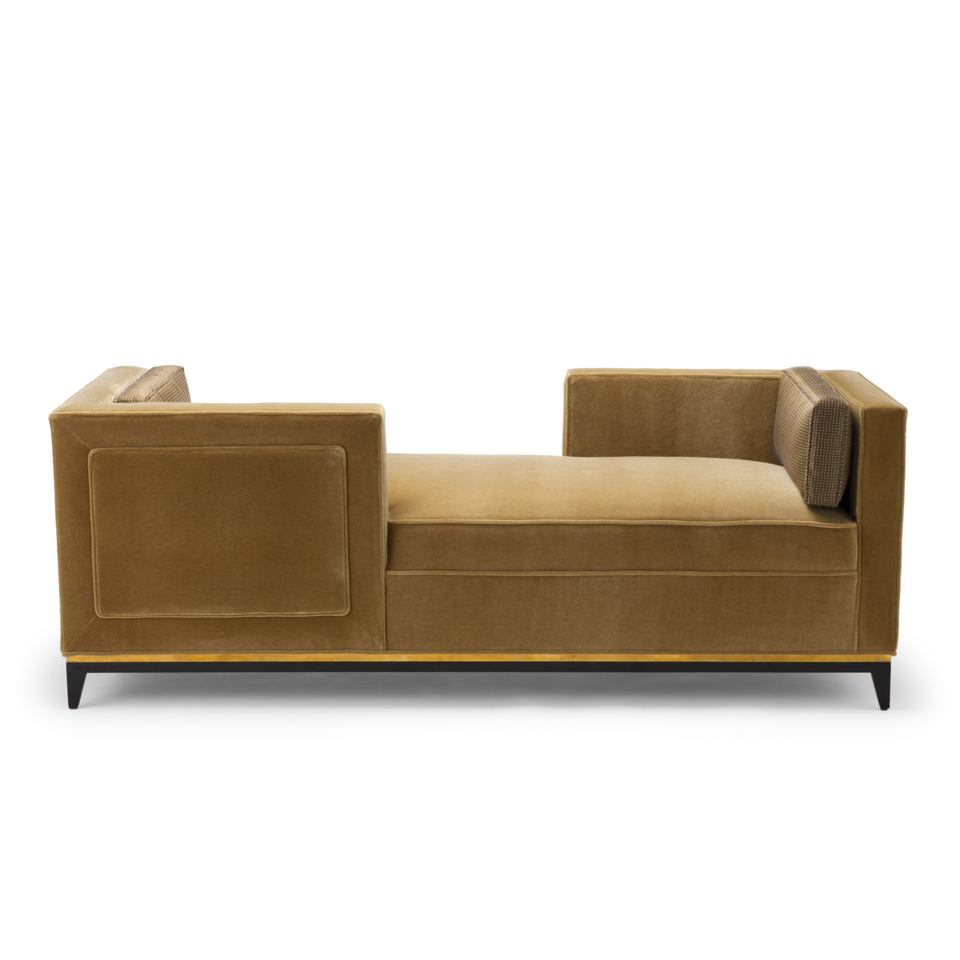 这里展示的是我们的“Camel”马海毛软垫,配有我们的Pixel面料垫子,未上漆的抛光黄铜金属条纹和美国黑胡桃巧克力黑檀木腿。