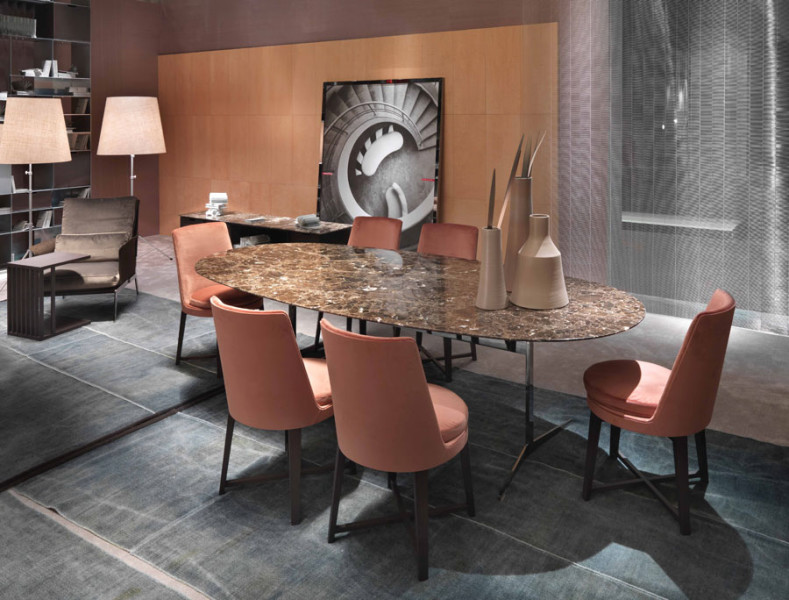 这是一张优雅的餐桌,也被解读成圆形的咖啡桌。CLARKE的金属结构是由腿部延伸到大理石或实木的桌面。桌面以一种不同寻常的椭圆形形式存在,同时保留坚定地结构。