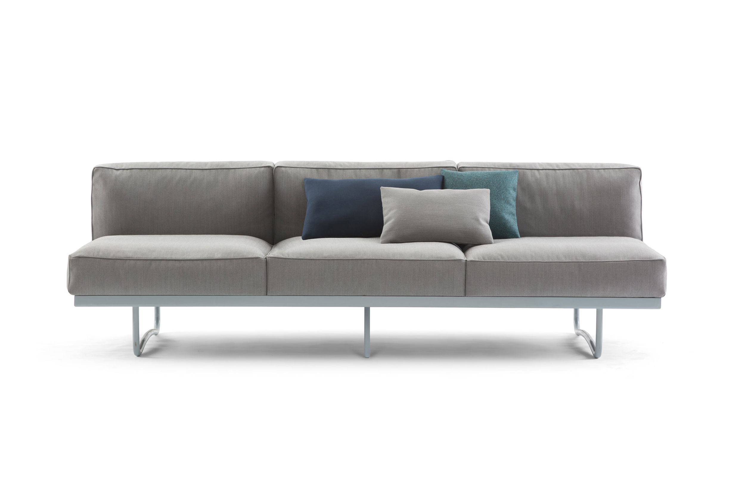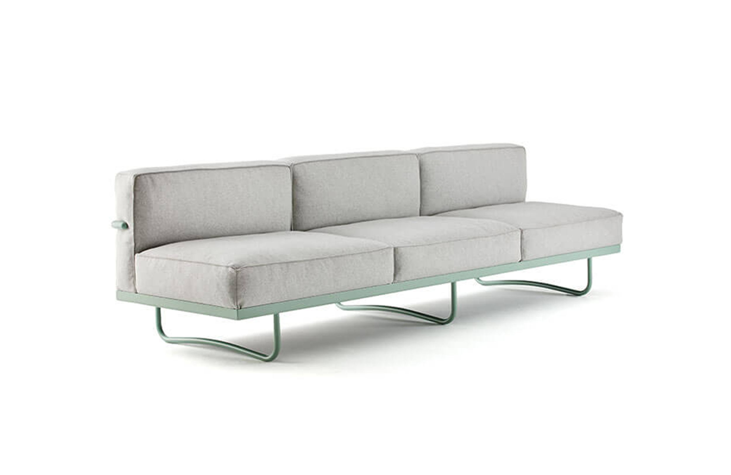这款沙发拥有抛光三价镀铬(CR3)钢质框架,哑光灰、亮蓝、绿色、咖啡色、大地色、象牙白或黑珐琅漆面钢结构。