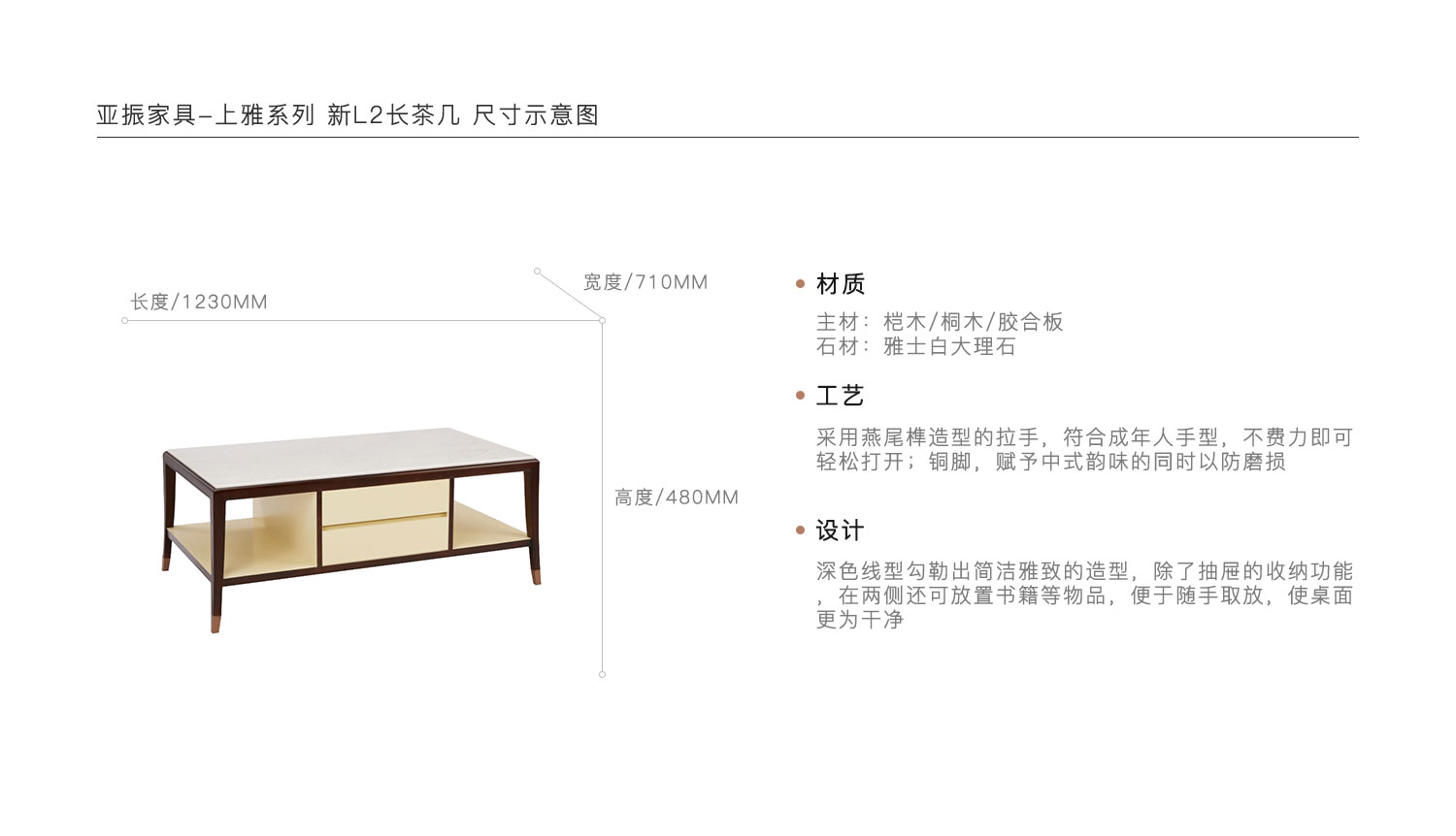 采用燕尾榫造型的拉手,符合成年人手型,不费力即可轻松打开;铜脚,赋予中式韵味的同时以防磨损。深色线型勾勒出简洁雅致的造型,除了抽屉的收纳功能,在两侧还可放置书籍等物品,便于随手取放,使桌面更为干净。