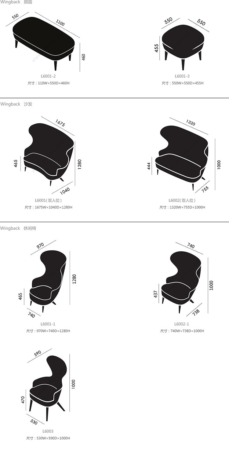 Wingback 长凳 系列尺寸/示意图