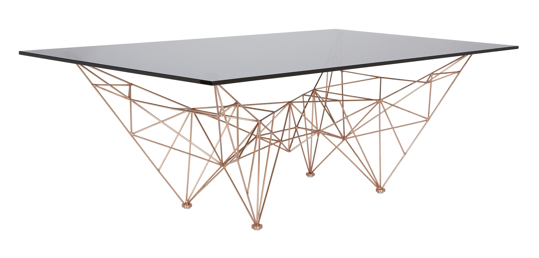 汤姆迪克森的灵感来自桥梁,塔和空间框架创造了这个美丽的塔咖啡桌。塔咖啡桌是一个焊接镀铜钢棒基础和烟熏玻璃顶部的组合。半透明,重量轻,功能强大的雕塑。