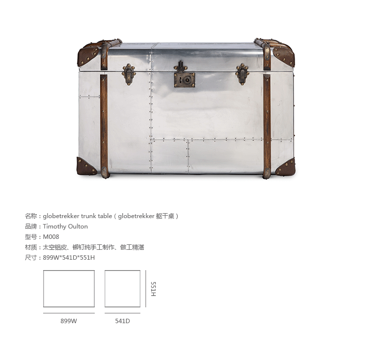 "慵懒、我行我素、精致、时尚,还有那么点怀旧的味道,Timothy Oulton家居的产品就是用这些无可替代的特点,征服了各国的英伦家具爱好者们。重提浪漫时代的长长的豪华海上航行,Globetrekker 系列的灵感来自Timothy Oulton于1914年在一个古董市场发现旅行箱,他深深的被复杂细节和美丽的黄铜板的旅行箱迷住了,Oulton拆解了那个古色古香的旅行箱并进行重新设计出一系列作品,它涵盖的灯表、 箱子、 咖啡桌和书柜等集合。捕获真正的魅力,还原精致工艺的旧古董皮箱的精髓,通过怀旧的贴纸饰面样式,采用老木、优质的老式皮革和黄铜铰链,通过精湛的手工处理完成了这套系列。