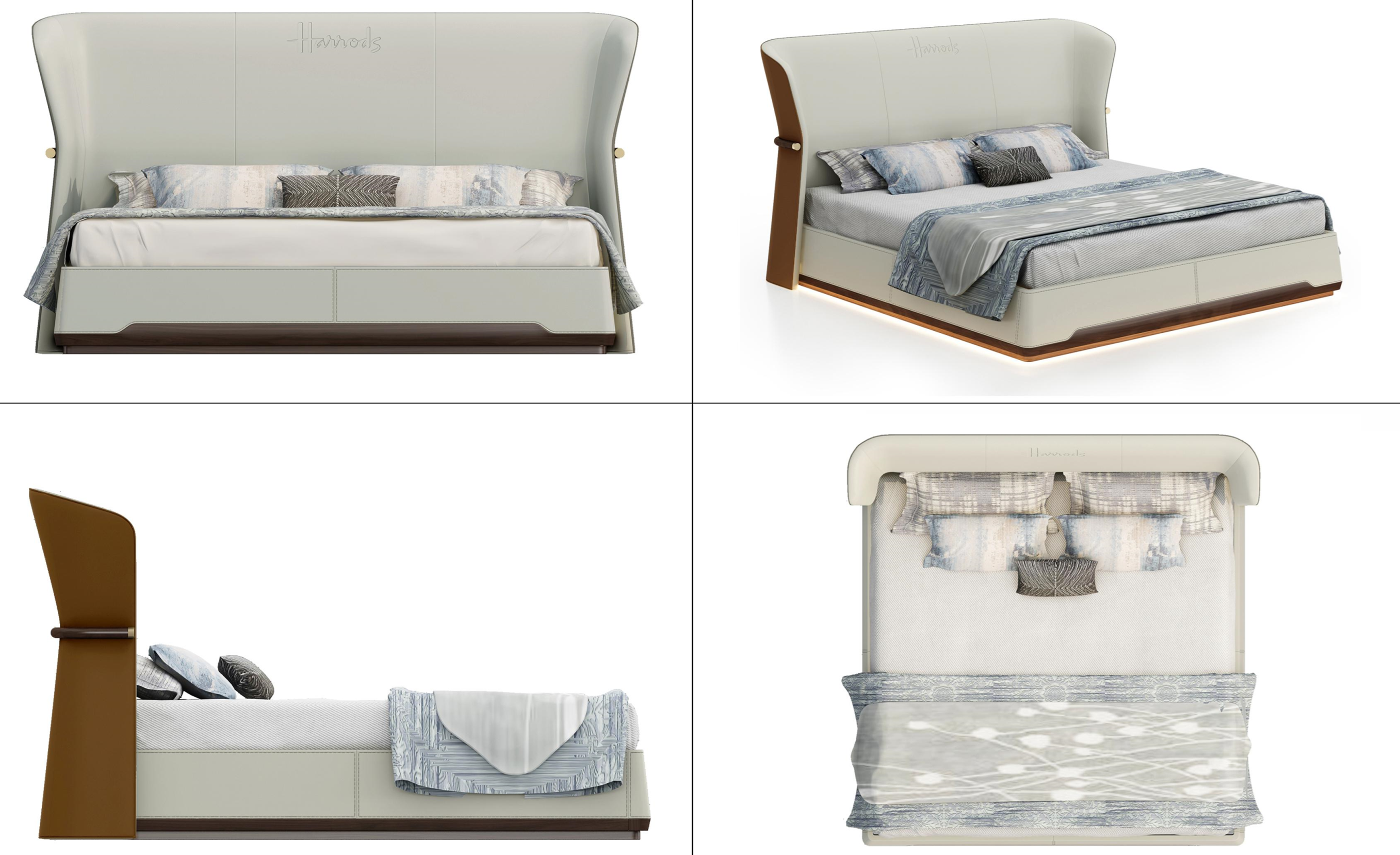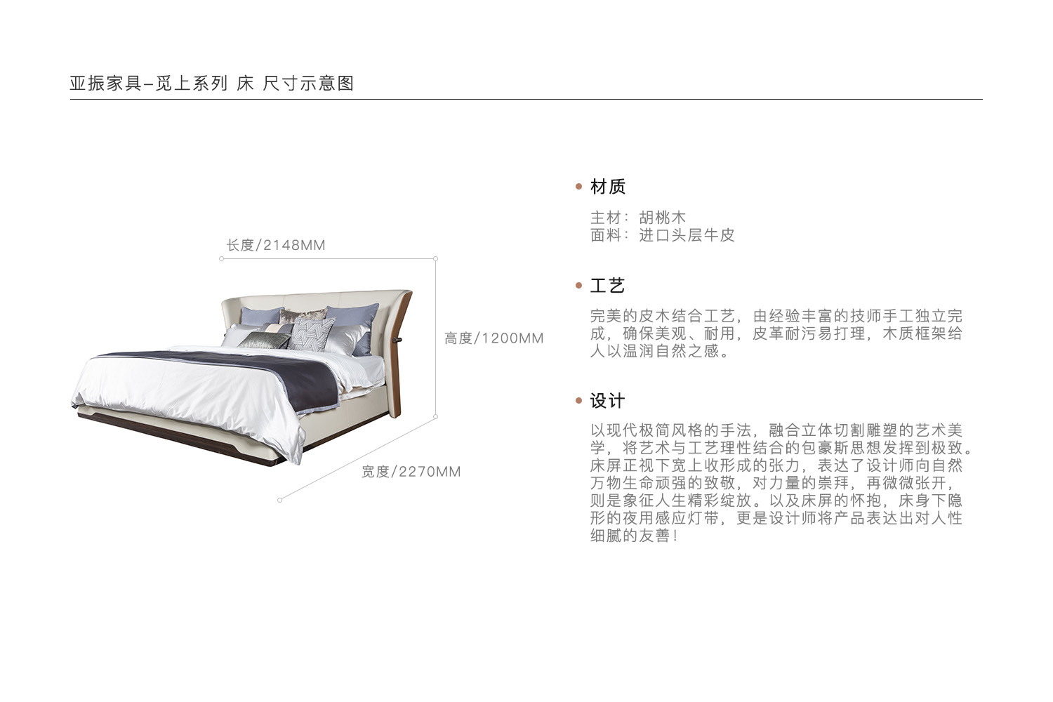 以现代极简风格的手法,融合立体切割雕塑的艺术美学,将艺术与工艺理性结合的包豪斯思想发挥到极致。床屏正视下宽上收形成的张力,表达了设计师向自然万物生命顽强的致敬,对力量的崇拜,再微微张开,则是象征人生精彩绽放。以及床屏的怀抱,床身下隐形的夜用感应灯带,更是设计师将产品表达出对人性细腻的友善!
