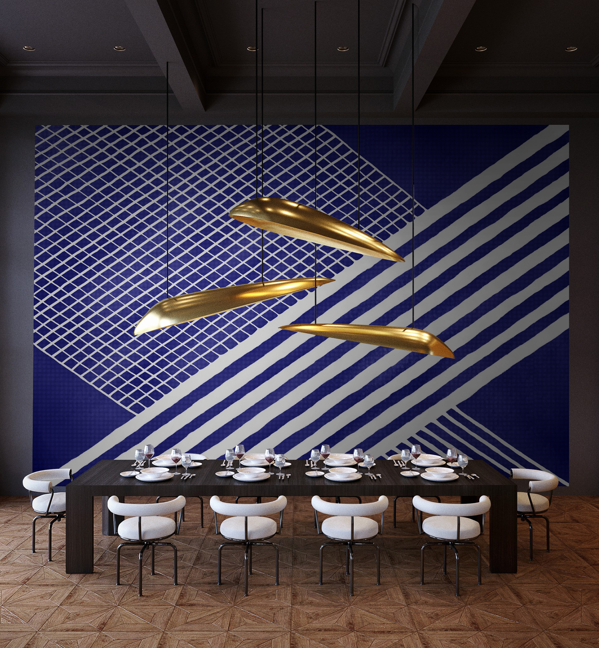 空间几何系列以点线面的构成作为创作主题,利用不同的构成方式,创造多样化的视觉效果,我们放弃了具体的内容和情节,突出运用这些纯粹的绘画语言来表现艺术形式的纯粹美;点、线、面和构成手法,就像是大厦的基石一样,看起来毫不起眼,但力量却无比强大,它是我们不断探索的源泉和情感表达的桥梁