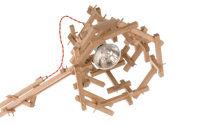 "in a brave new world imagination is free to produce a complex lamp with simple materials, translating the warm soul of the oak wood in a mechanic way.""the brave new world lamp by design duo fresh west started as a concept piece of random thought-initiated construction. Following the example of old far eastern bamboo scaffolding or simply of our childhood meccano creations, the brave new world lamp was developed without a design or plan in place. Nevertheless each piece of wood is carefully notched and pegged together to form an integral part of the overall mechanical structure." Material: Oak frame and cast iron balancing weights"
