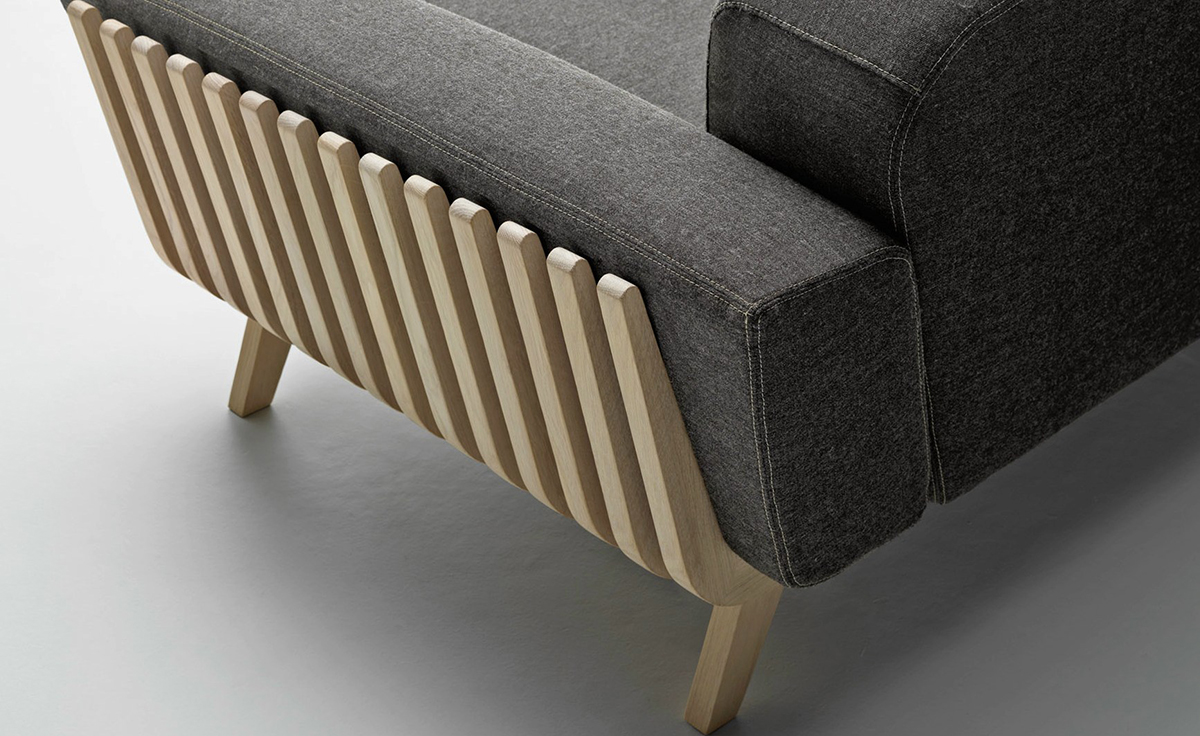 Hamper 单座沙发由意大利设计师Ezio Riva和Arturo Montanelli共同设计。他们以实木为主材为意大利Passoni Nature公司设计了两款:Hamper 1-seater Sofa(Hamper 单座沙发)及Hamper 2-seater Sofa(Hamper 双座沙发)。纯粹的北欧风格设计,简约大气。Hamper沙发椅外部可见的框架由十四根实木板条平行组成,形成了一个类似篮子的形状。整个家具的构成有软垫座椅、靠背和扶手,淡灰色调的厚实坐垫极其柔软舒适,天然木质的承压框架散发着大自然的亲切气息,两者搭配和谐,相得益彰。Hamper单座沙发作为一个极简主义风格的家具设计方案,有着强烈的视觉冲击力。