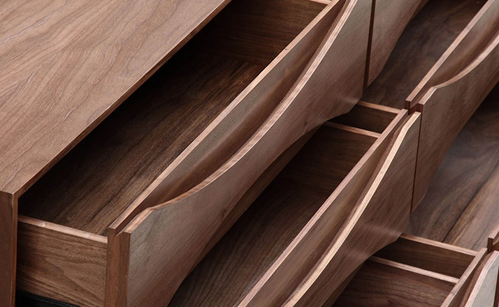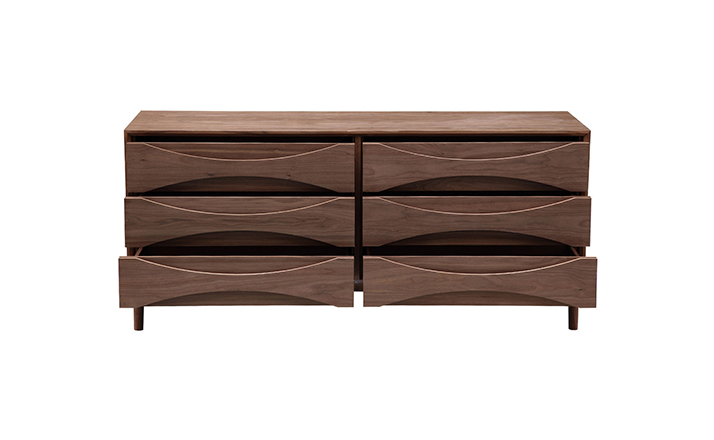 arne vodder retro lowboy dresser(arne vodder复古短脚衣橱梳妆台)是Kardiel公司制作的经典实木家具,具有世纪中期的现代风格,6个滑动式抽屉通过精心制作,提供足够的空间存放衣物或其他物品。在现代主义的存储家具上, Finn Juhl和 Arne Vodder 最先尝试胶木和天然木的组合运用。这是大胆的创新,他们结合传统的新鲜的新兴技术与现代主义的概念。制作采用精选MDF板基材胡桃木或水曲柳木皮贴面、胡桃实木或水曲柳实木脚架、环保油漆喷涂、做工精湛。