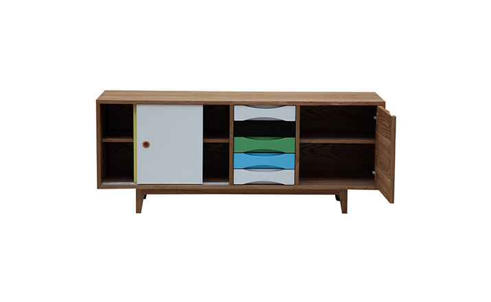 vodder sideboard(vodder餐具柜),Arne Vodder设计的作品,是Kardiel公司制作的经典实木家具,具有世纪中期的现代风格,加了少许复古现代主义色彩于其,微妙的局部拱曲线呈现在右手面对推拉门和5个拉出抽屉。在现代主义的存储家具上,Finn Juhl和Arne Vodder最先尝试胶木和天然木的组合运用。这是大胆的创新,他们结合传统的新鲜的新兴技术与现代主义的概念。制作采用精选MDF板基材胡桃木或水曲柳木皮贴面、胡桃实木或水曲柳实木脚架、环保油漆喷涂、做工精湛,是您理想的选择。