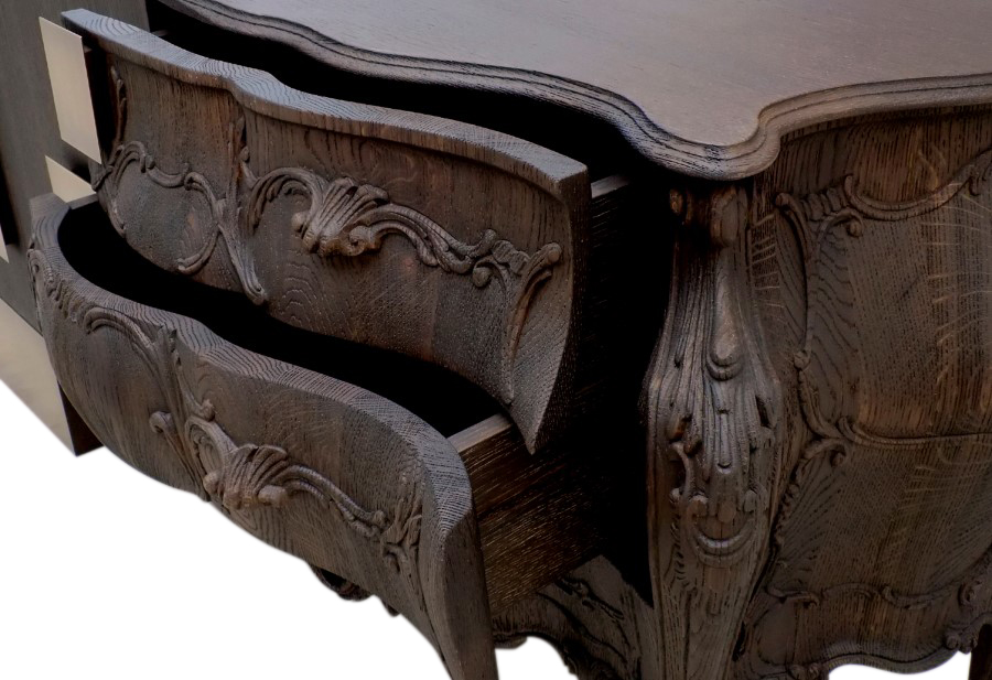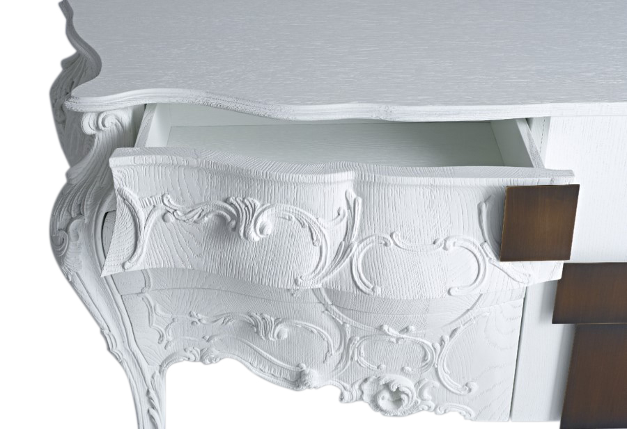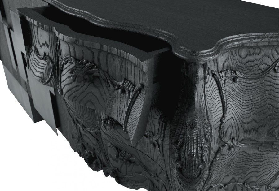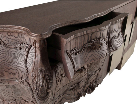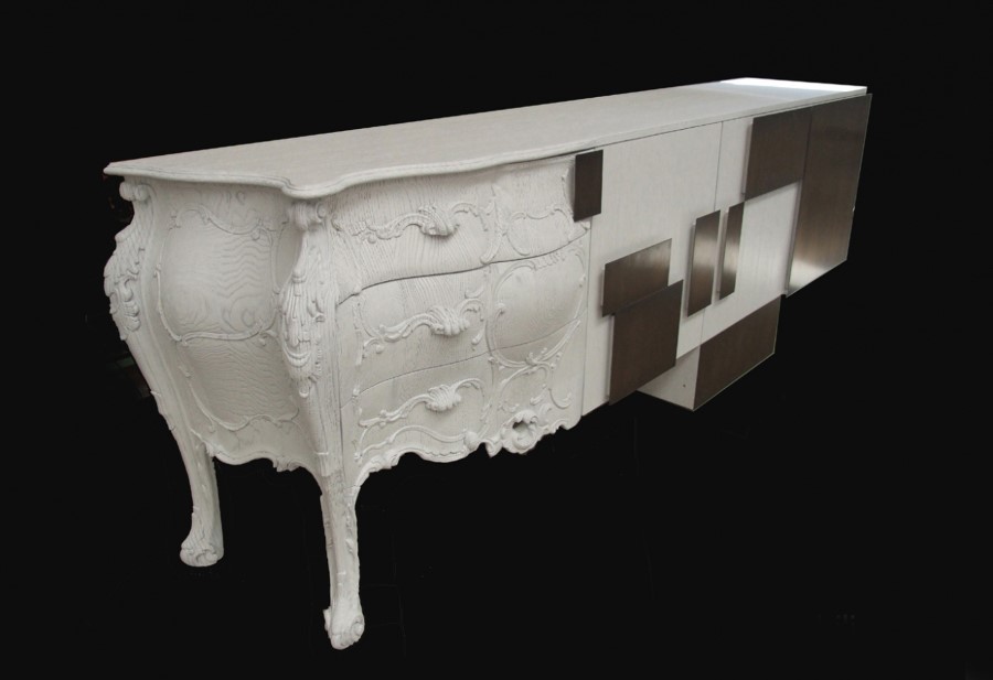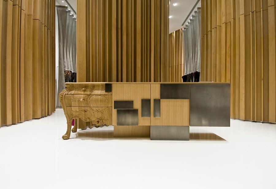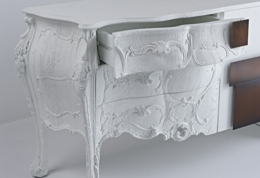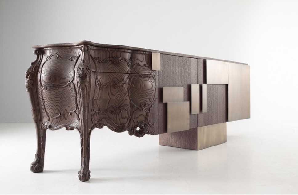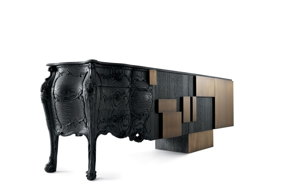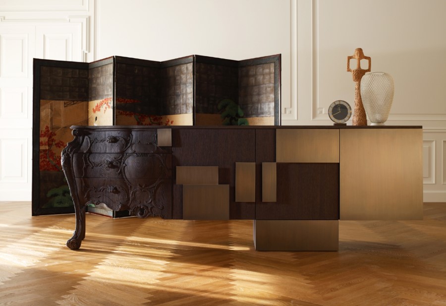 Italian Emmemobili launches the sideboard Evolution, combining old and new woodcraft. The classical side is in solid oak wood joint to the structure with doors in oak veneer. The whole sideboard has sandblasted wooden structure, handles in burnished brass and finishing in sanded oak