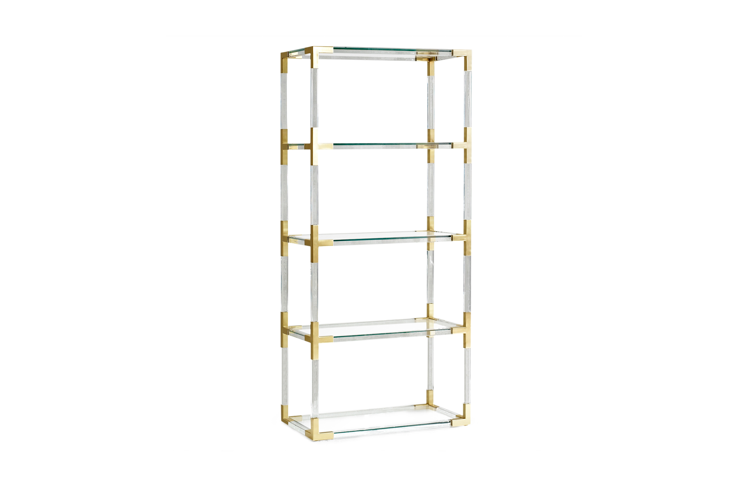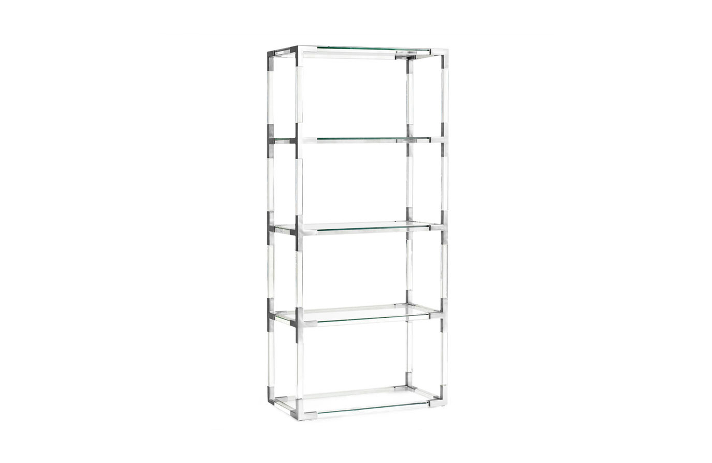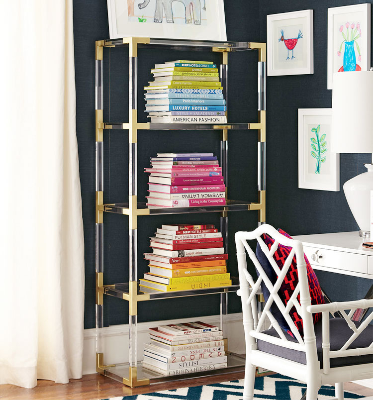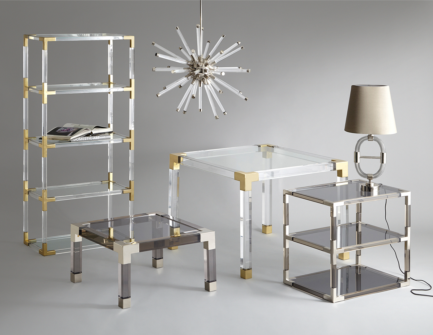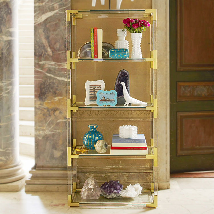 从luxe透明丙烯酸与拉丝黄铜或抛光镍口音,或穆迪烟丙烯酸与抛光镍装饰。为书籍或展示你最喜欢的作品而举行的聚会。